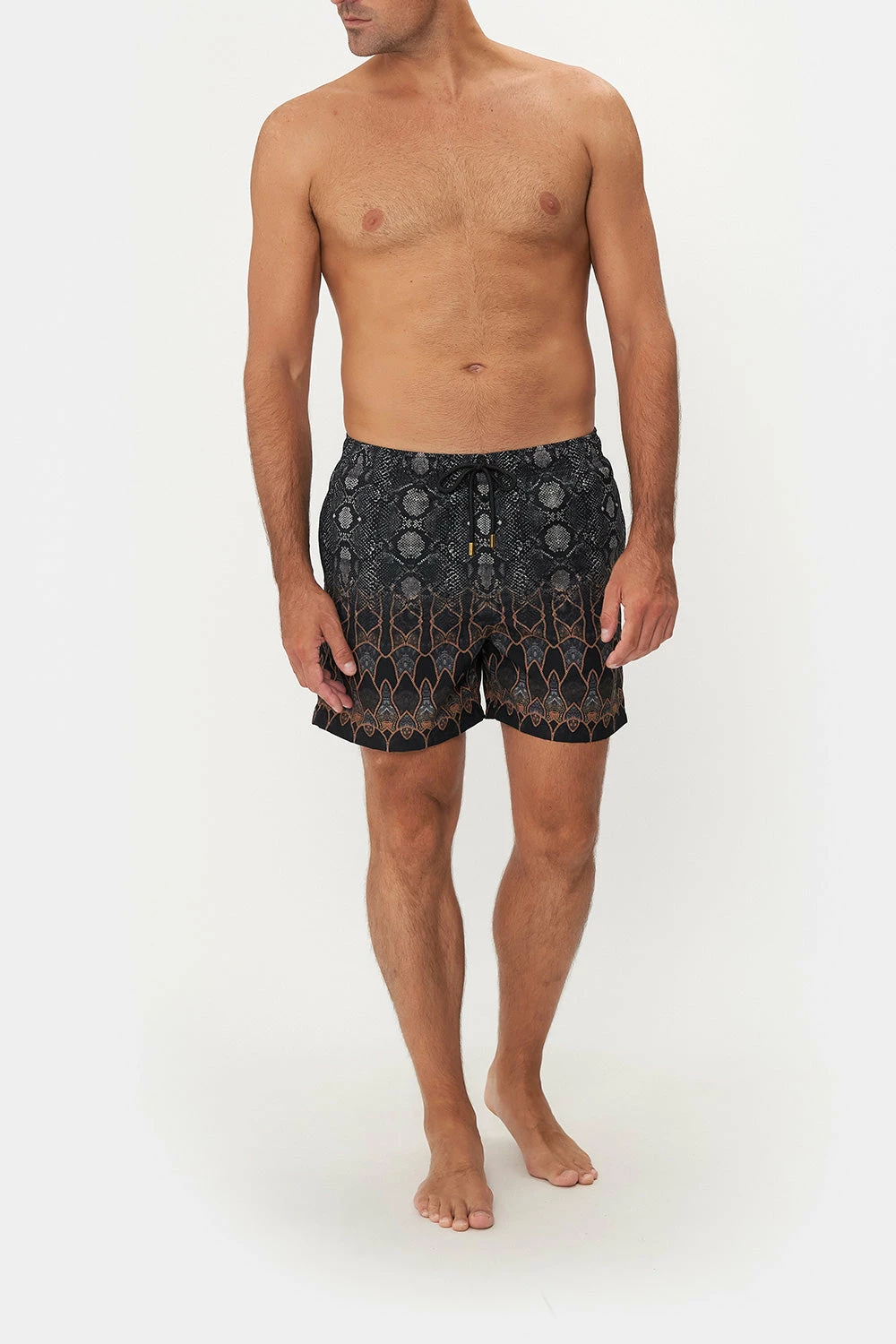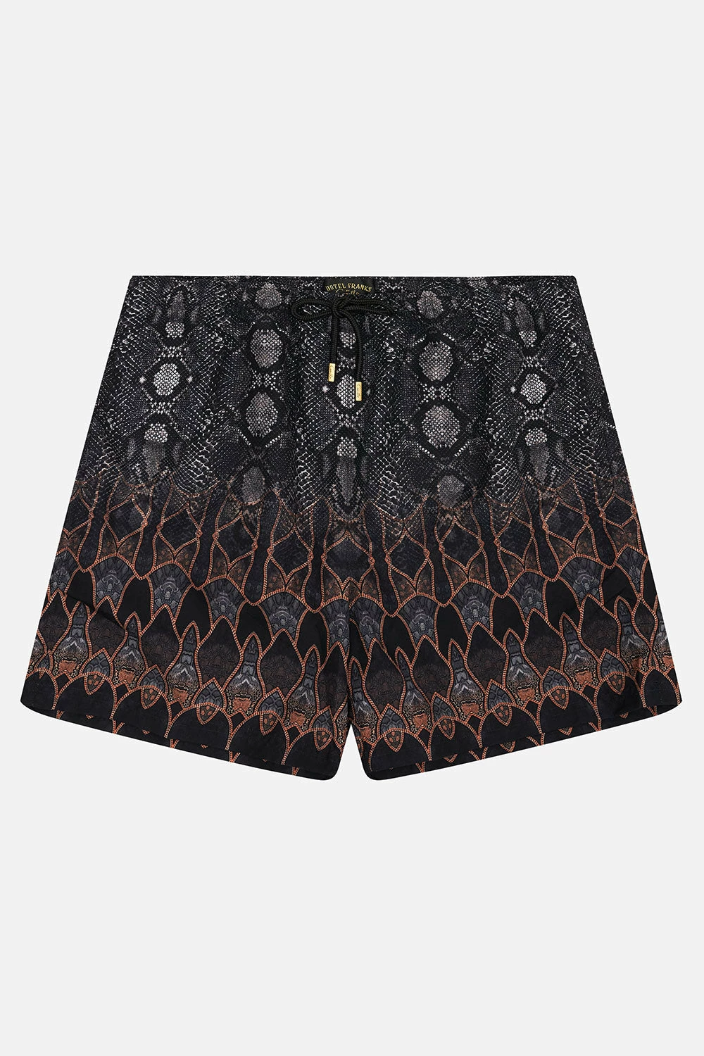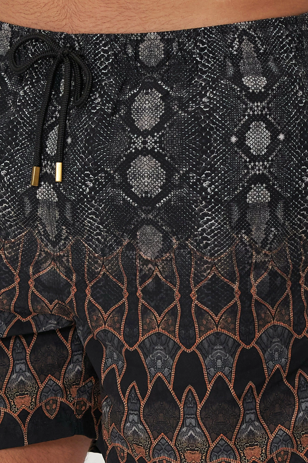 Paying homage to the decadence of Mother Earth, the Wild Horses Elastic Waist Boardshort is enwrapped in a deep shade of midnight adorning soft grey snake print, rich terracotta panelling and subtle geometric accents. Crafted from recycled polyester retrieved from our seas, this luxury boardshort features an elasticated drawstring waist, pocket details with a velcro fastening and a relaxed mid-length silhouette.