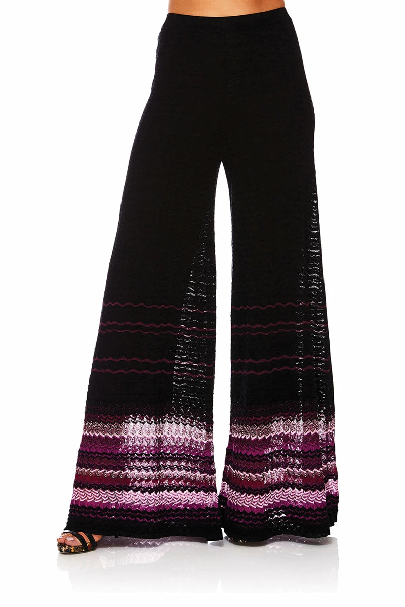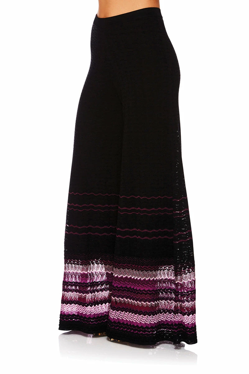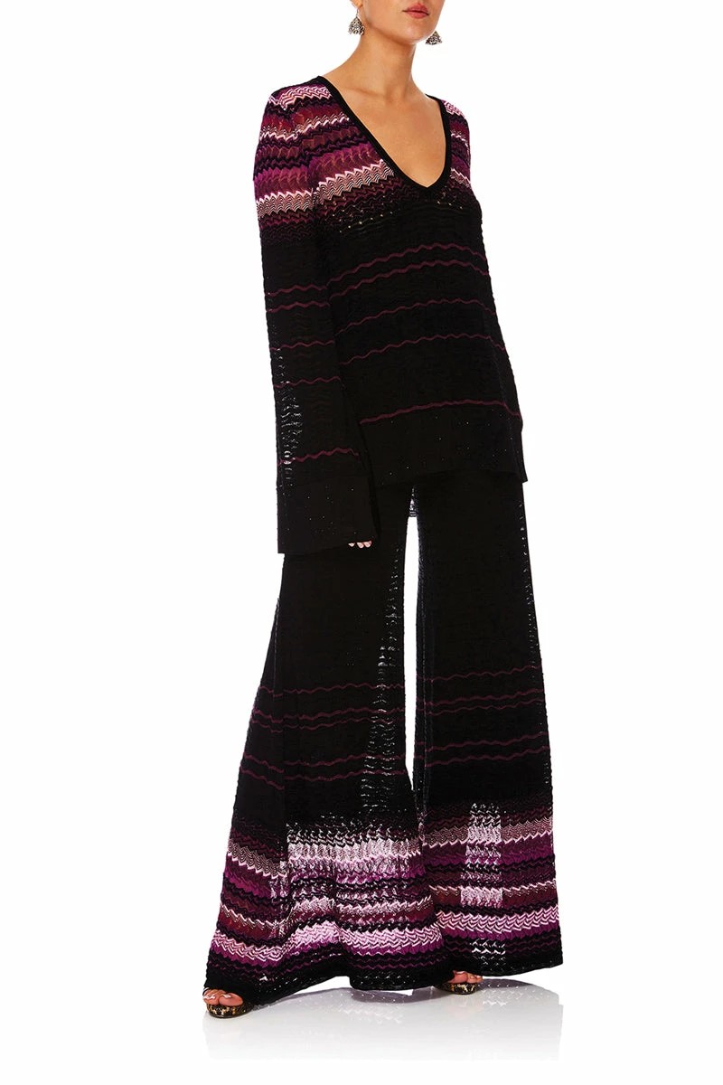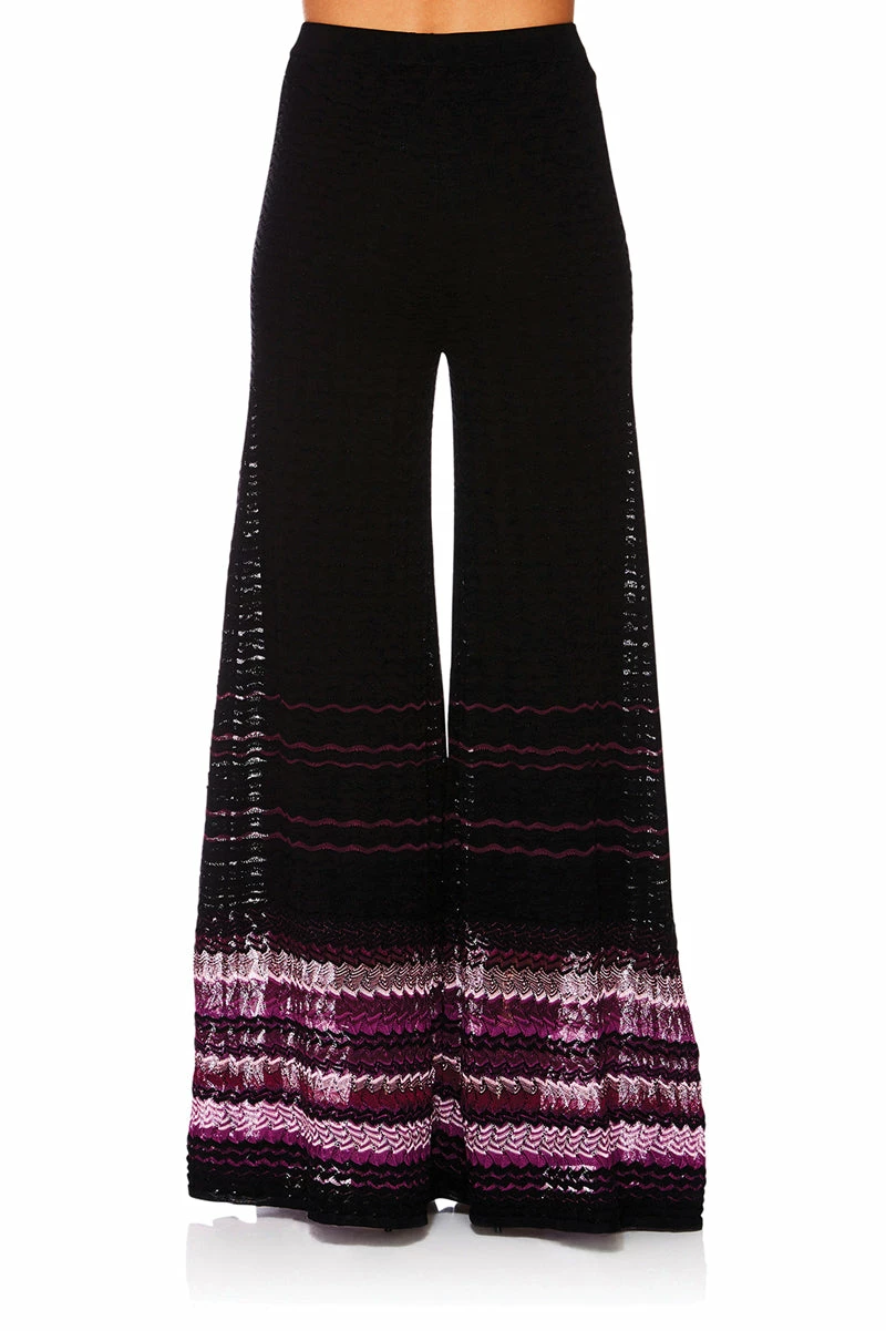 A tribute to divinely feminine rites of passage, the Nights With Her Fancy Stitch V Pant was inspired by the rich artisanal wonders of enchanting Japan. Knitted into a beautiful pointelle design with highlights of metallic thread, these luxurious wide leg trousers feature an elasticated waistband, flared silhouette and delicate crystal embellishment for a luminous finish.