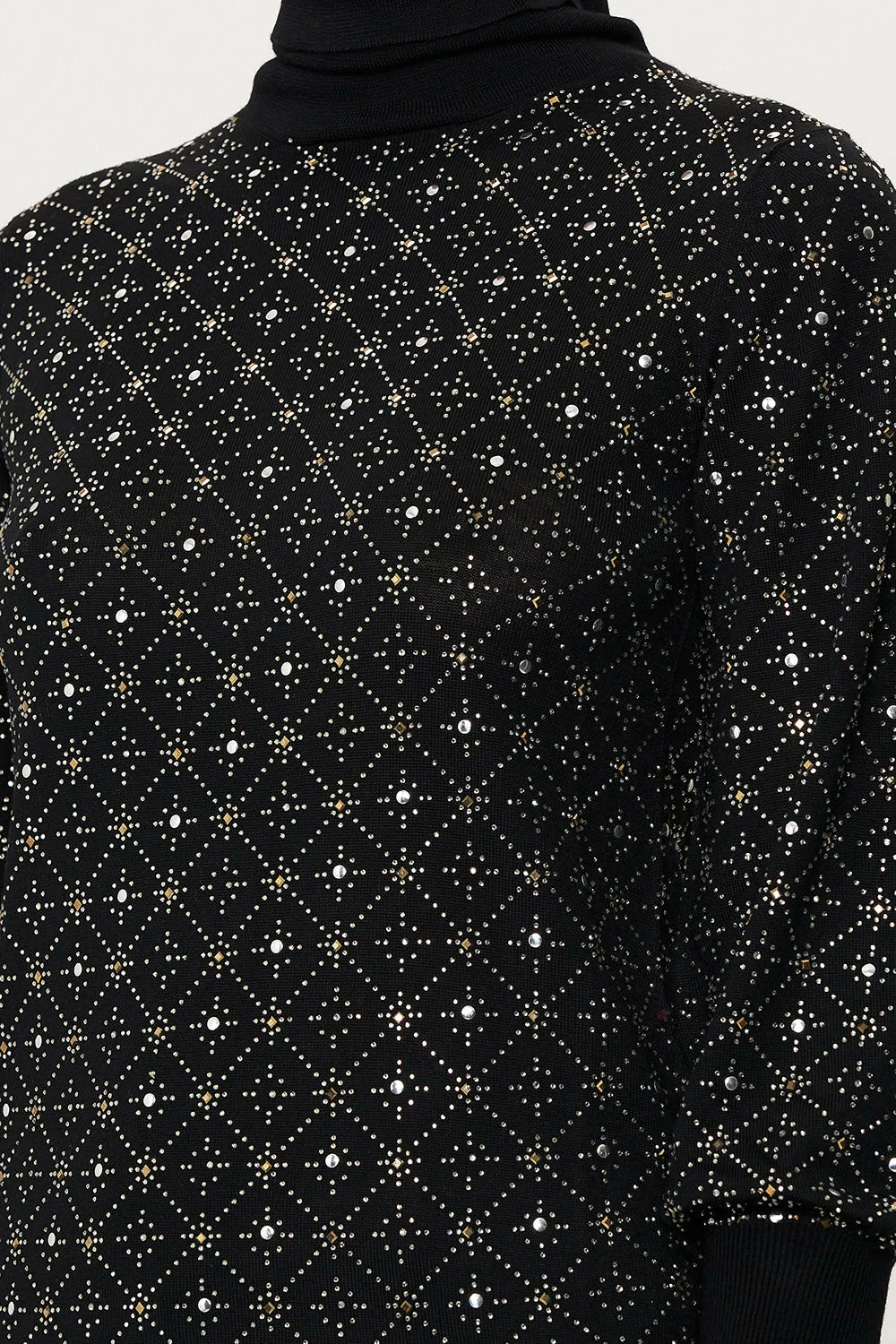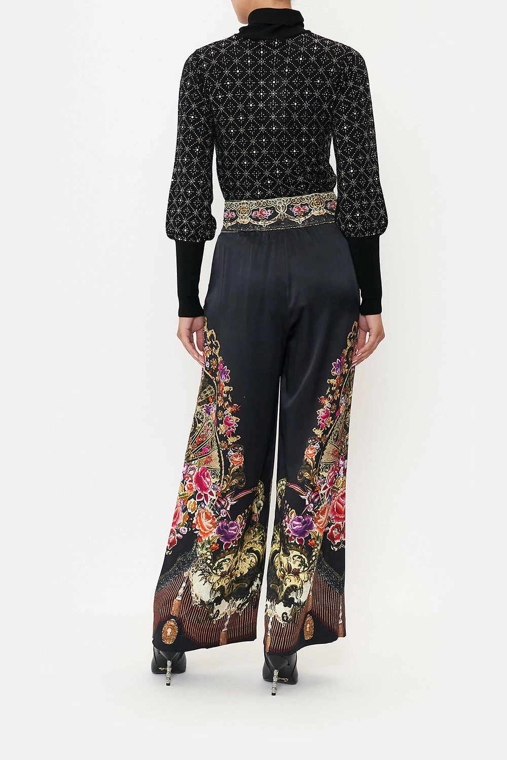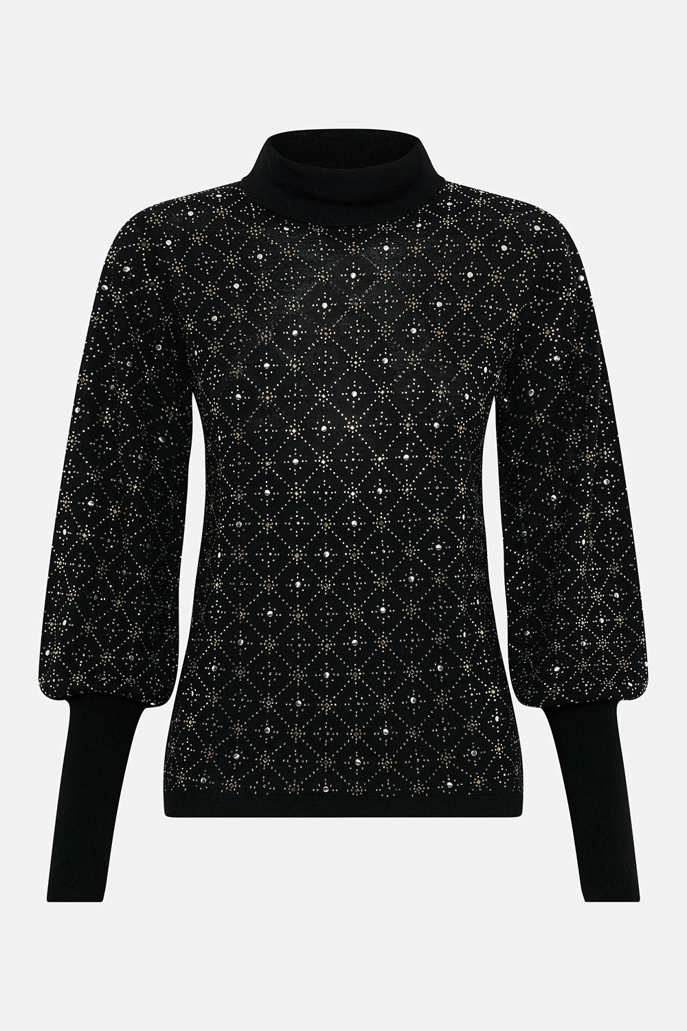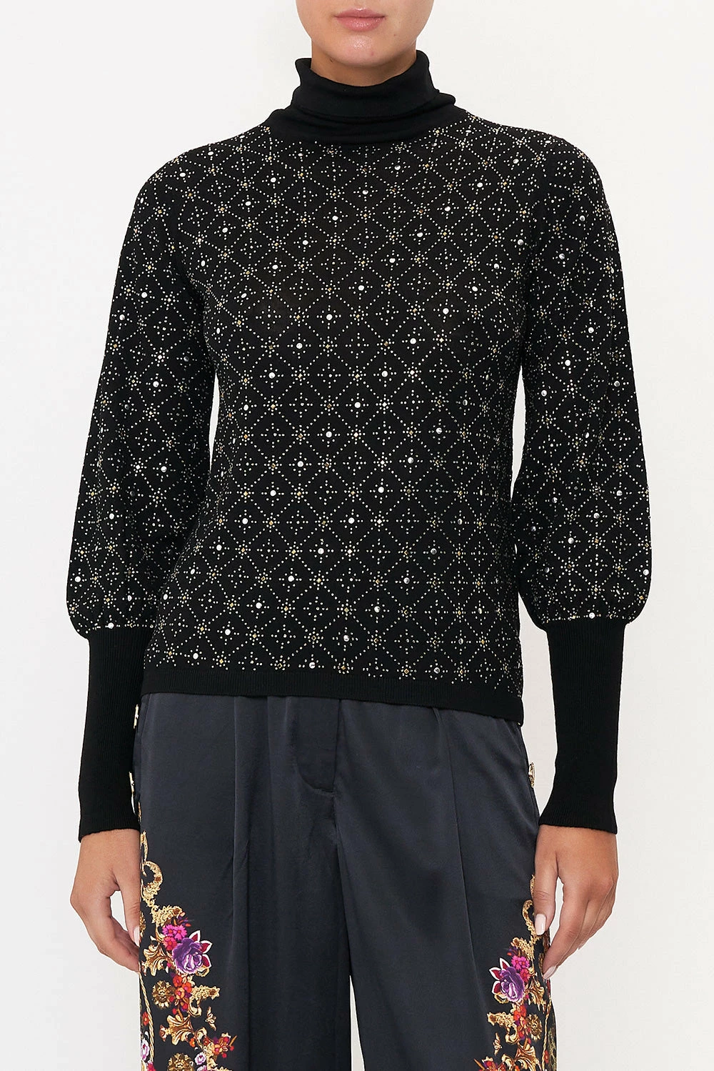 Spanish bohemia seeps into the realm of winter wear, the Dance With Duende Gathered Cuff Fitted Knit is encapsulated in midnight hues adorned in all-over gold and silver stud detailing. Complete with hand-embellished CAMILLA crystals, this luxury merino wool knit features a gathered blouson sleeve with a generous contrast cuff, a fitted bodice that hugs your waist and curves, a high neckline and a silhouette that falls effortlessly to the hip.