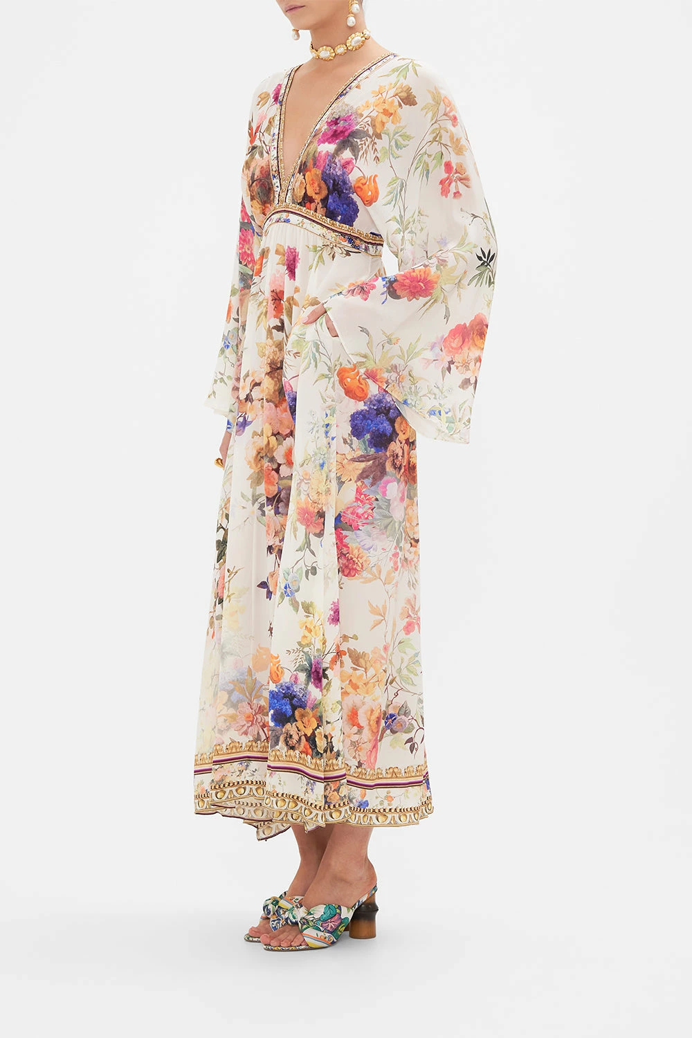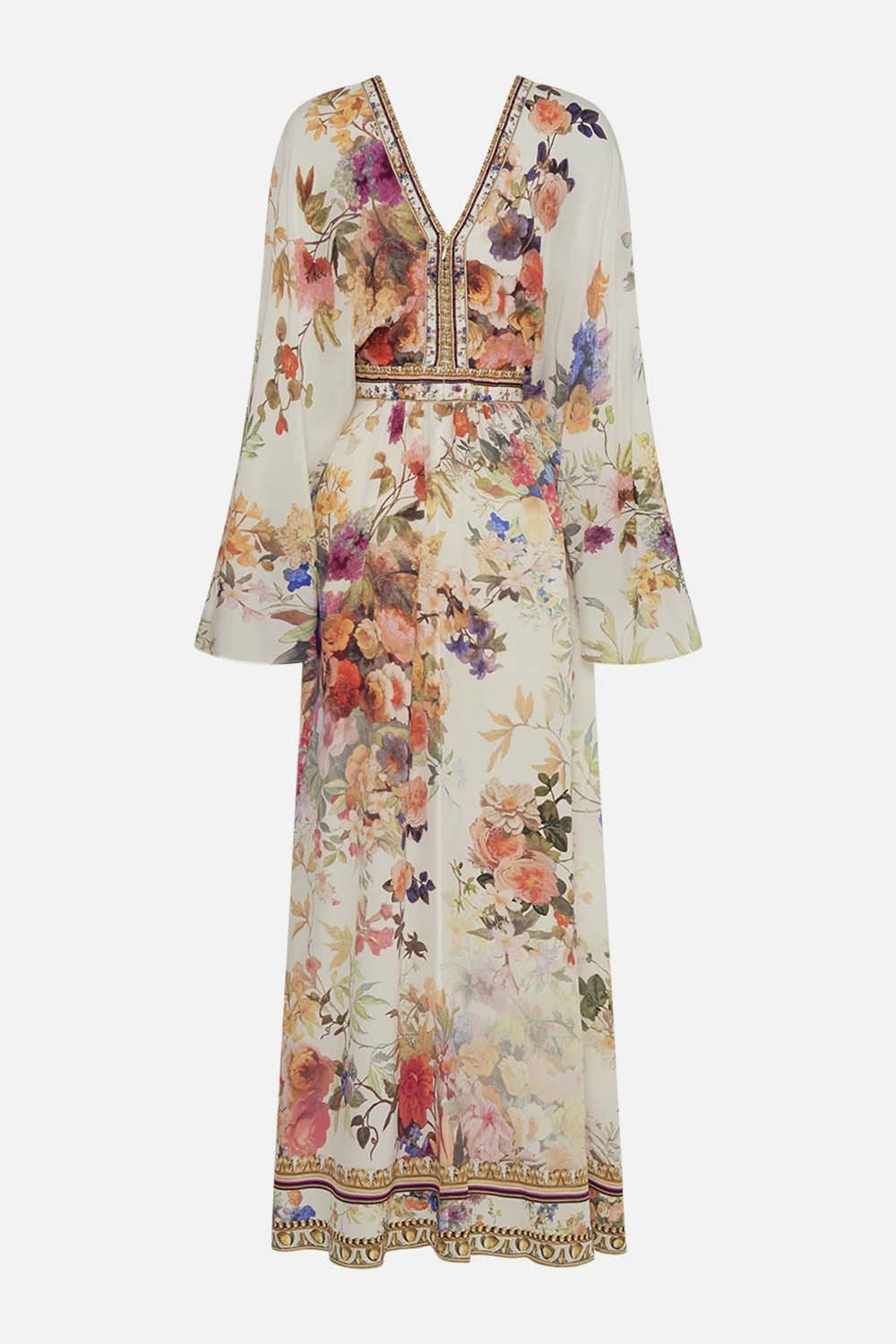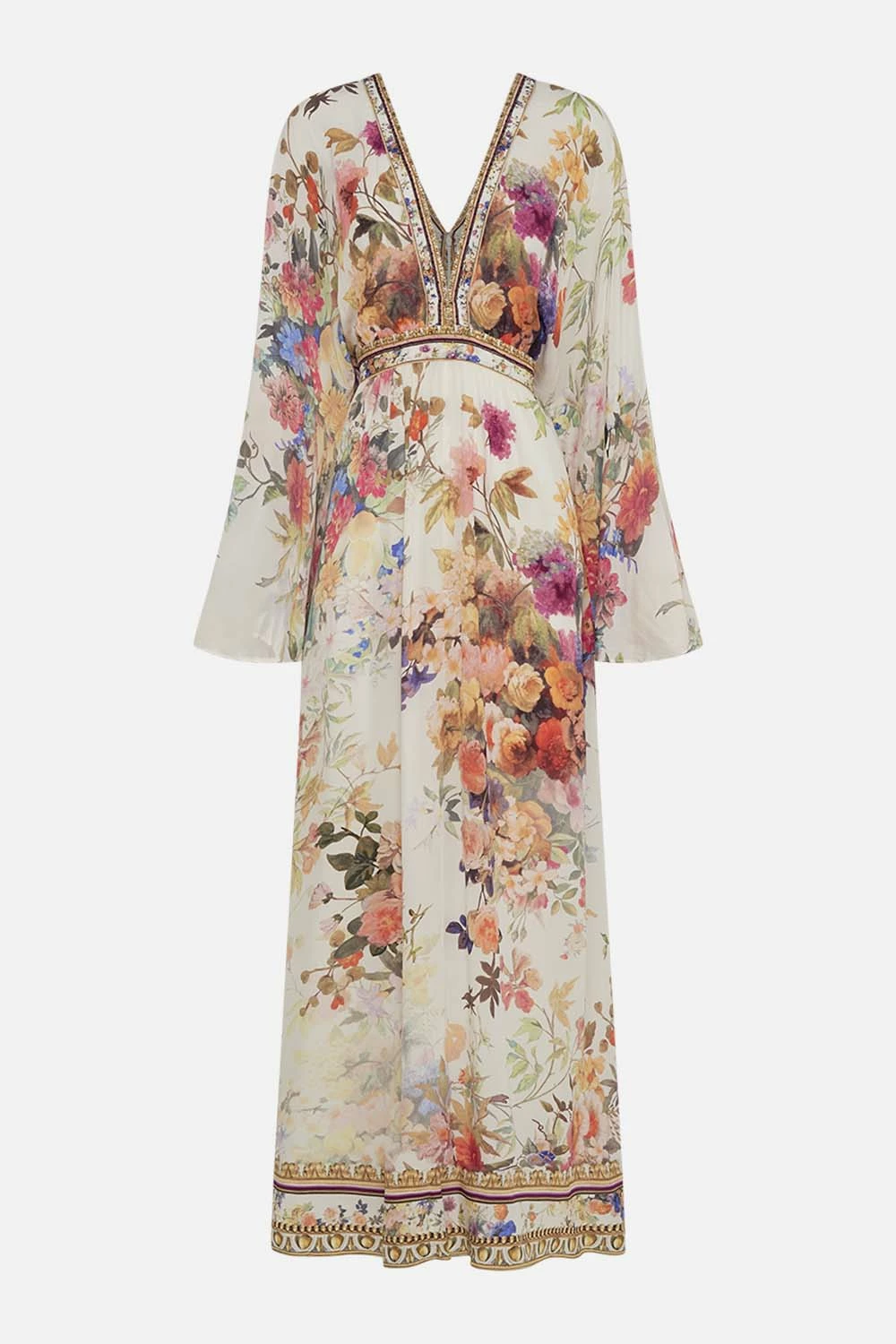 The Friends With Frescoes Gathered Kimono Dress captures the exquisite ambiance of the grand Hotel Villa Cora. Soft flowing curves guide us along opulent mosaics in a rich tapestry of pretty florals and baroque accents. Adorning CAMILLA crystals, this luxury silk dress is home to a relaxed maxi silhouette that dances at the ankle, a deep v neckline, a cinched waist with shirring panel at the back, and a statement kimono sleeve. An elegant sundress for resort wear or elevated for more sophisticated soirees. Lovingly handcrafted, designed in Australia. Explore more from the Amore Mio collection.