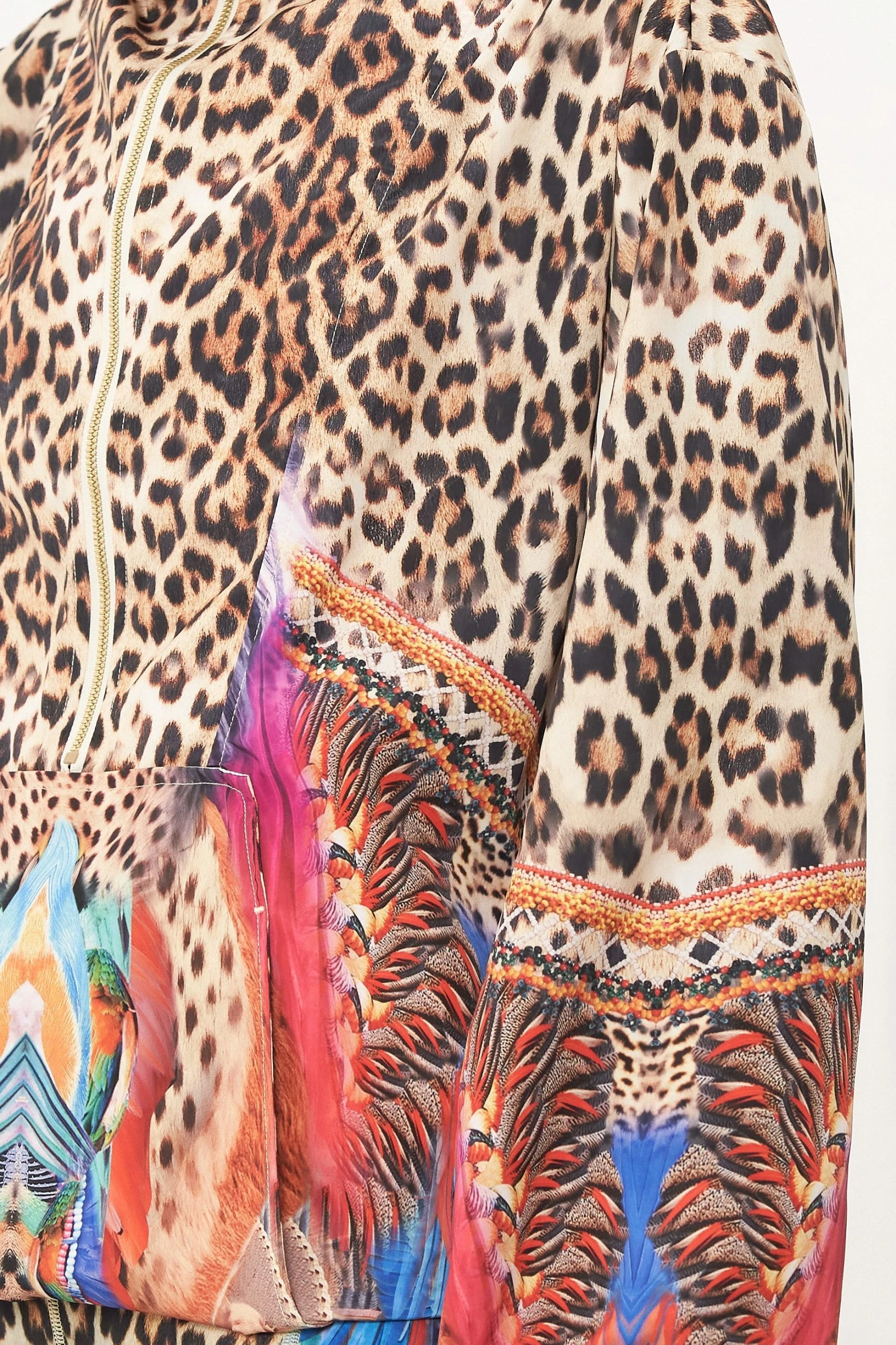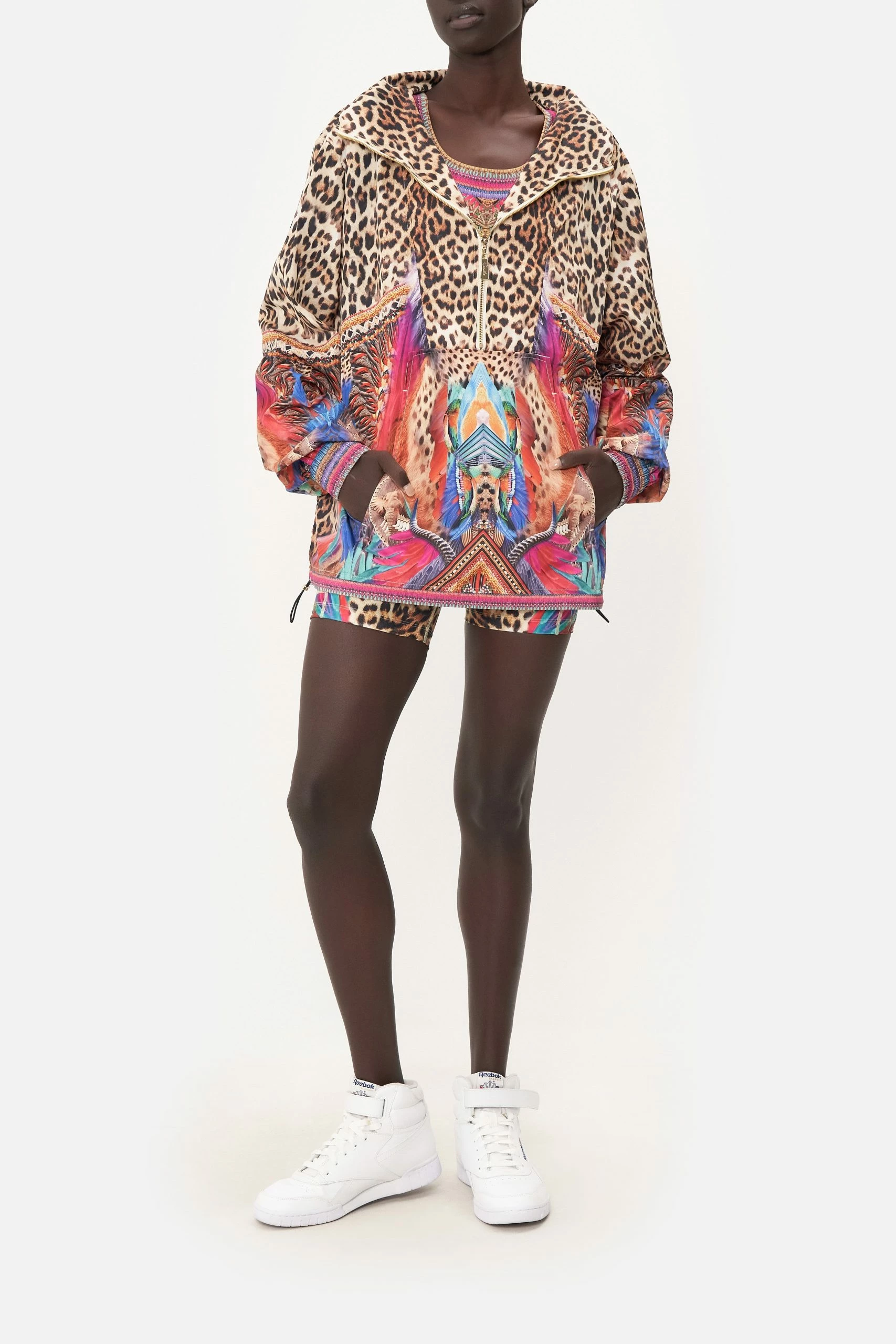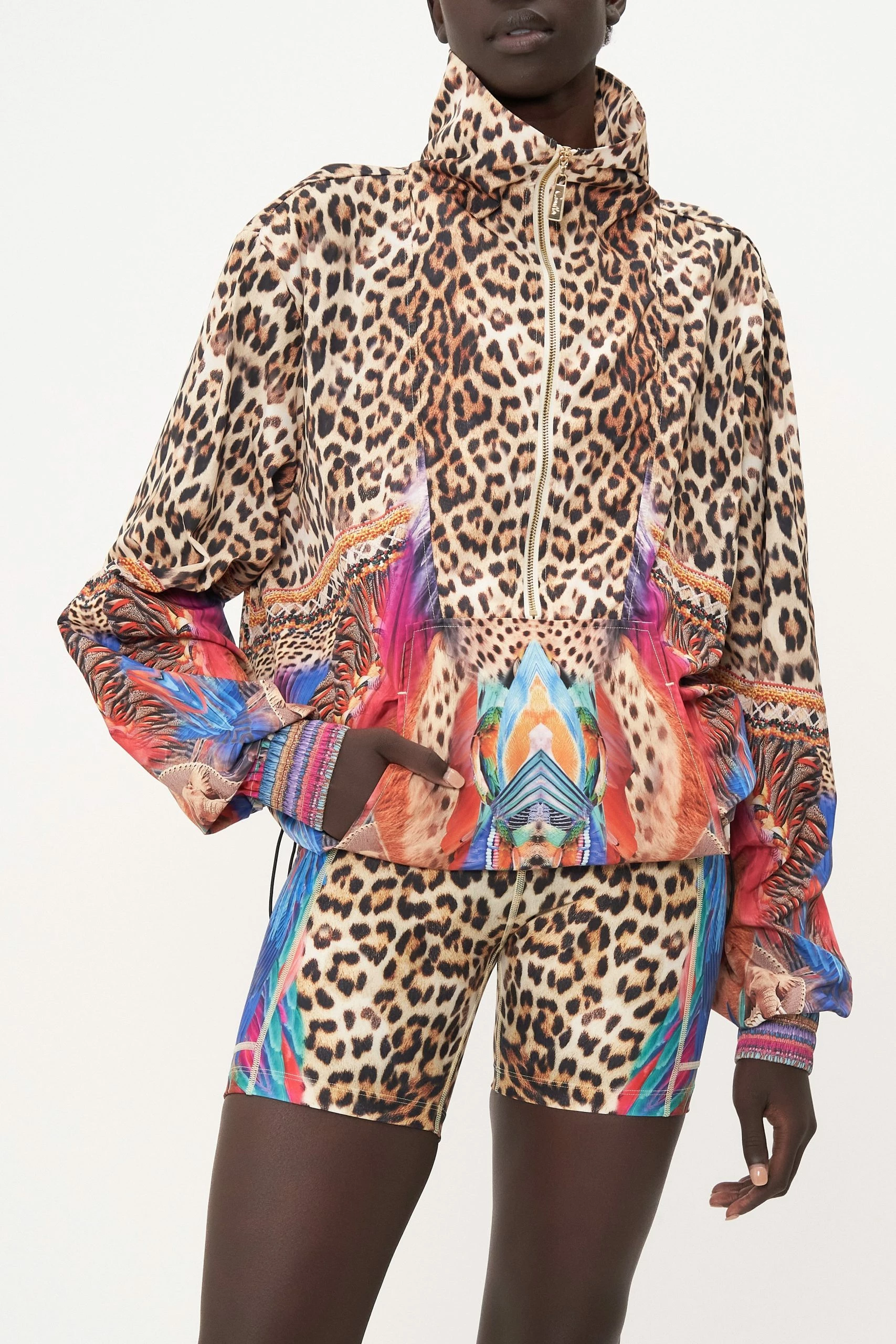 Winter wear meets wild odes dipped in all that is electric, the Kingdom Call Half Zip Windbreaker Pullover sports a classic animal print defined by electric featherings in shades of raspberry, aqua and lilac. Crafted with waterproof technology and hand-embellished crystals, this luxury windbreaker plays host to gold zip front fastening, pocket functionality, a drawcord hemline and a relaxed silhouette with elasticated sleeves.