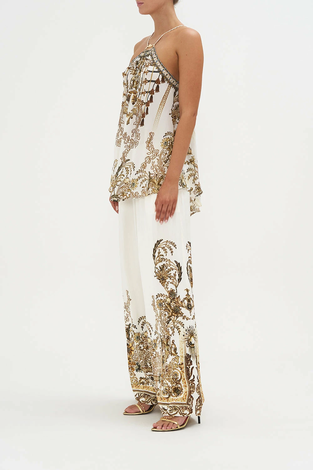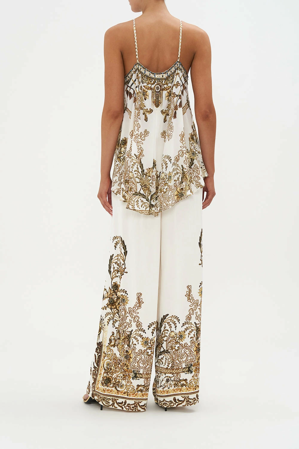The Road To Richesse Halter Top With Hardware explores a mesmorising sea of ivory white hues finished with ornate golden swirls that dance alongside decadent botanical details and exquisite chain cascades. Crafted from signature CAMILLA silk, this luxury cami is home to golden hardware, a gathered neckline, hand-embellished crystals and a relaxed silhouette made perfect for French tucks.