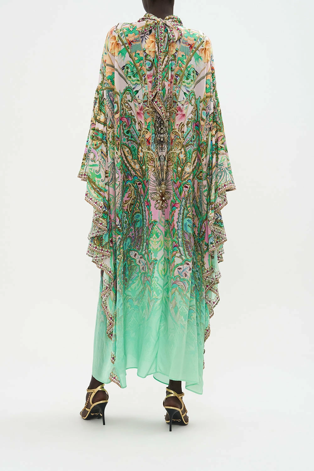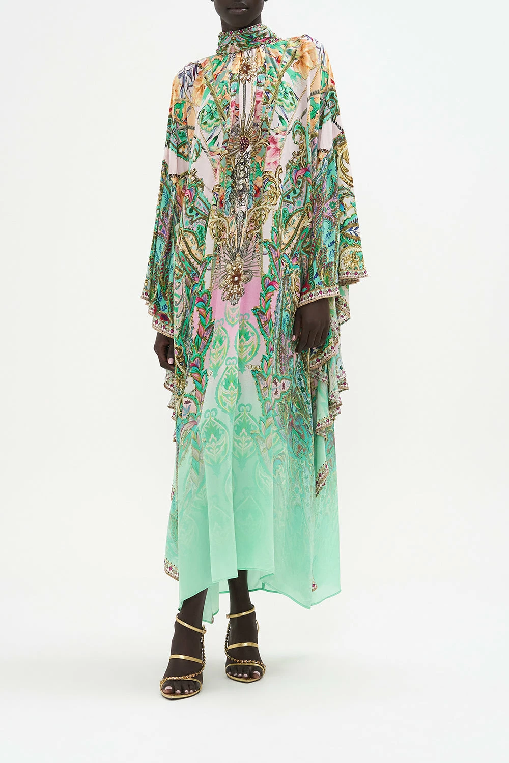 The Lost City High Neck Ruffle Kaftan enwraps our gaze with a kaleidoscope of minty greens and gentle pinks as baroque details dipped in gold intertwine with paisley patterns. Created to be a statement piece that takes from glamorous days to evening soirees, this luxurious silk kaftan is home to an elegant back neck cut out detail, frivolously fun ruffle sleeves, a gathered collar detail that falls into a relaxed fit silhouette, and finished with signature CAMILLA hand-embellished crystals.