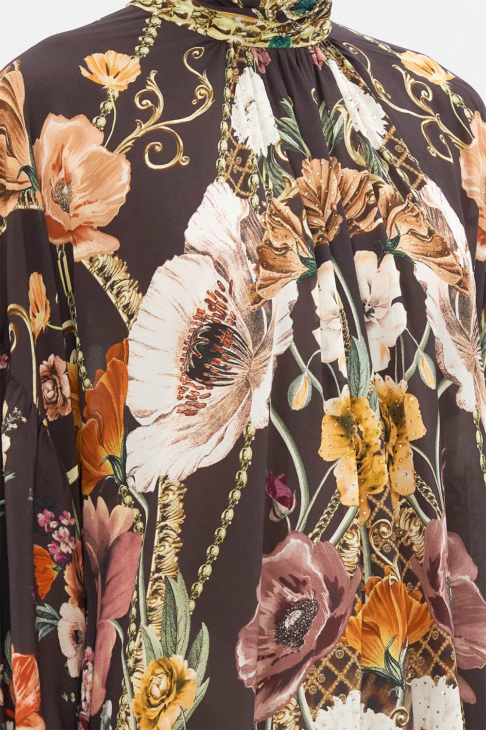 The Wave Your Wand High Neck Ruffle Kaftan wanders through a flurry of wild leopard print and feminine florals. A magical world delicately framed in regal gold baroque details that glimmer against a decadently rich deep chocolate background. Created to be a statement piece that takes from glamorous days to evening soirees, this luxurious silk kaftan is home to an elegant back neck cut out detail, frivolously fun ruffle sleeves, a gathered collar detail that falls into a relaxed fit silhouette, and finished with signature CAMILLA hand-embellished crystals. Lovingly handcrafted and designed in Australia, explore more from The Moral Of The Story: Act II collection.