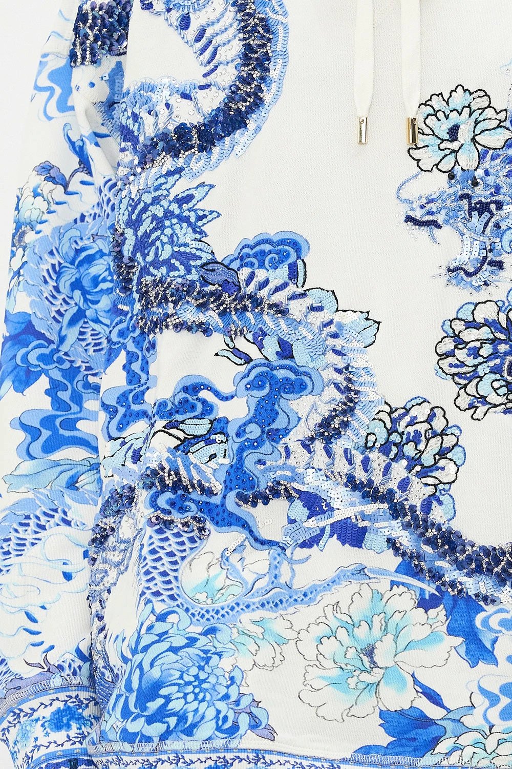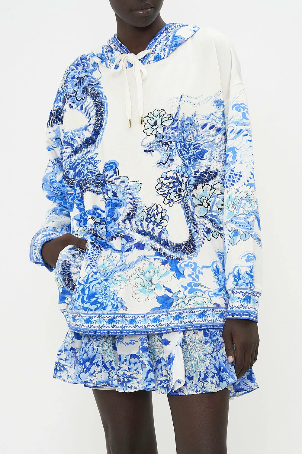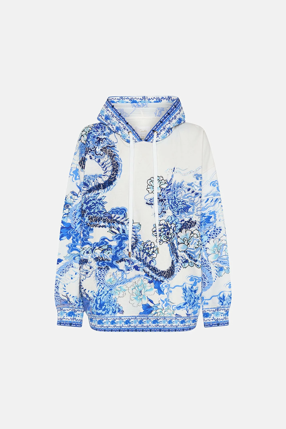 The Heart Of A Dragon Hoody With Pockets steals the gaze with a sea of royal blue hues complete with blooming botanica, moments of utter vibrancy and the majesty of dragon dreamscapes. Crafted from breathable cotton, this luxury hoodie is home to silk lining within the hood and pockets, an oversized silhouette, ribbed details, drawstring adjustability that meets tassel accents and hand-embellished CAMILLA crystals.