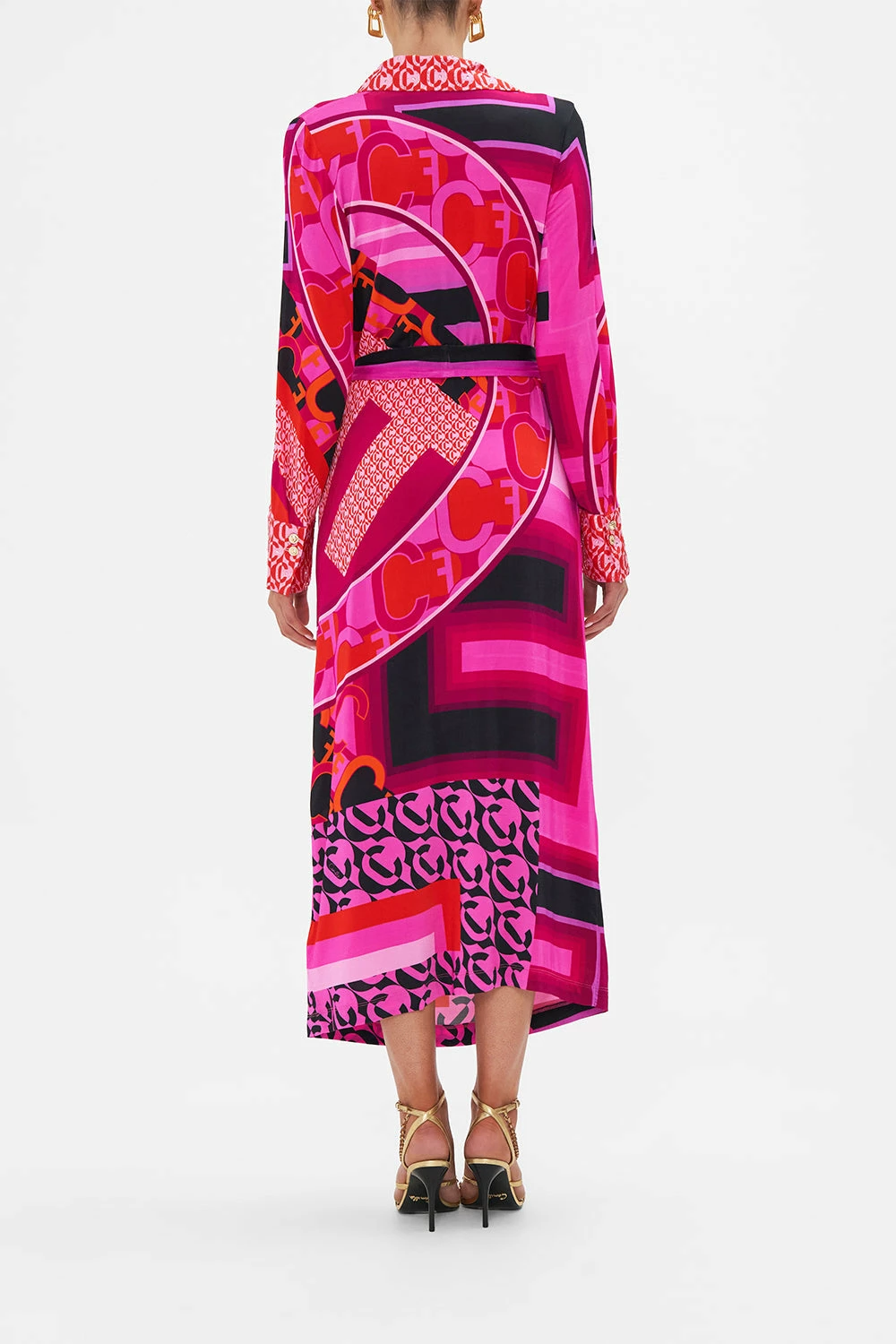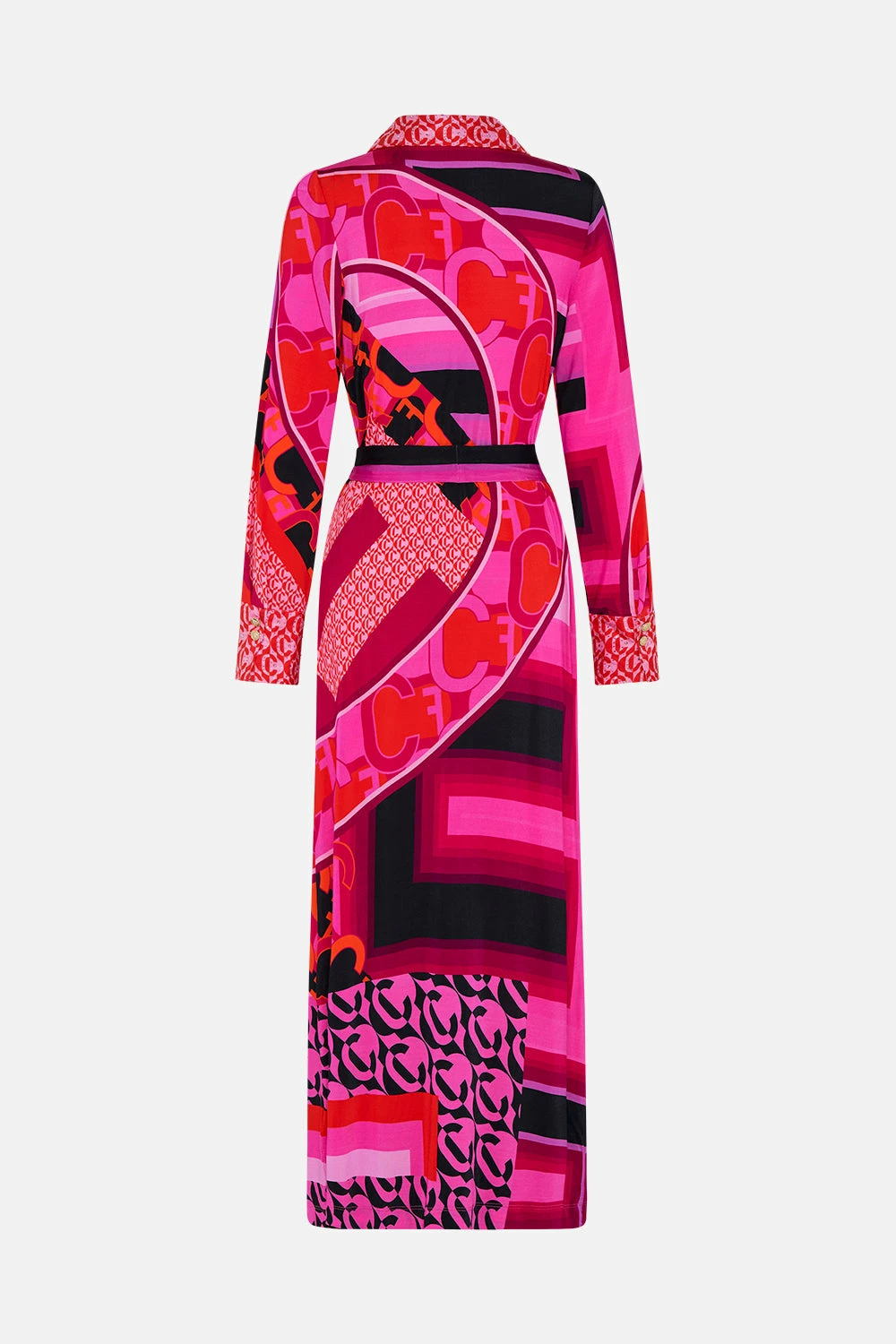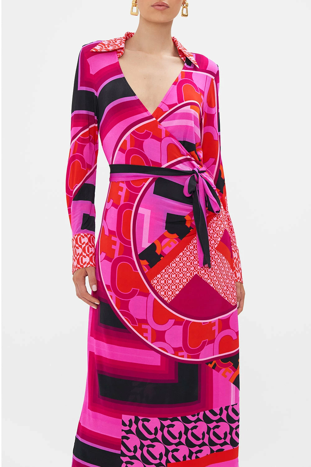 The Ciao Palazzo Jersey Collared Dress explores the soft curves lined with monogrammed moments paying homage to vintage Italian scarf motifs. An elegant printed jersey wrap dress adorned with silk collar and wide silk cuffs, deep V neckline, a tie feature at the waistline and a sleek midi length hemline. Finished with CAMILLA crystals. A slightly relaxed tailored fit with an effortless faux wrap detail makes this an elevated evening dress. Lovingly handcrafted, designed in Australia. Explore more from the Amore Mio collection.