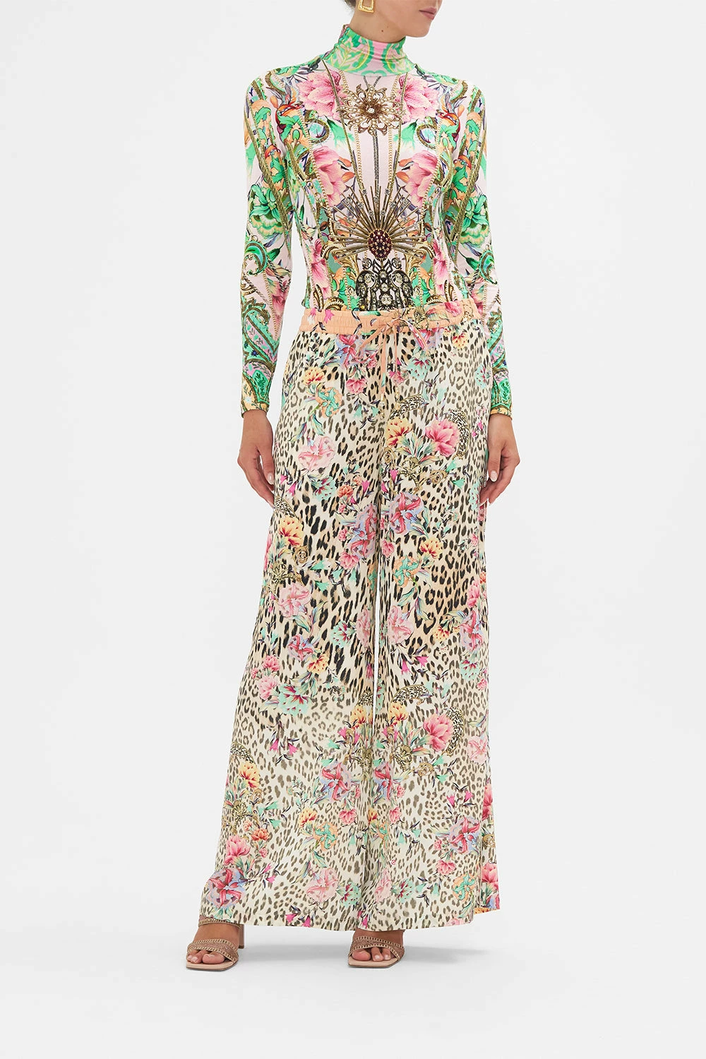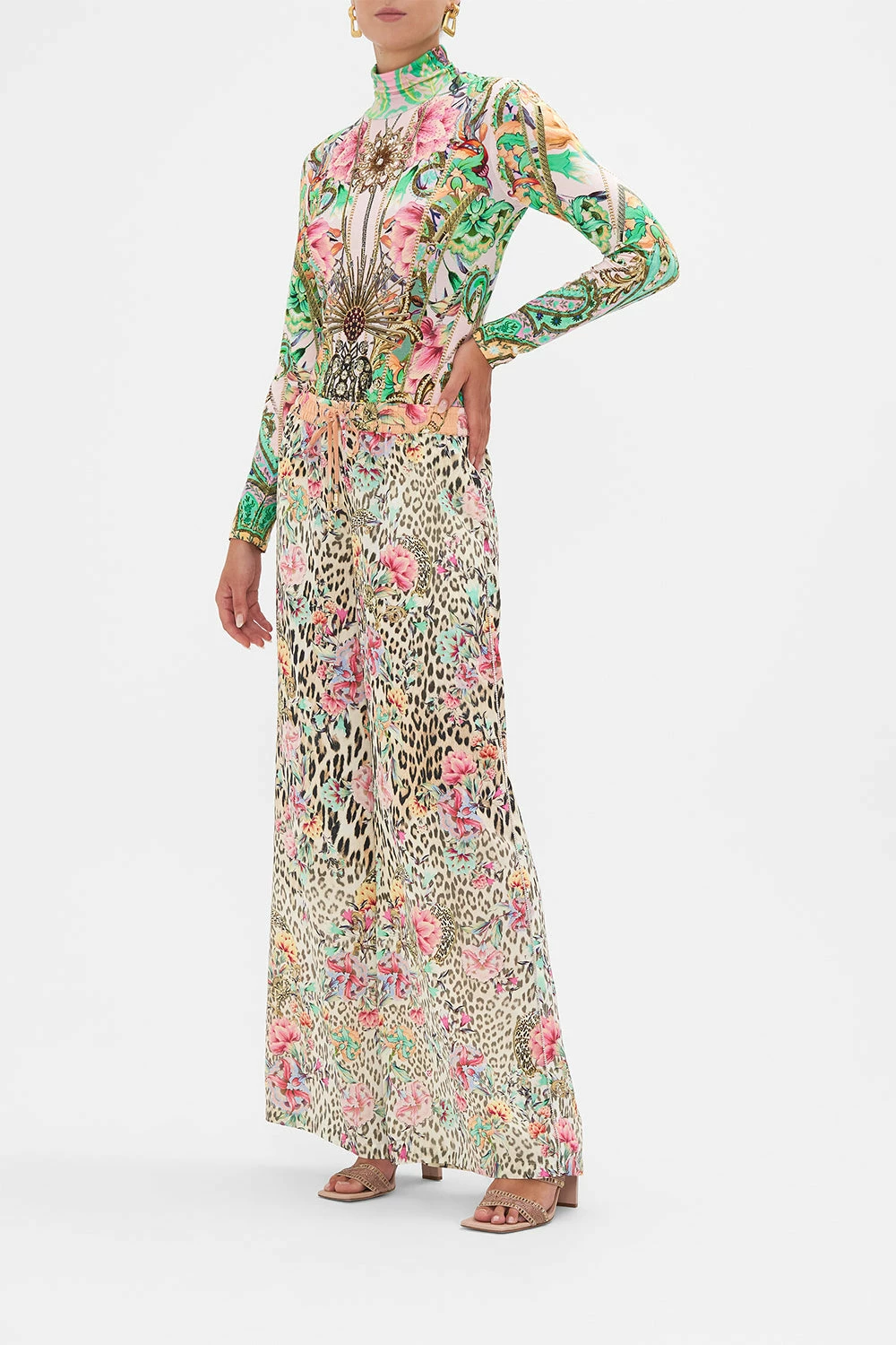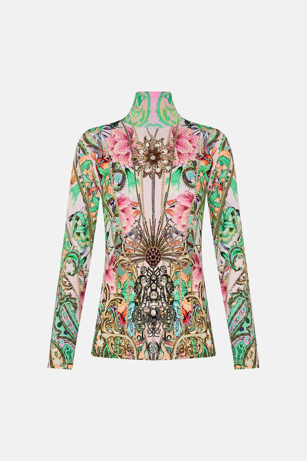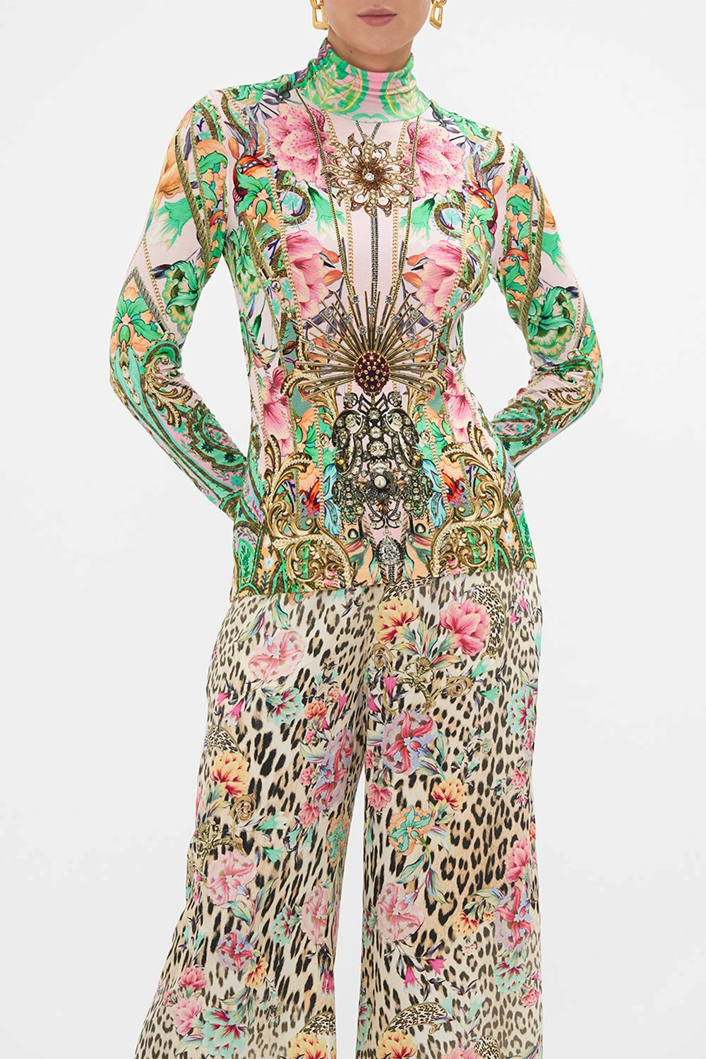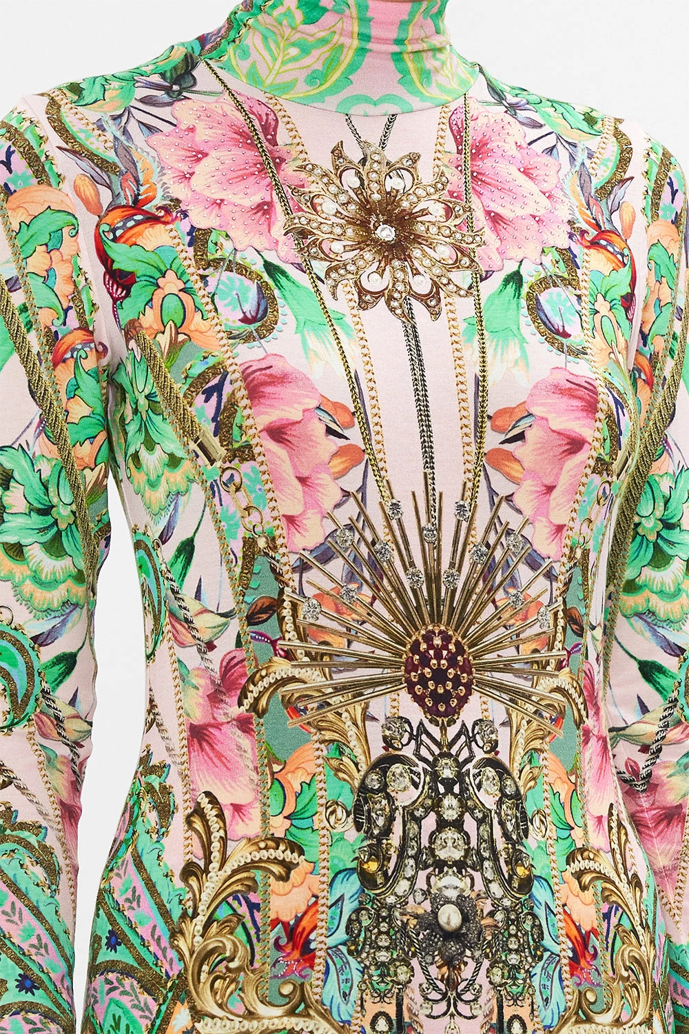 The Lost City Jersey Turtleneck enwraps our gaze with a kaleidoscope of minty greens and gentle pinks as baroque details dipped in gold intertwine with paisley patterns. Adorning hand-embellished CAMILLA crystals, this luxury turtleneck is home to full sleeves, a fitted bodice that hugs your waist and curves, a high neckline and a silhouette that falls effortlessly to the hip.