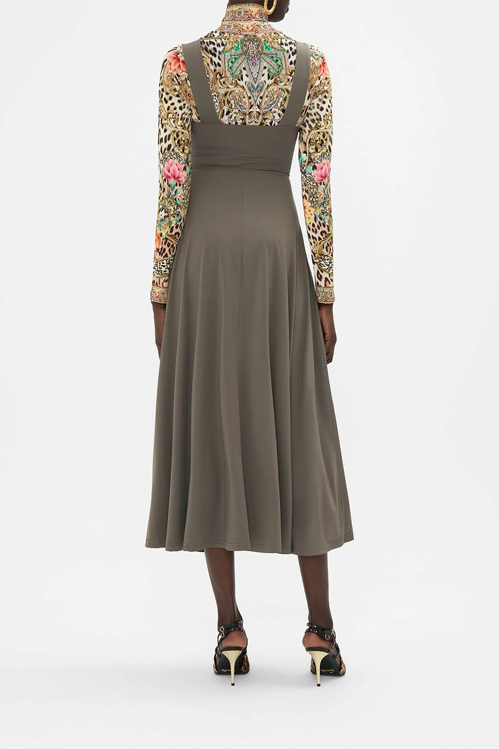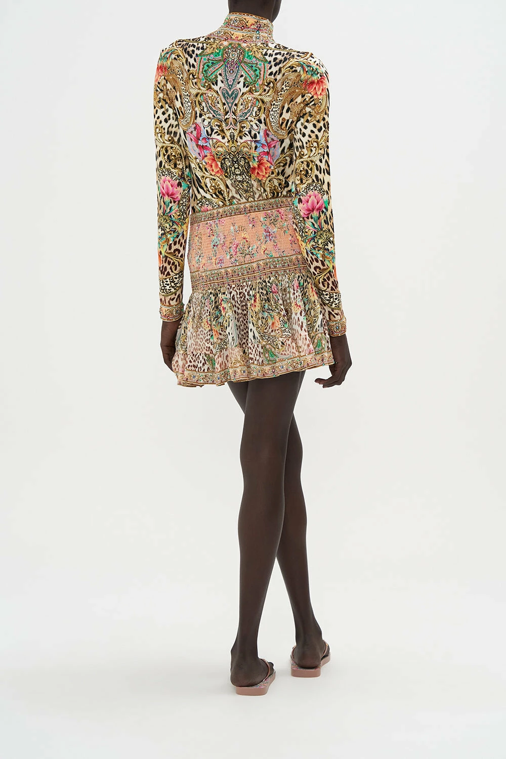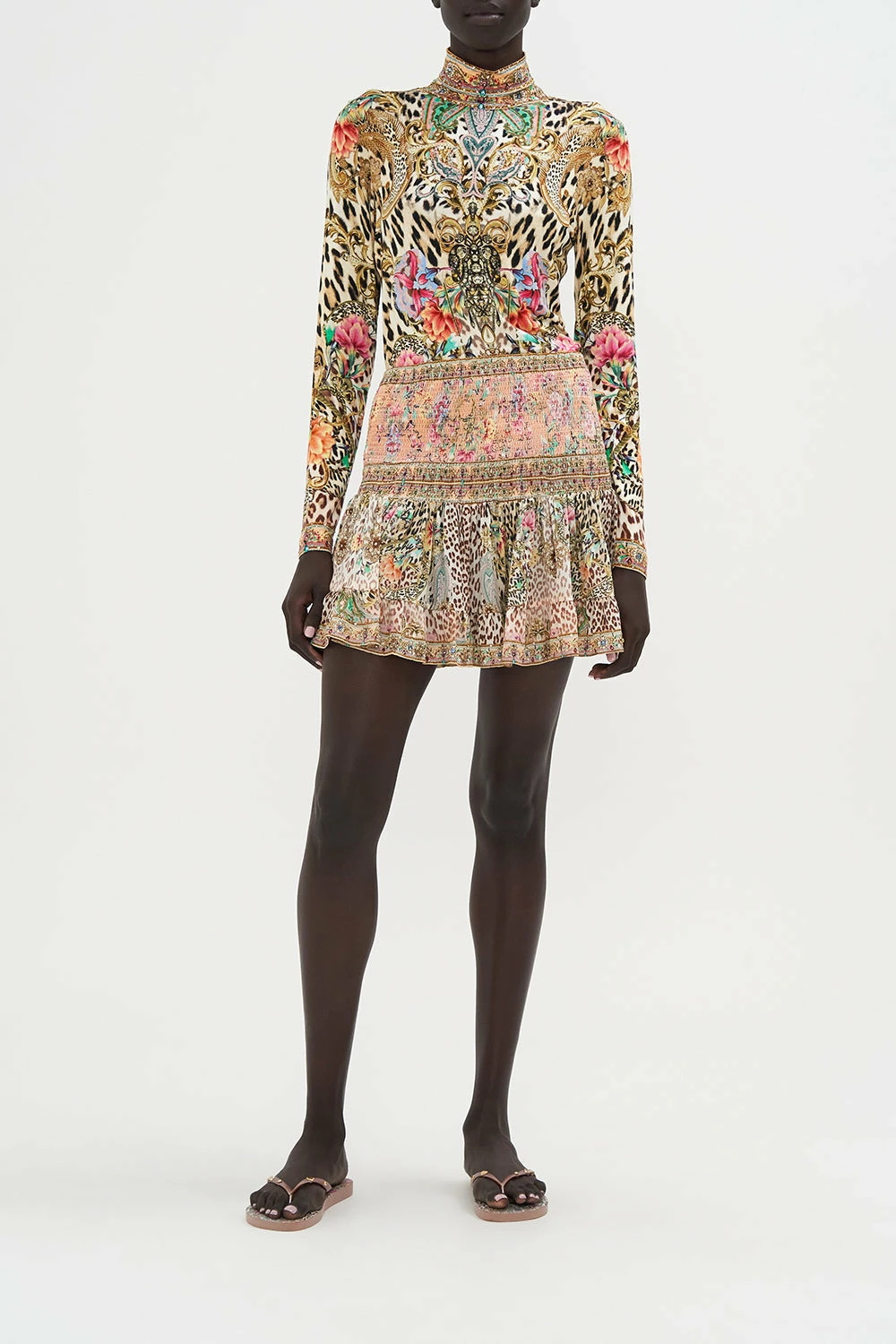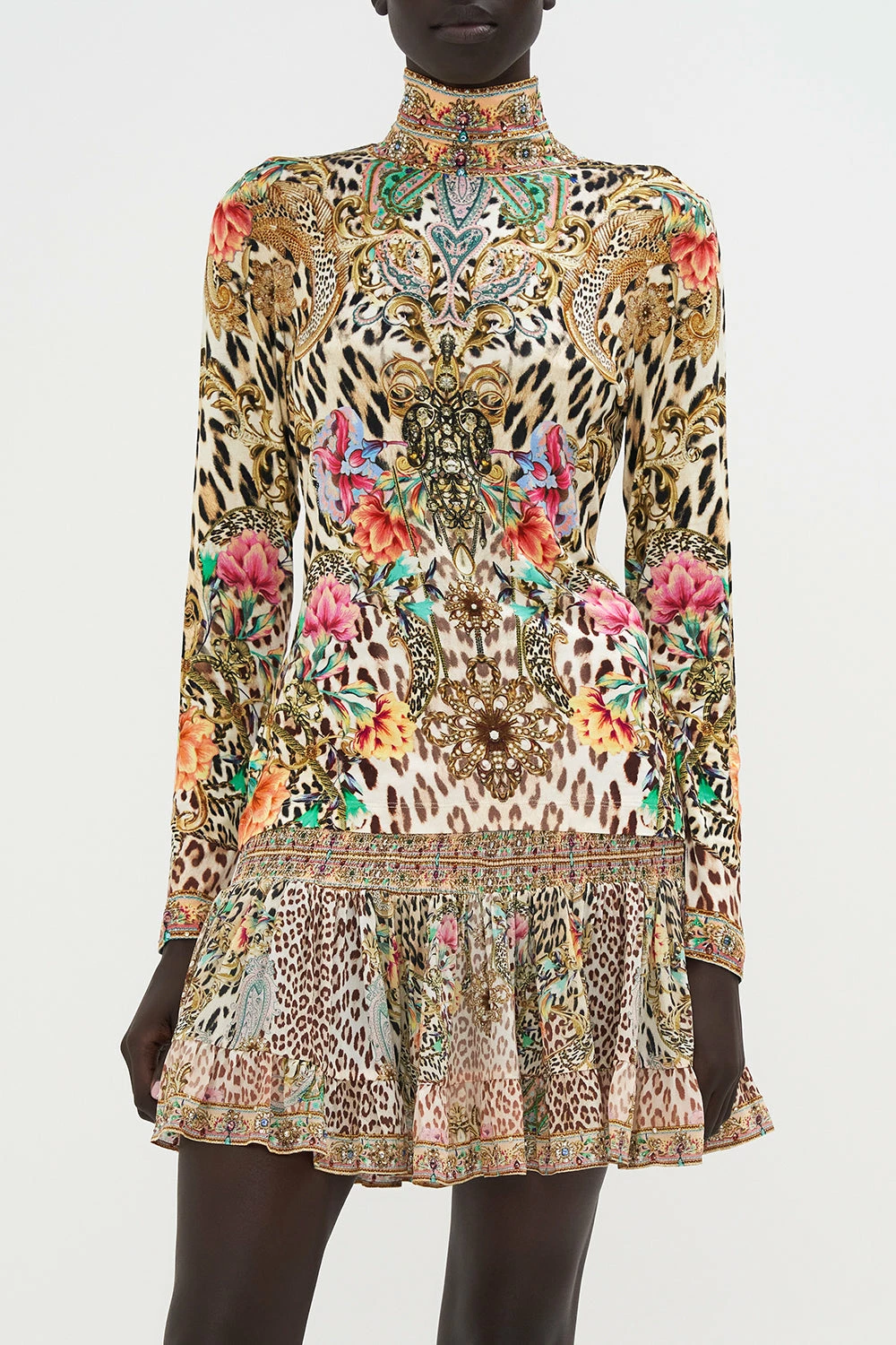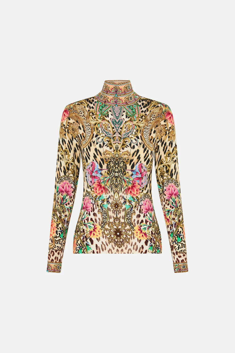 The Queen Atlantis Jersey Turtleneck brings back a classic with timeless leopard print finished with petals dipped in blush hues, roped accents and gold baroque detailing. Adorning hand-embellished CAMILLA crystals, this luxury turtleneck features a full sleeve, a fitted bodice that hugs your waist and curves, a high neckline and a silhouette that falls effortlessly to the hip.