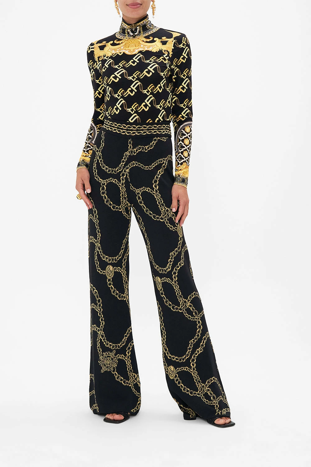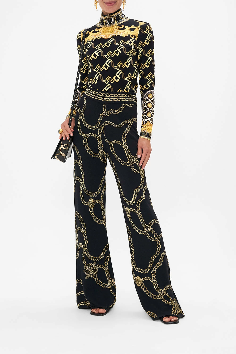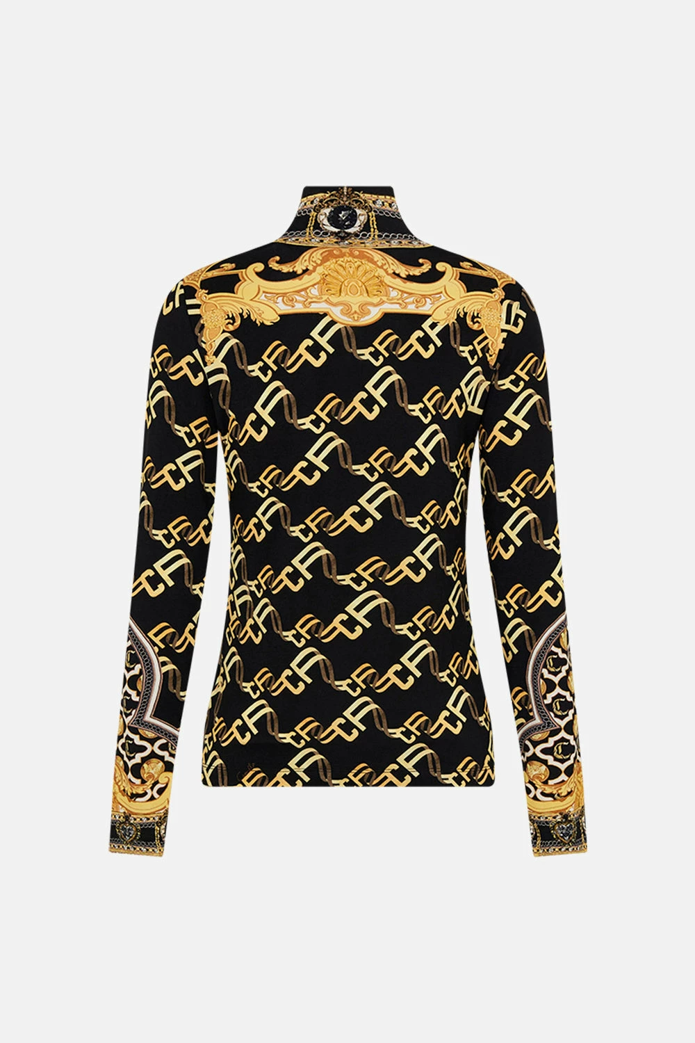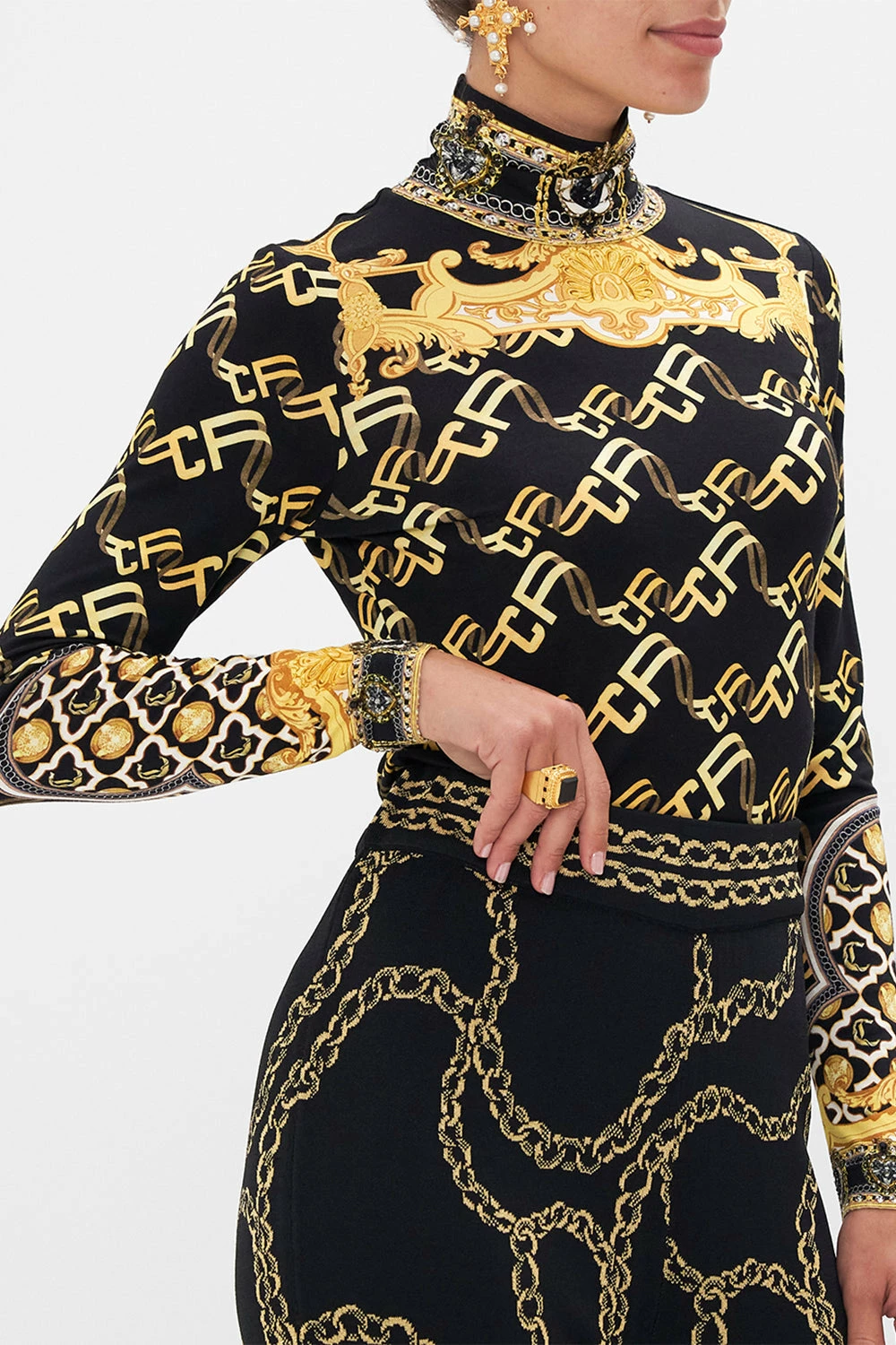 The Tether Me Not Jersey Turtleneck is an immersion into a elaborately opulent world of sleek palatial curves, offset with sharp monogram mosaics. Gilded baroque adornments and chains glimmer against graphically bold onyx and ivory contrasts. Adorning hand-embellished CAMILLA crystals, this luxury turtleneck features a full sleeve, a fitted bodice that hugs your waist and curves, a high neckline and a silhouette that falls effortlessly to the hip. Lovingly handcrafted and designed in Australia, explore more from The Moral Of The Story: Act II collection.