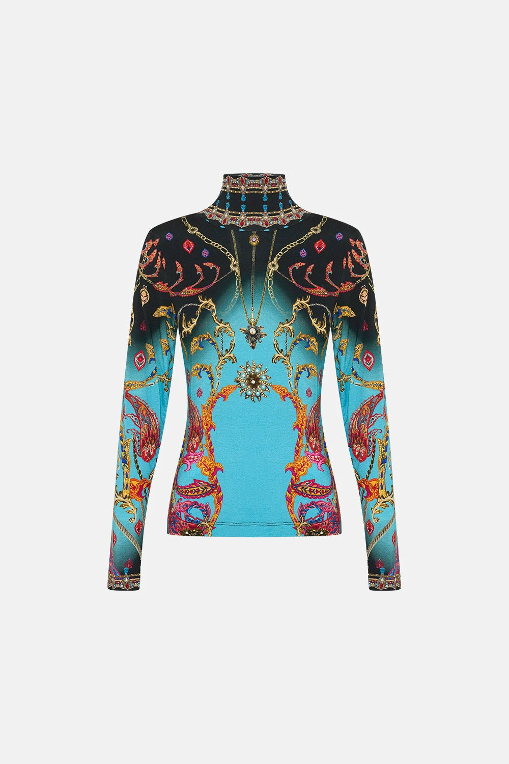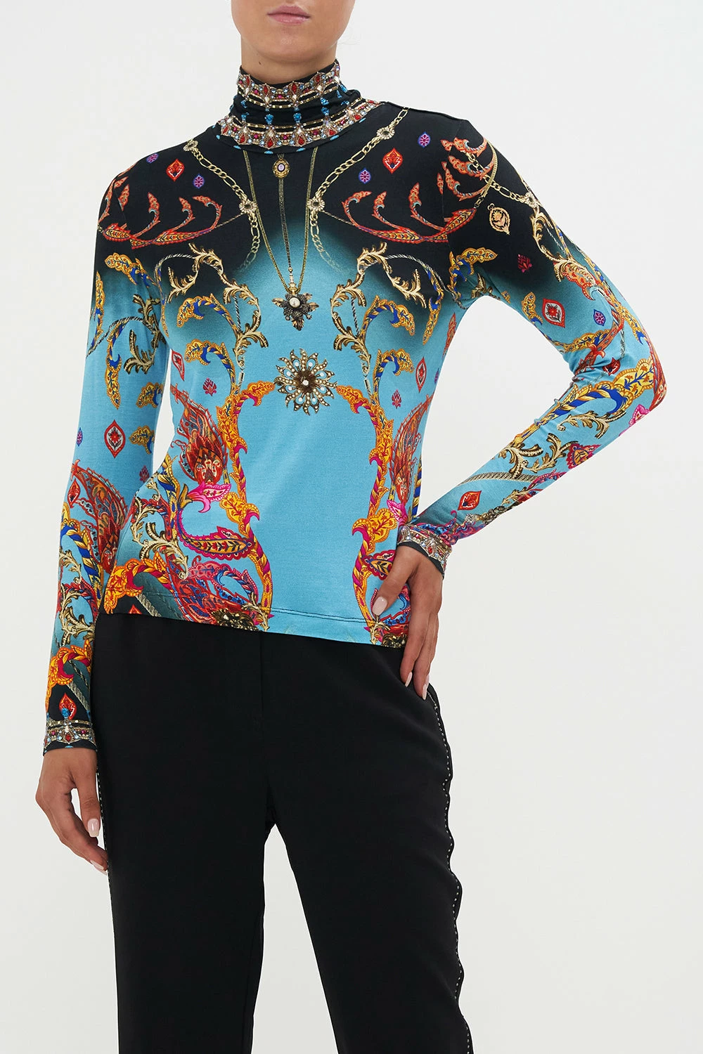 The What Lies Beneath Jersey Turtleneck welcomes the eye to paradise with a sky blue hue graced with paisley patterns dipped in raspberry tones, gold baroque details and a soft gradient that falls into shades of lavender.