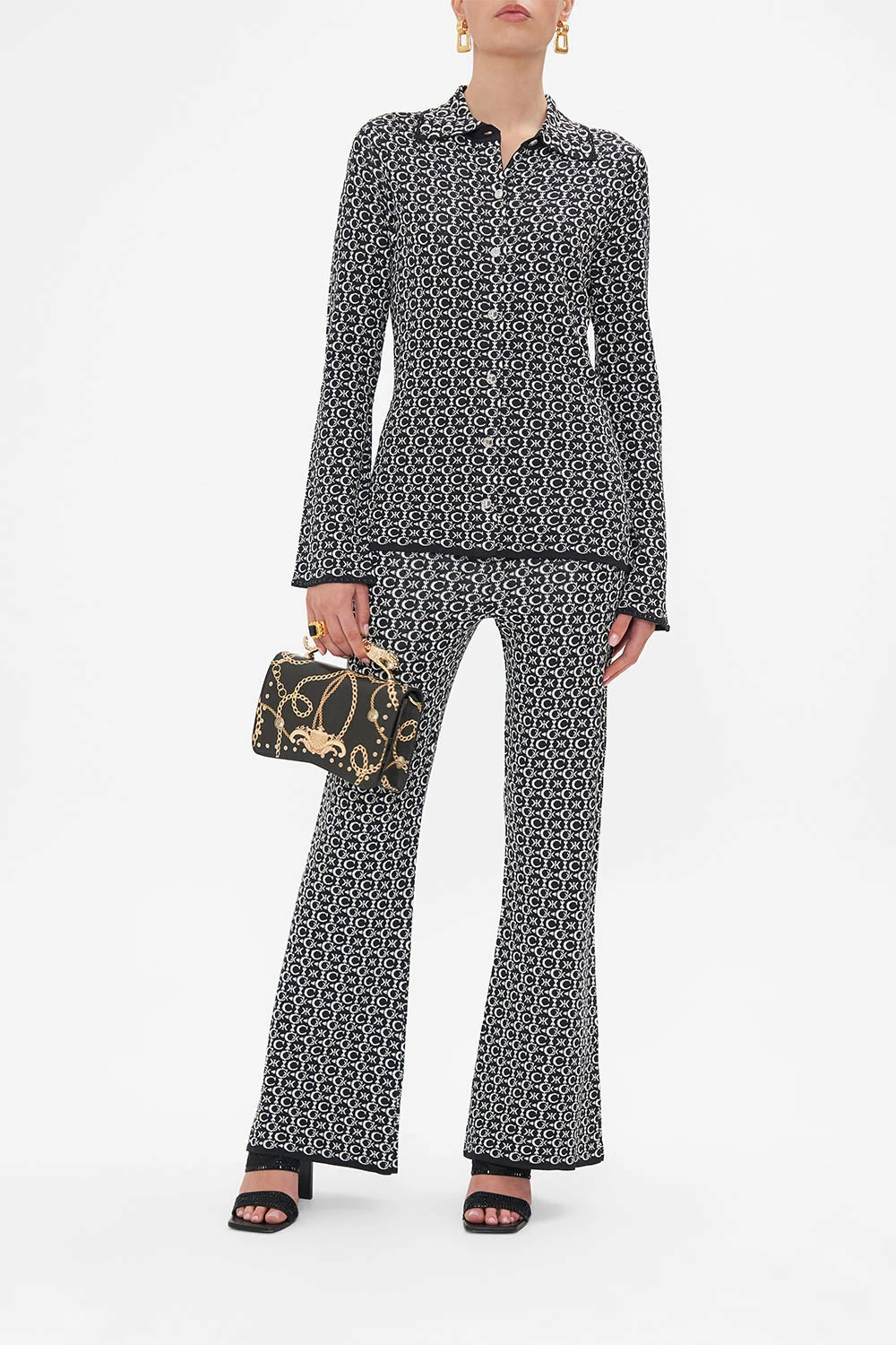 The Feline Fantasy Knit Shirt encompasses the sultry mood of the sleek and seductive feline shadows wildly embracing their contrast patterns and making their monogrammed marks. Crafted from fully fashioned soft rayon blend, this luxury knit shirt offers odes to soft tailoring at the collar, a sensational flared sleeve that dances at the wrist and a relaxed slimline silhouette that skims the curves, finished with a decadent button enclosure. Lovingly handcrafted and designed in Australia, explore more from The Moral Of The Story: Act II collection.