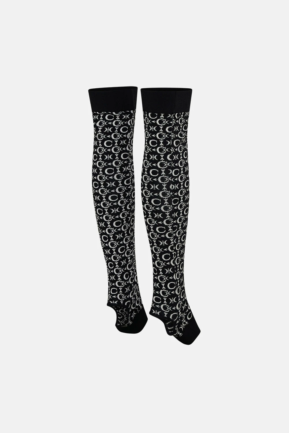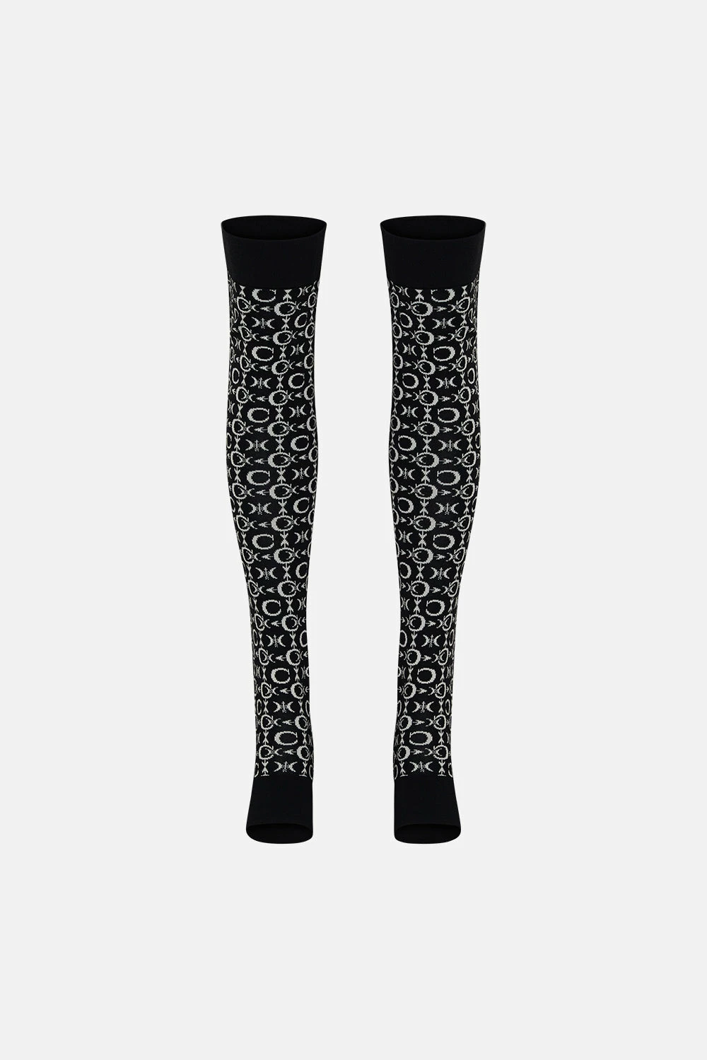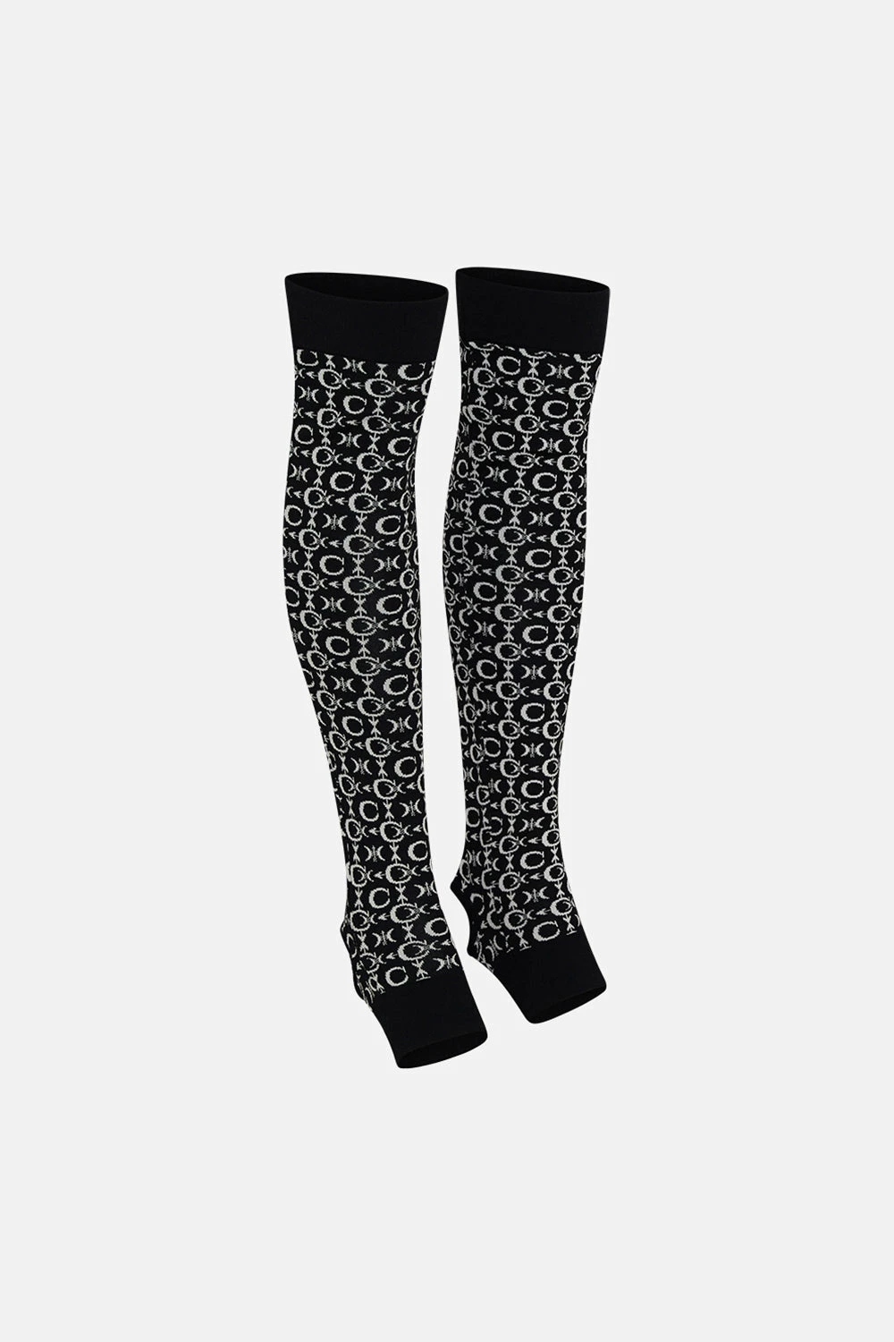 The Leo’s Sky Knitted Slouch Leg Warmers enthral the gaze with a monochromatic mosaic that dips into a palette of black and white before being finished with our signature namesake initialling and iconography.Crafted from breathable and moisture-absorbent rayon, these luxury leg warmers are home to an irresistible CAMILLA print that meets a longline silhouette, effortless open-toe functionality and a relaxed knitted fit.
