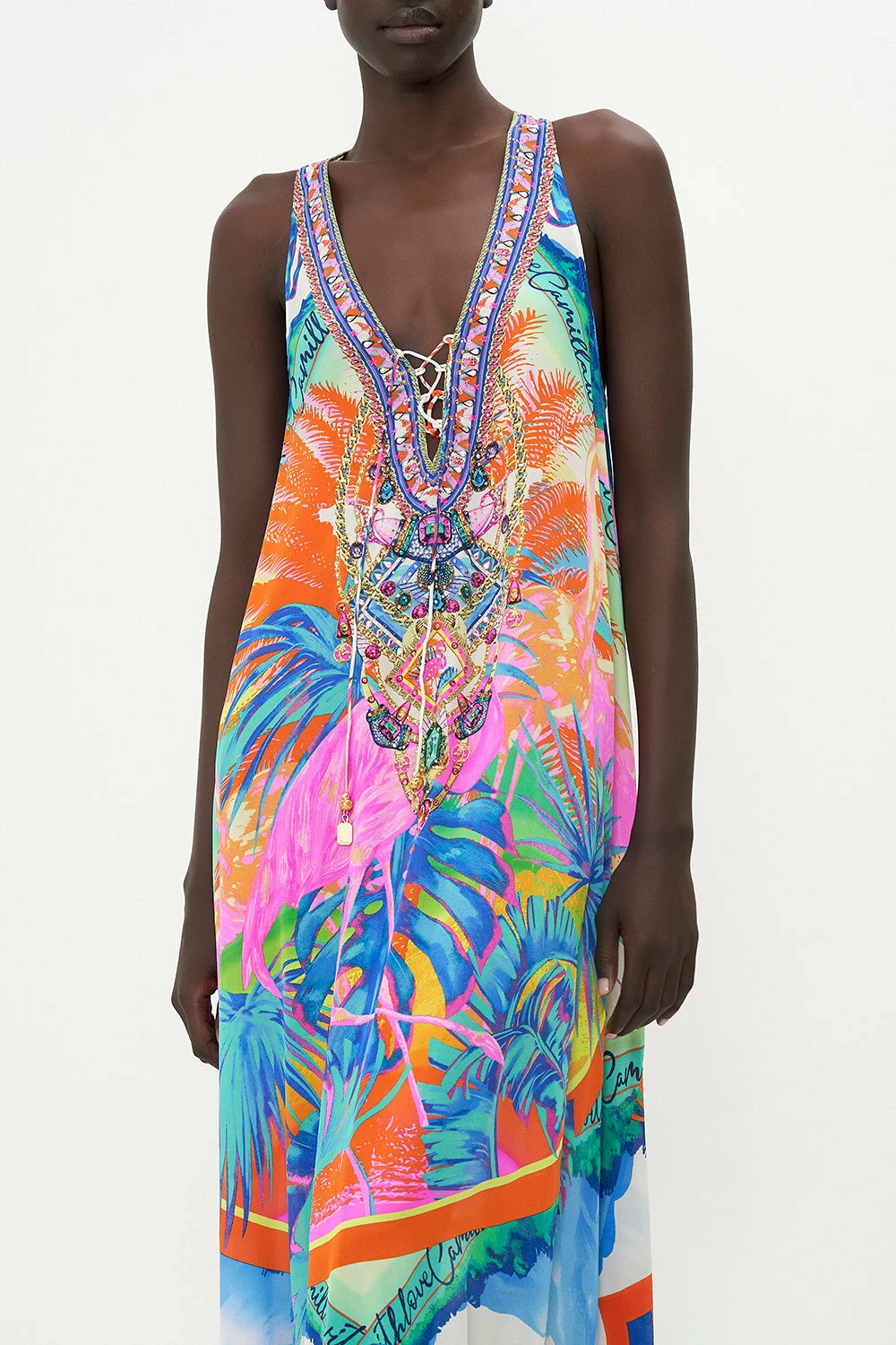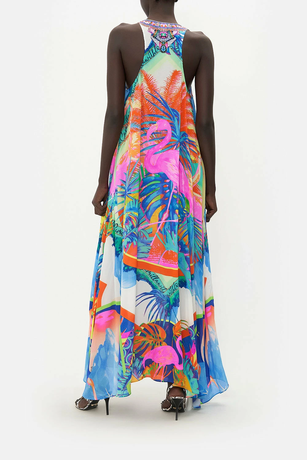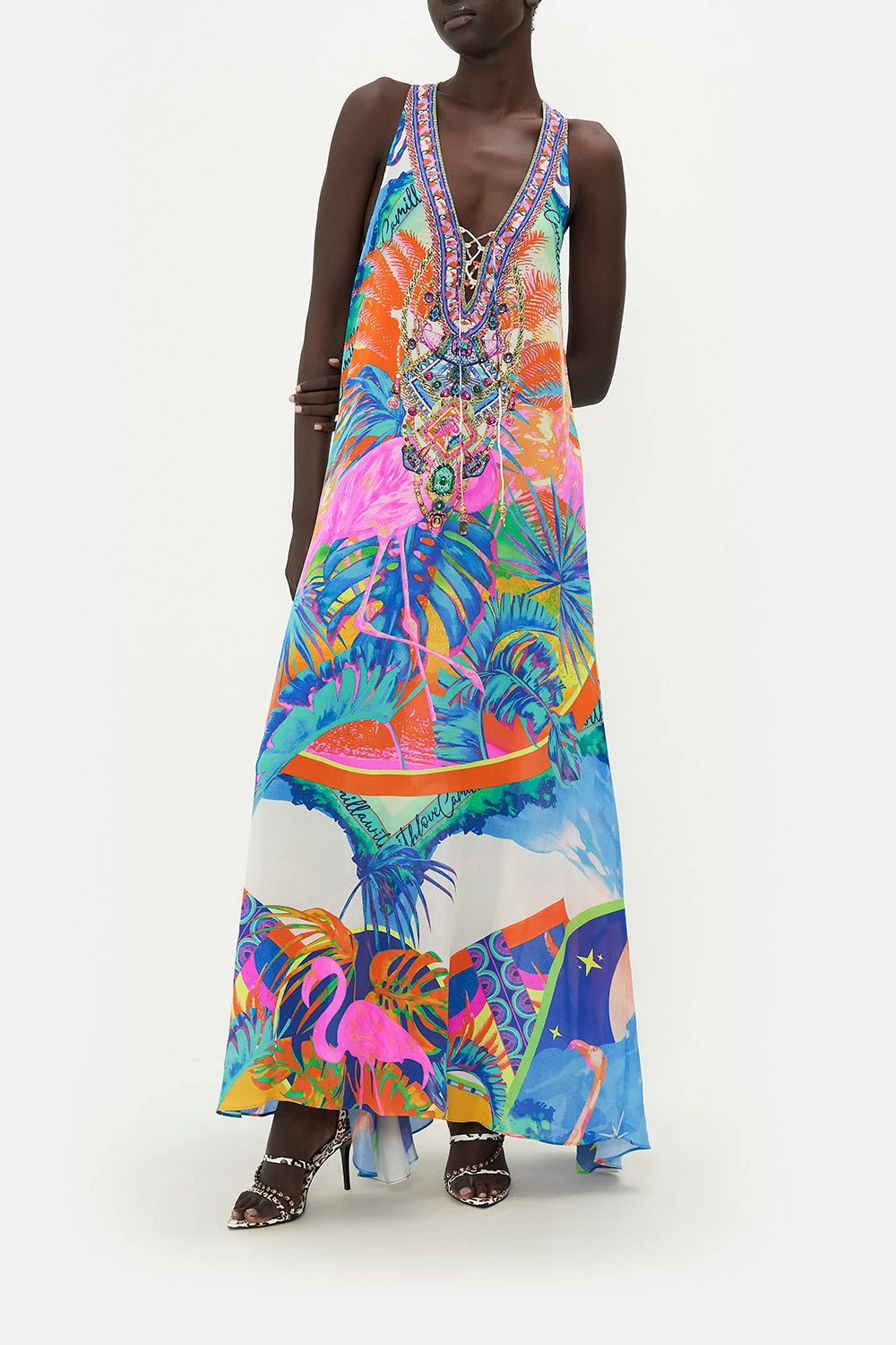 The Flamenco Flamingo Lace Up Racer Back Dress captivates the gaze with a neon nirvana that brings to life fuchsia flamingos, teal-dipped dreamscapes and sunset hues that enwrap scenes of Mother Earth’s paradise. Crafted from the softness of silk, this statement summer dress is home to a relaxed maxi silhouette finished with romantic lace-up detailing and a classic racerback style.