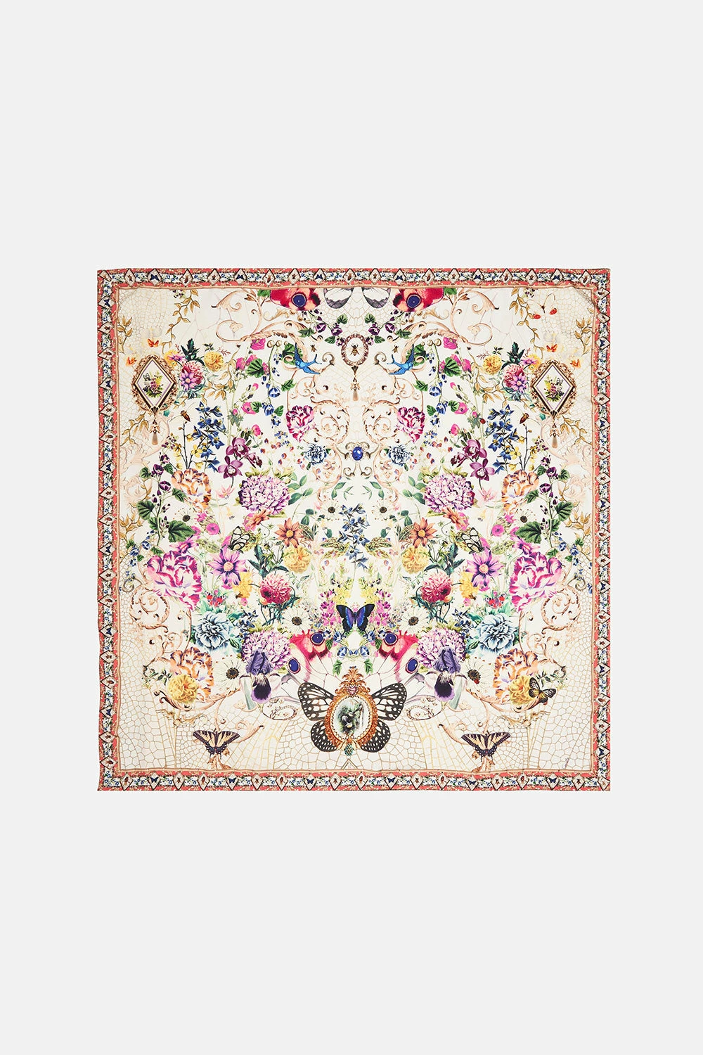 Telling the story of garden majesty upon décolletage, the Queens Bee Hive Large Square Scarf is encased by an ivory mosaic spotted with cascades of mauve vines, the flutter of butterflies, soft botanical blooms and delicate daisies. Hand-embellished with crystal adornments, this luxury silk scarf features a large expanse, signature CAMILLA shimmer and a multi-wear design. With an array of , shift it into a variety of summer tops.