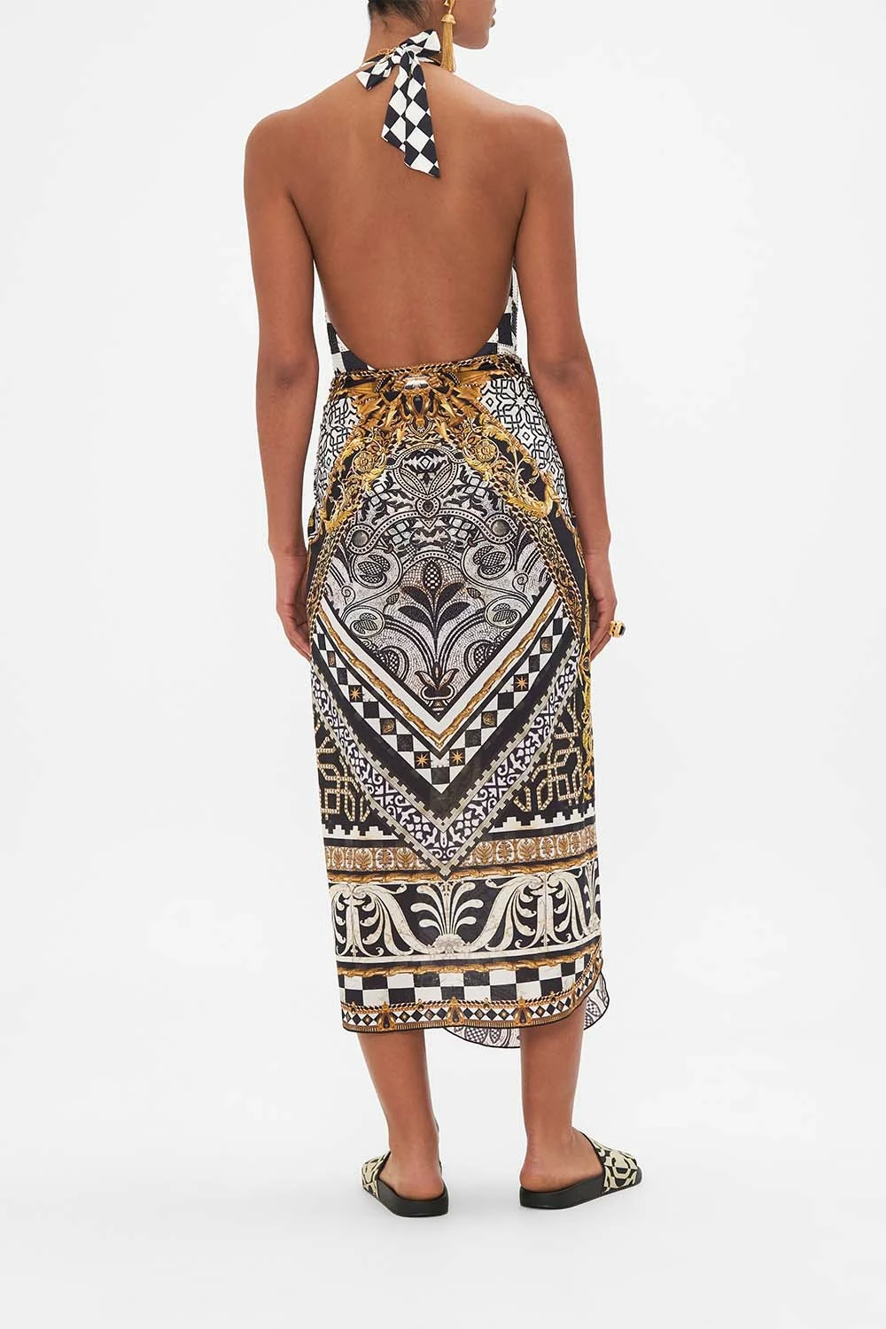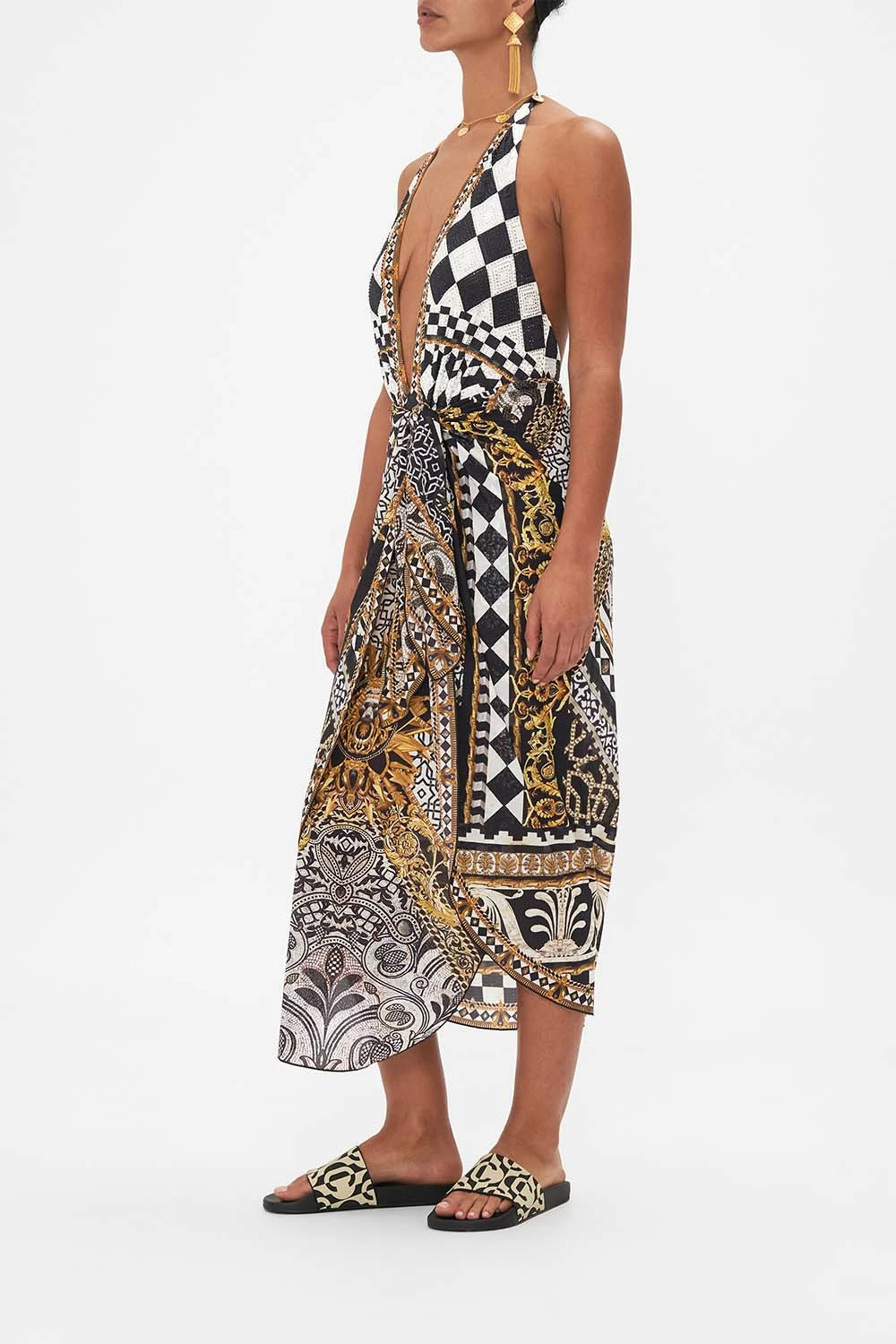 The Look Up Tesoro Layered Long Sarong With Front Tie embodies a striking mosaic of bold graphic borderlines that dance with the opulence of gilded baroque filigree. Strikingly versatile to take you from beachside bliss to dinner under moonlight, this luxury CAMILLA sarong wrap is home to a generous length, tie-up fastening and a layered panel details. Pair with the Look Up Tesoro V Neck Underwire One Piece swimsuit for decadent resortwear styling. Lovingly crafted, designed in Australia. Explore more from Amore Mio collection.