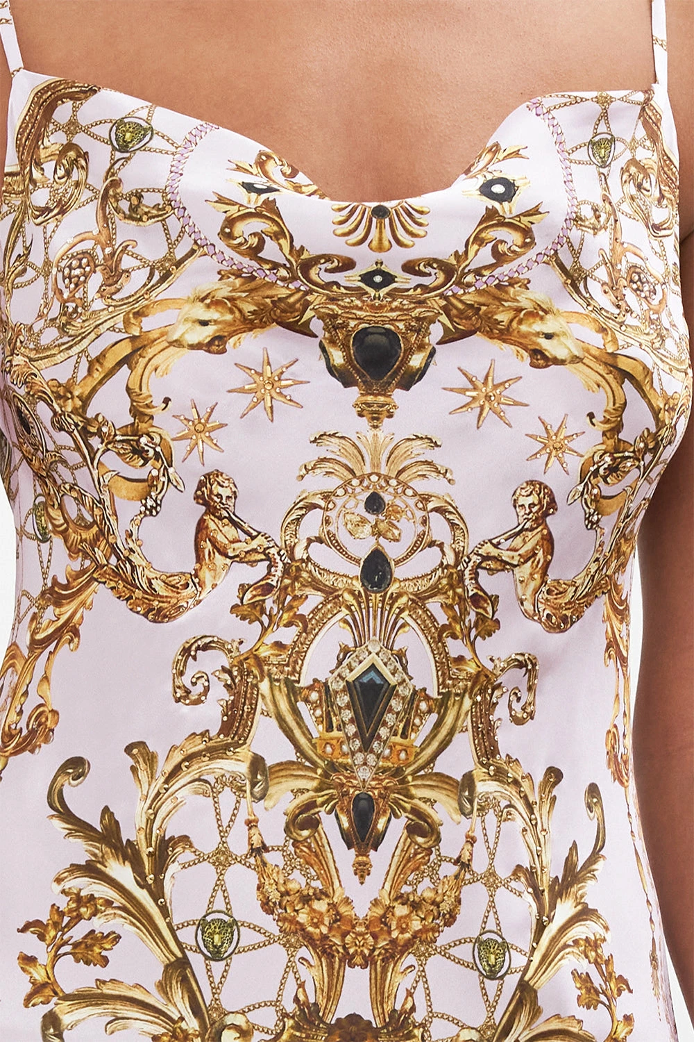 The Lavender Ever After Long Bias Slip steps into a pastel dreamscape of sculptural curves and gilded fronds. A heavenly arrangement of charms and royal crests imbued in myth and magic. Adorning CAMILLA crystals, this luxury silk satin slip dress features a soft cowl neck, an on-the-bias silhouette, adjustable straps and a relaxed slimline fit that hugs your curves and dances at midi length. This timeless treasure can be worn as a beautiful sundress or an elegant evening dress amongst starlit skies. Lovingly handcrafted, designed in Australia. Explore more from the Amore Mio collection.