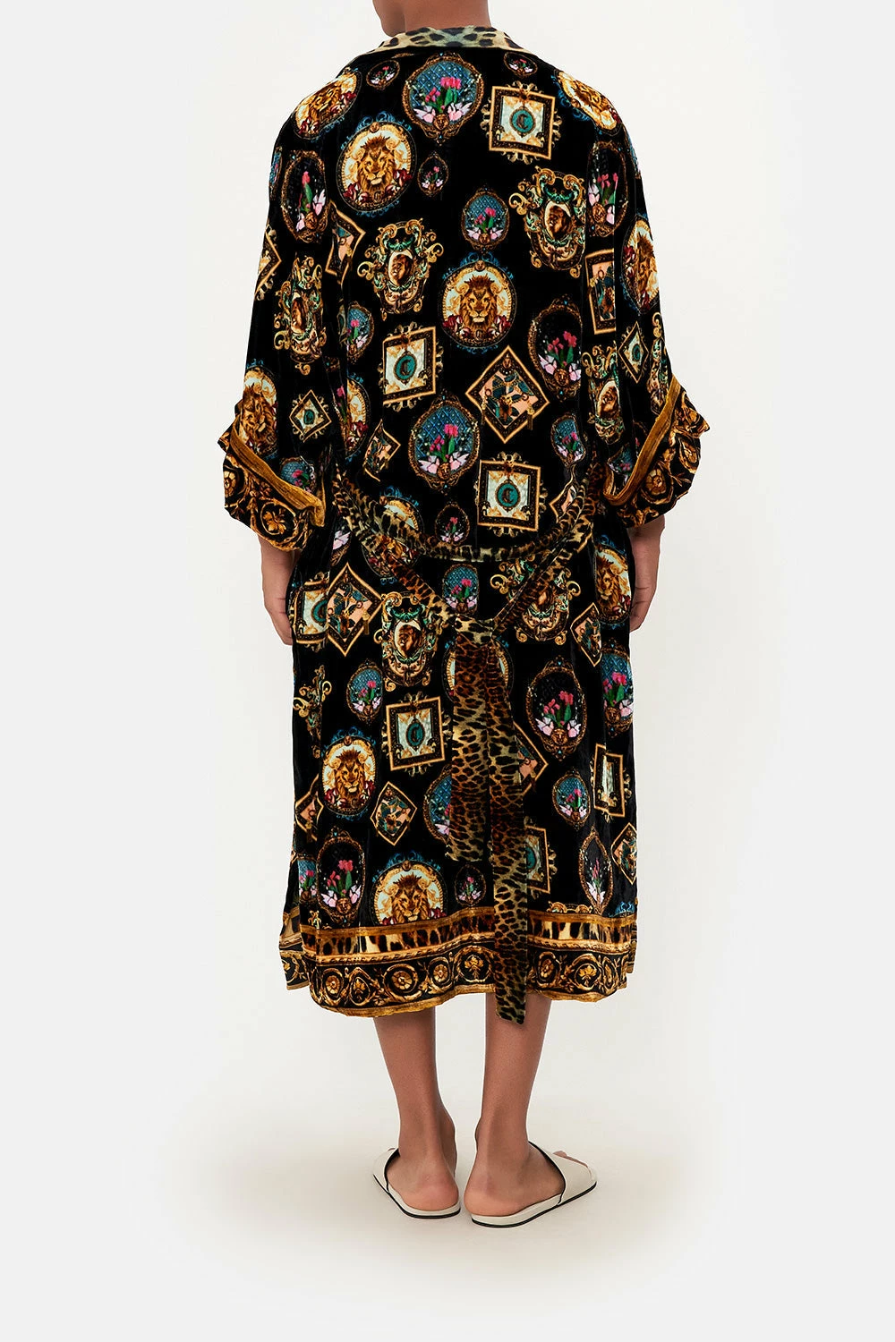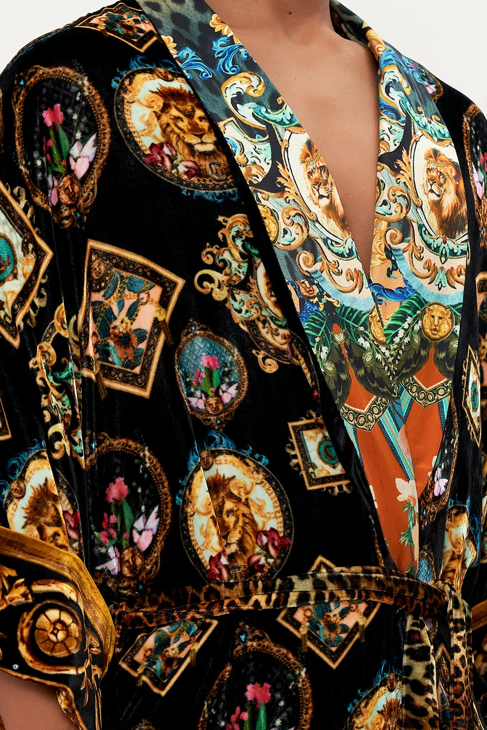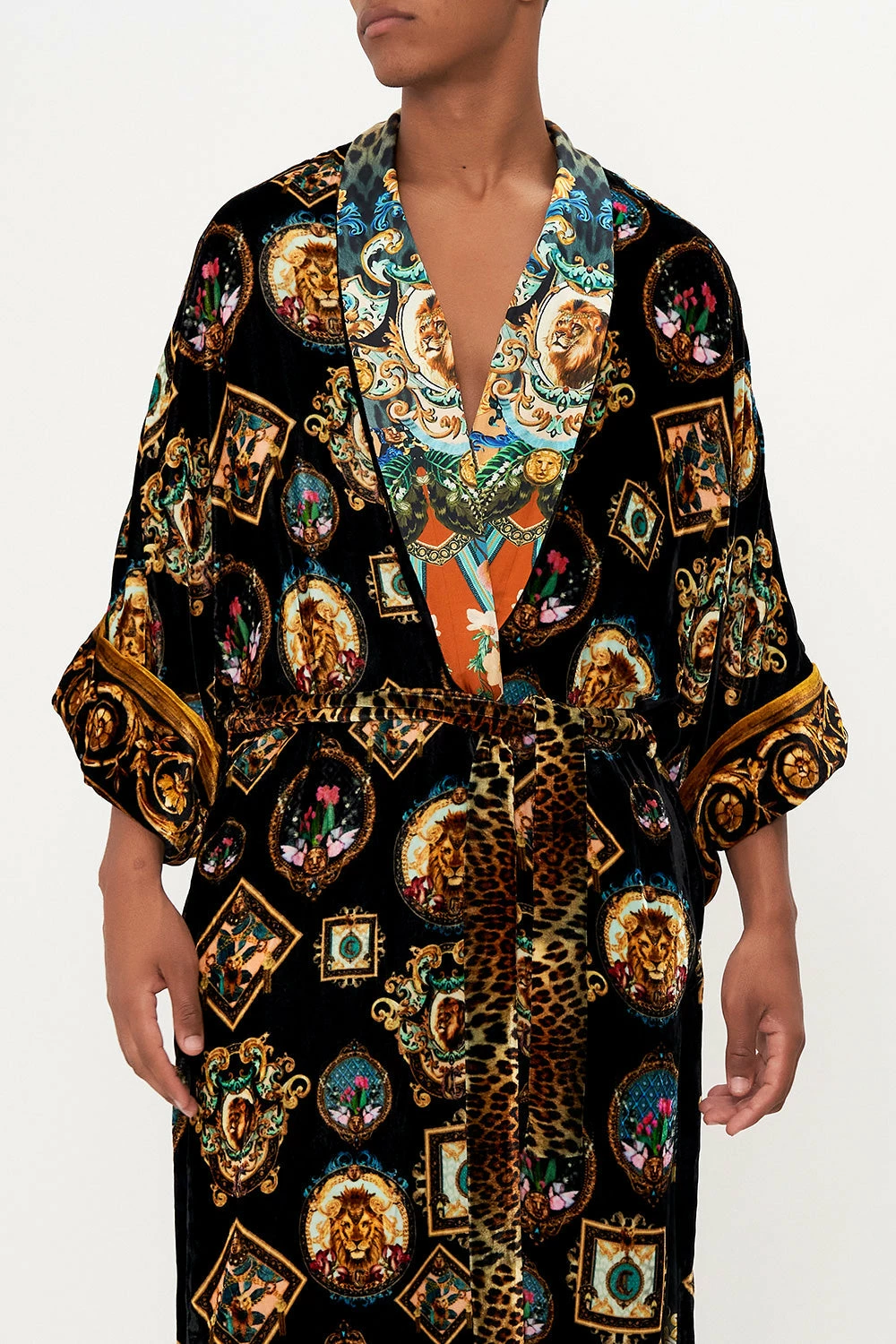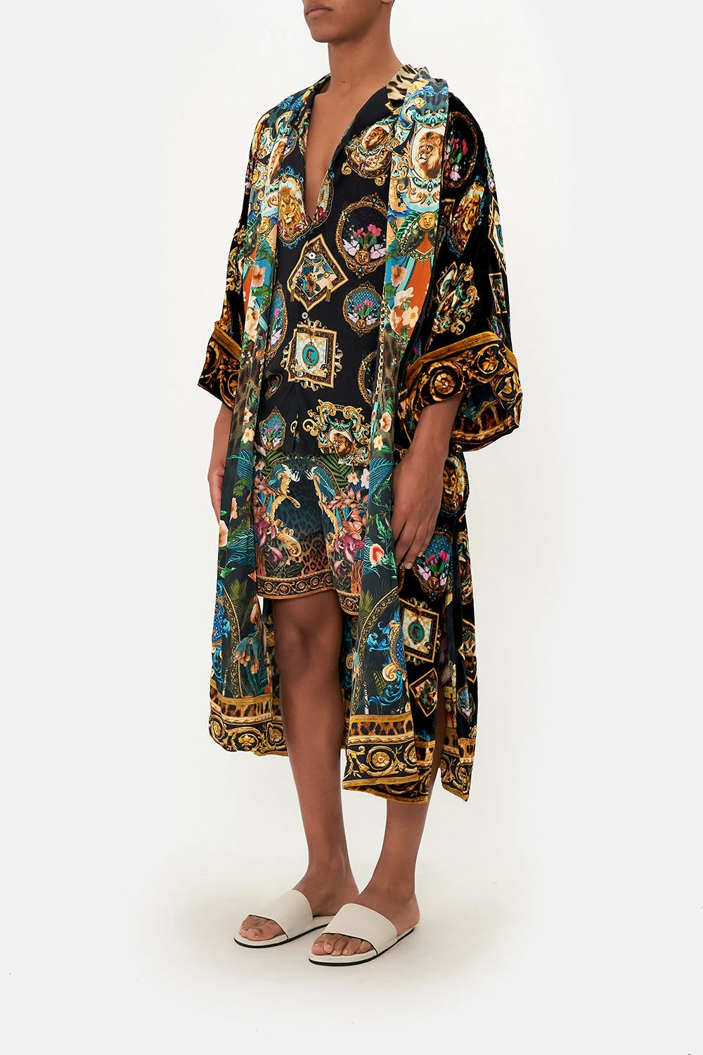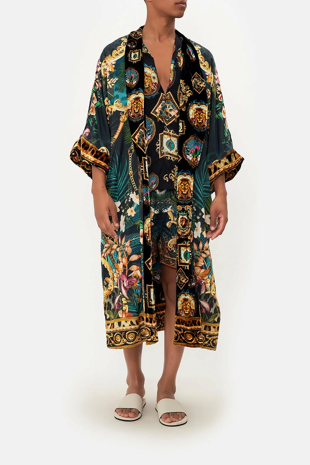 The Fearless Felis Long Line Reversible Robe is encapsulated by a sea of rich midnight hues enveloped by baroque details, amulets of big cat majesties and soft botanical bouquets dipped in blush hues that bloom from golden mirrors. Crafted from signature CAMILLA silk, this luxury mens robe is home to a reversible print depicting scenes of untamed majesty, contrasting neckbands, a wide statement sleeve and a relaxed midi length.