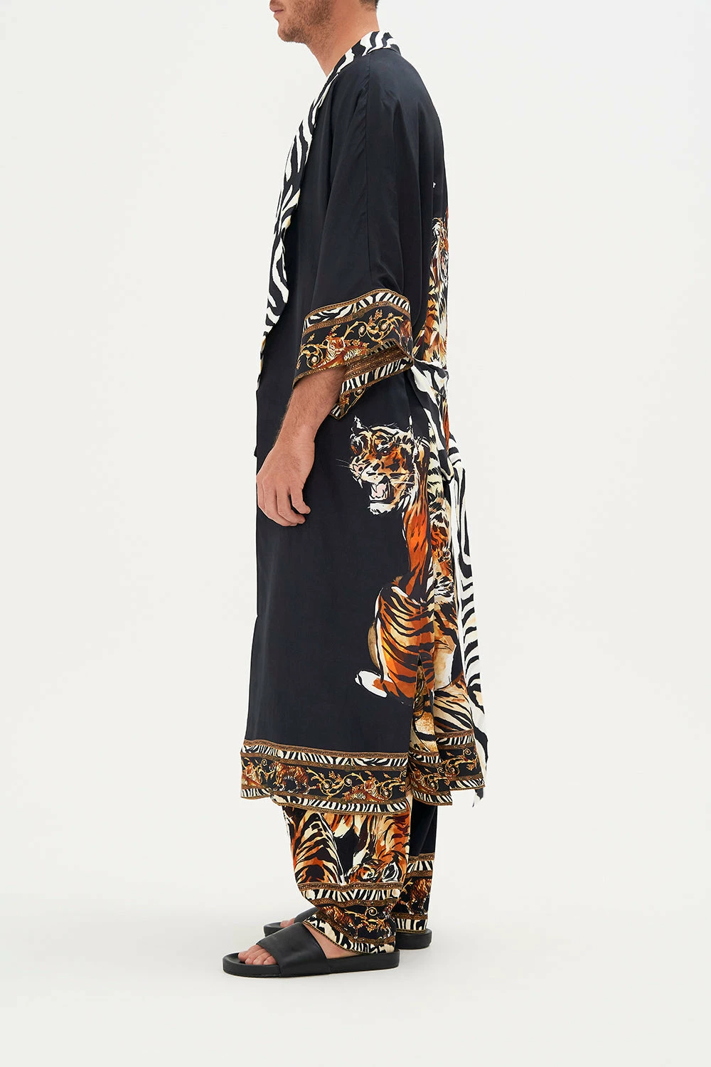 Wrapping you in the reimagined wilds of distant plains, the What’s New Pussycat Long Line Reversible Robe treats the gaze to an intricate mosaic of striking tiger eyes and cascades of classic leopard print upon a sea of midnight hues. For a change in accent, turn your robe inside out to reveal a mosaic of tiger portriats. Crafted from breathable CAMILLA silk, this luxury robe features a multi-wear design, wide statement sleeve, a waist-tie to cinch and shape, functional pockets and a longline relaxed silhouette.