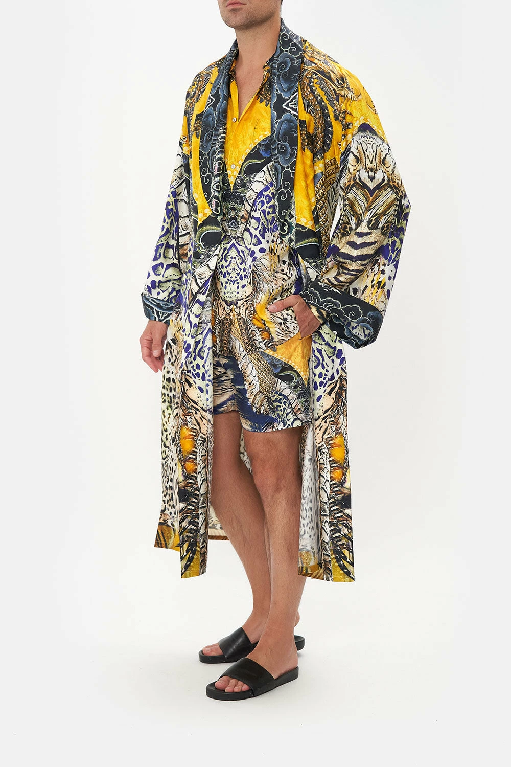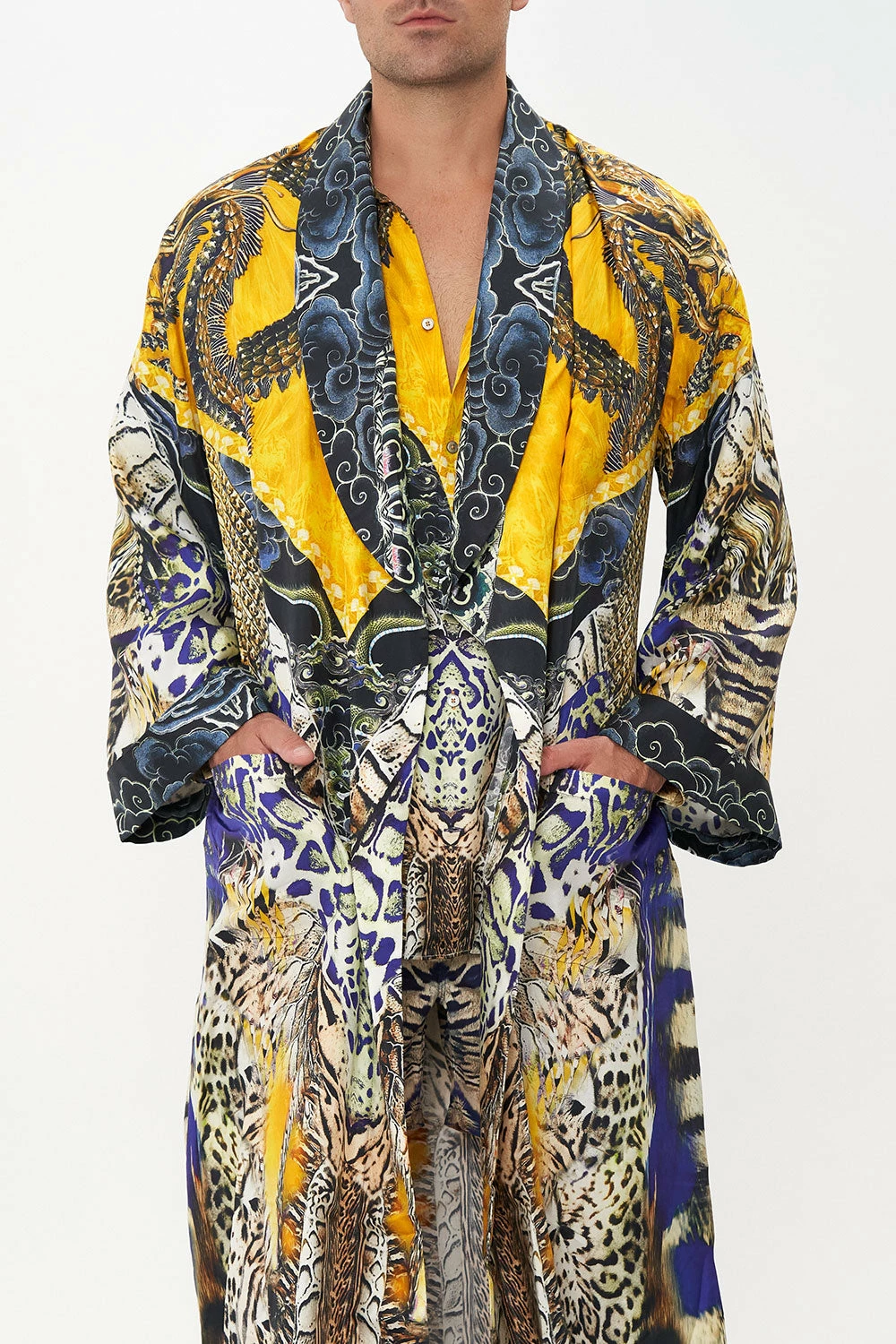 Menswear elevated with transeasonal layers, the Dance Of The Dragon Long Line Robe treats the gaze to a rich canary yellow adorned with deep navy trickles, vibrant gold accents and intricate dragon portraits. Crafted from signature CAMILLA silk, this luxury robe features a wide statement sleeve, a waist-tie to cinch and shape, functional pockets and a longline relaxed silhouette.