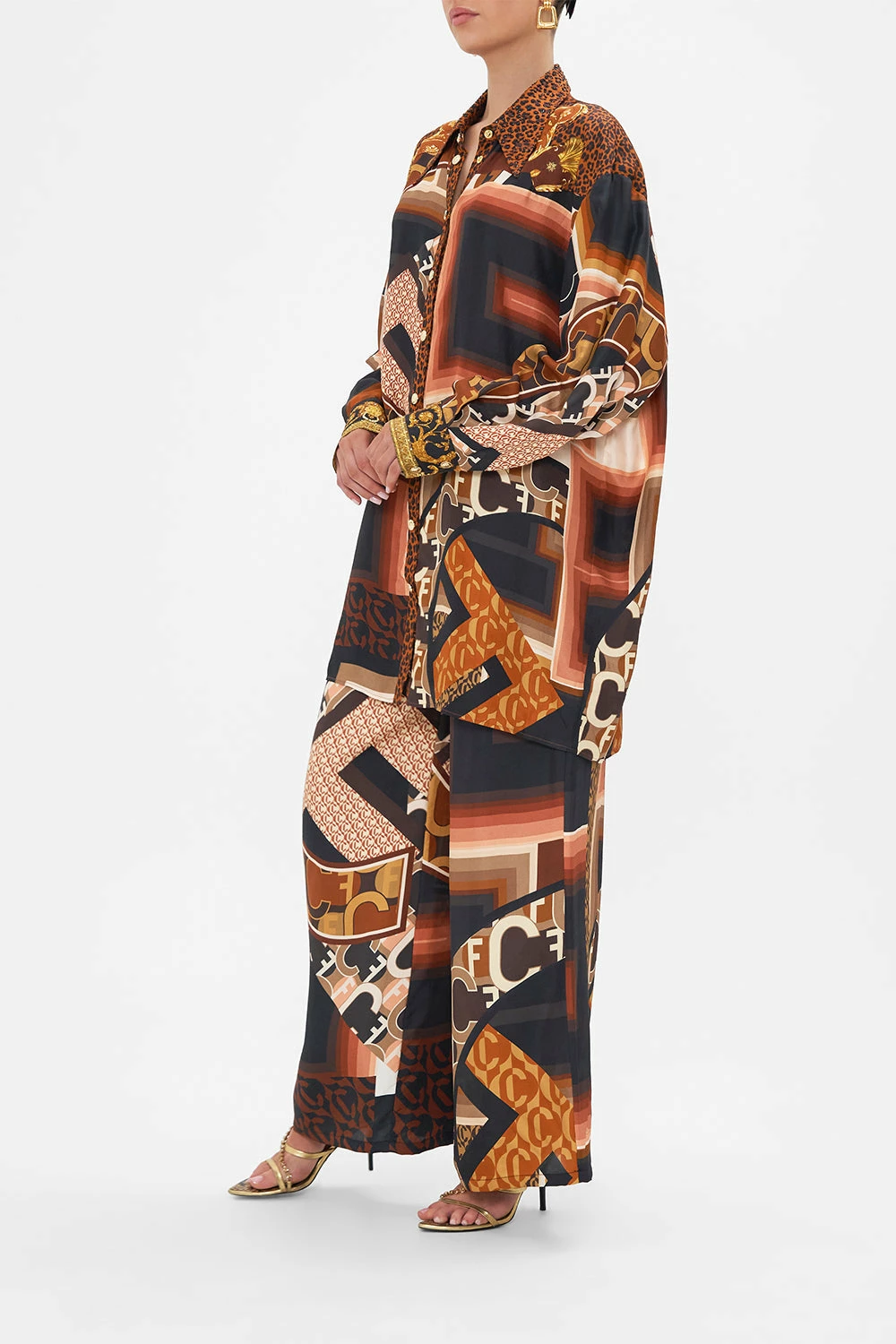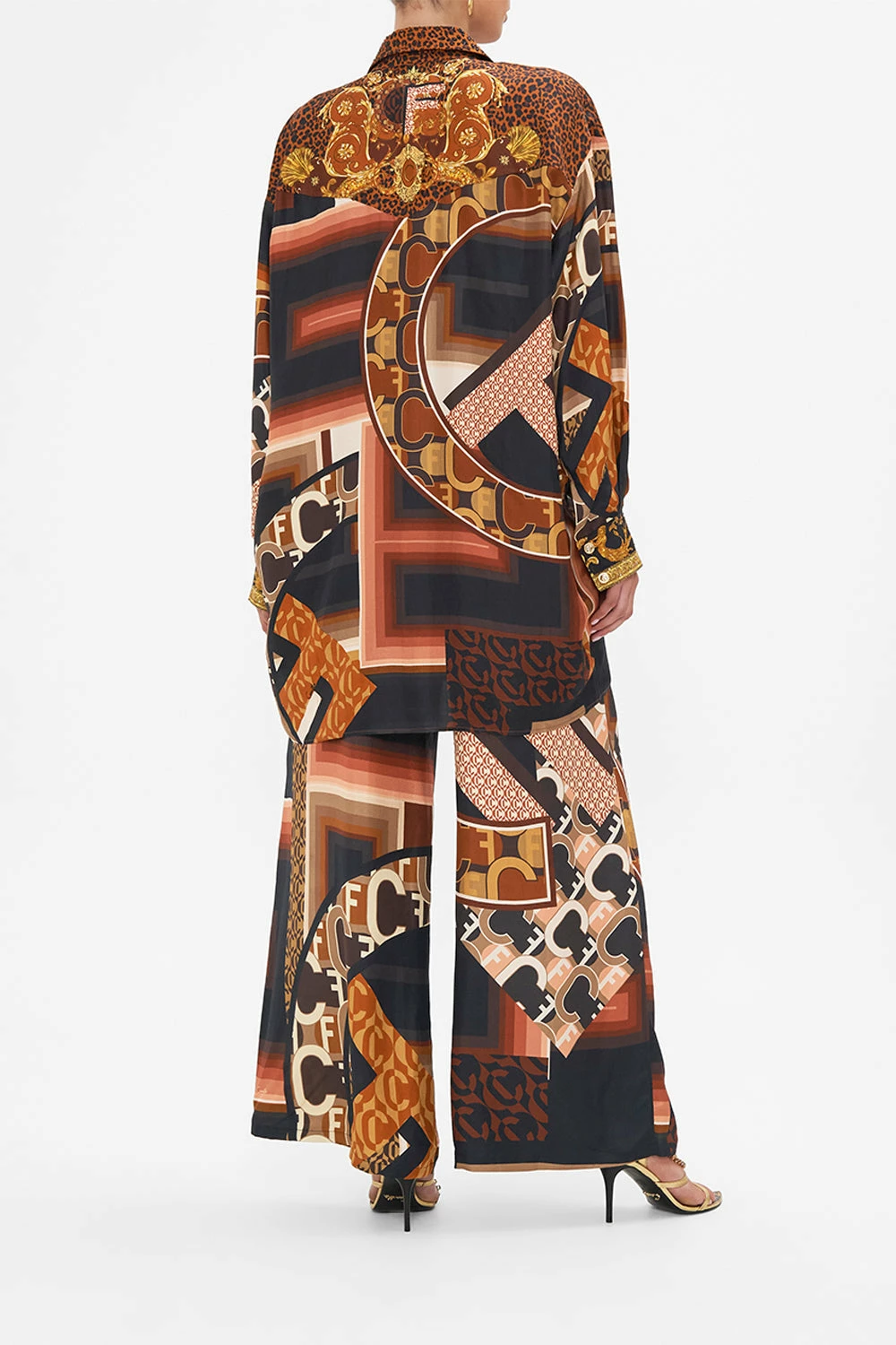 The Feeling Fresco Longline Shirt With Yoke And Button Detail explores the soft curves lined with monogrammed moments paying homage to vintage scarf motifs. Immaculately crafted, this luxe silk tunic shirt features front and back yoke panels, softly tailored cuffs, collar and front placket with press button enclosure, CAMILLA crystal embellishments and box pleat detail at the back body for an accentuated oversized silhouette. Versatile as a tunic length shirt dress or a button down tunic layered with matching Feeling Fresco Straight Leg Pant. Lovingly handcrafted, designed in Australia. Explore more from the Amore Mio collection.