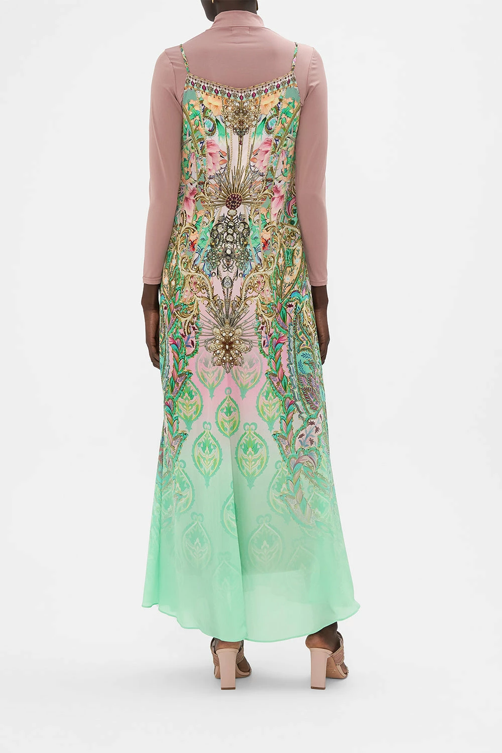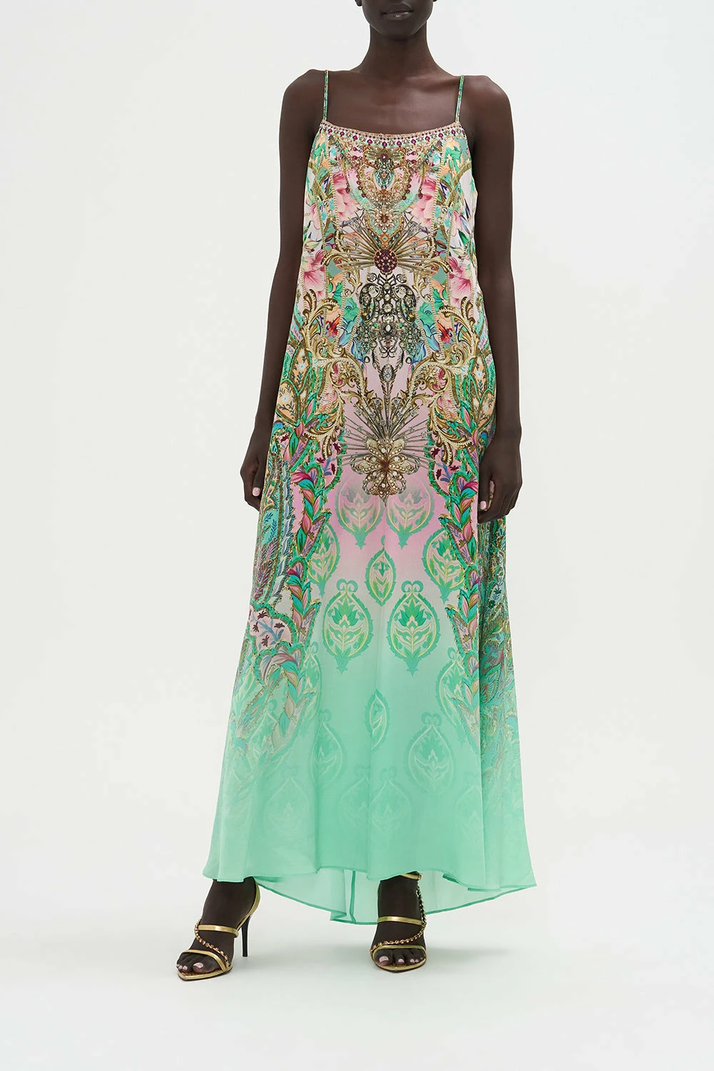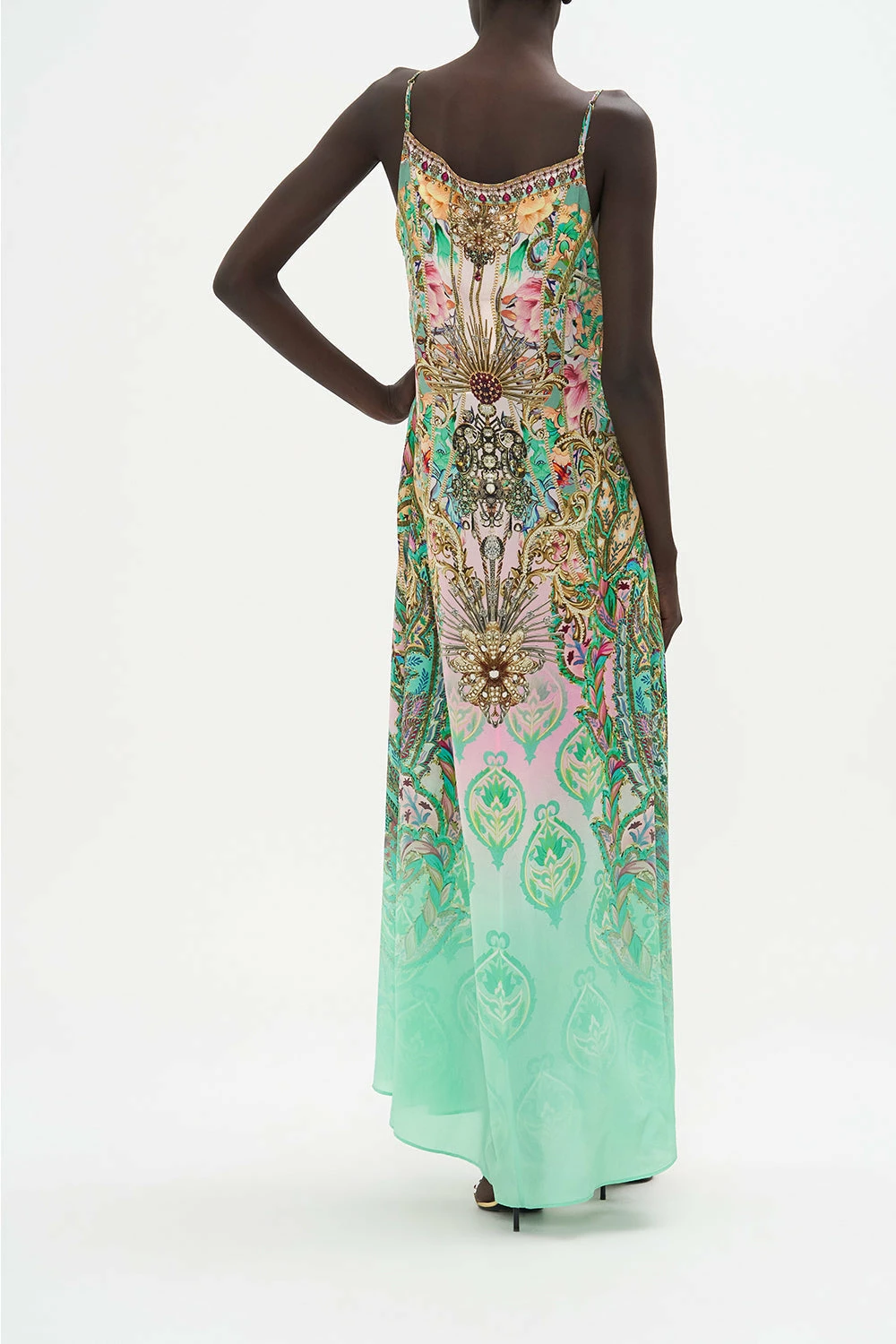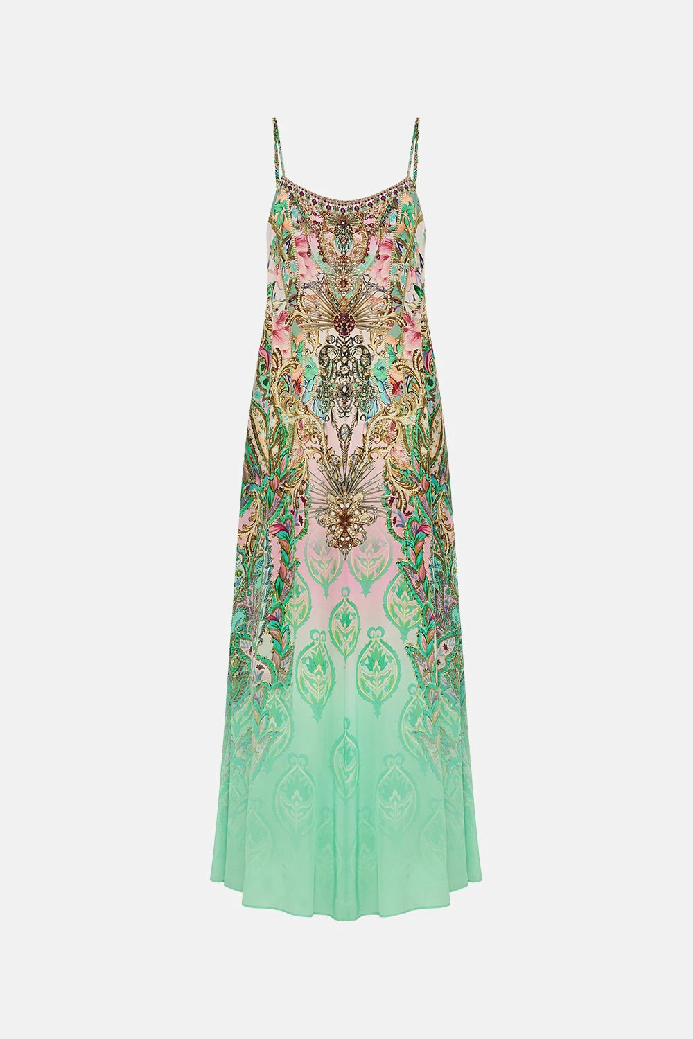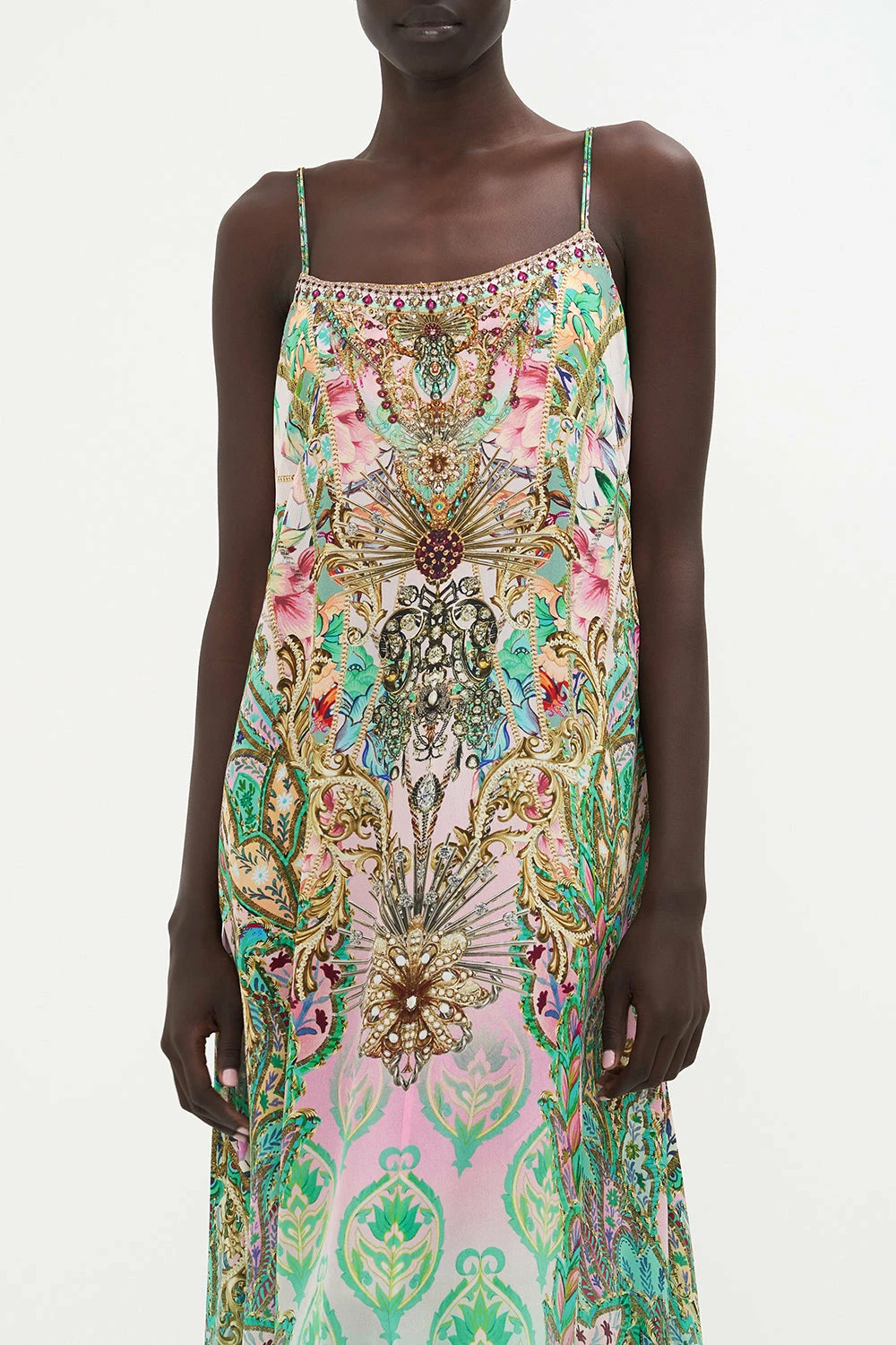The Lost City Long Panel Slip Dress enwraps our gaze with a kaleidoscope of minty greens and gentle pinks as baroque details dipped in gold intertwine with paisley patterns. Complete with hand-embellished CAMILLA crystals, this luxury silk slip dress features a soft neckline, an A-line silhouette that falls into a maxi hemline, dainty rouleau straps and a relaxed cut that drapes off the body.