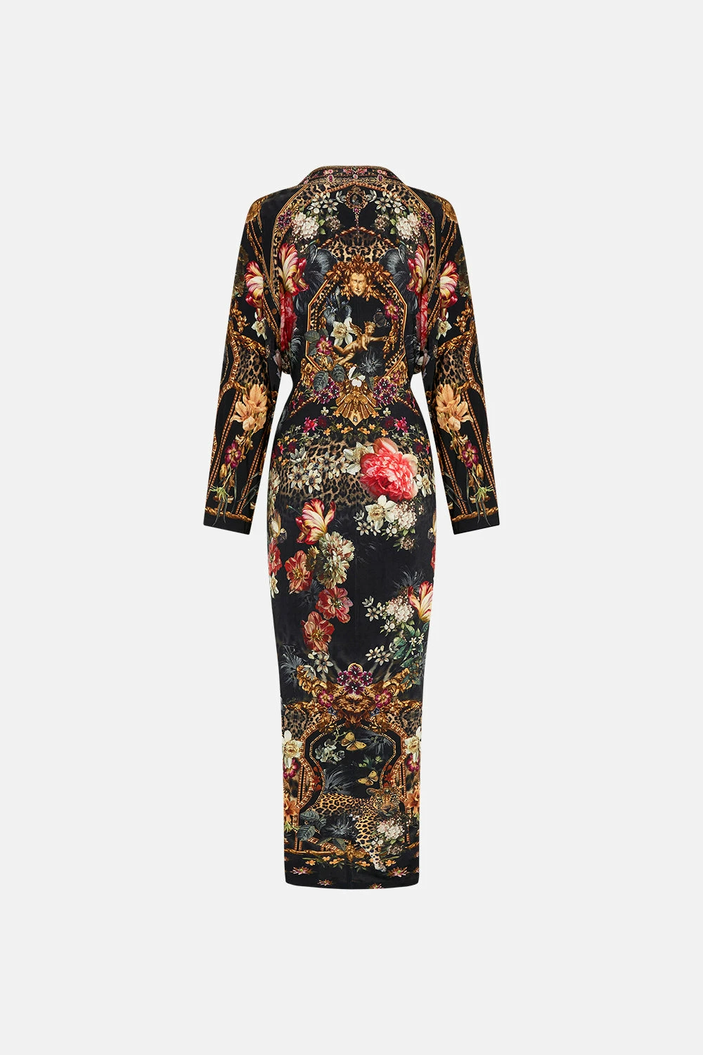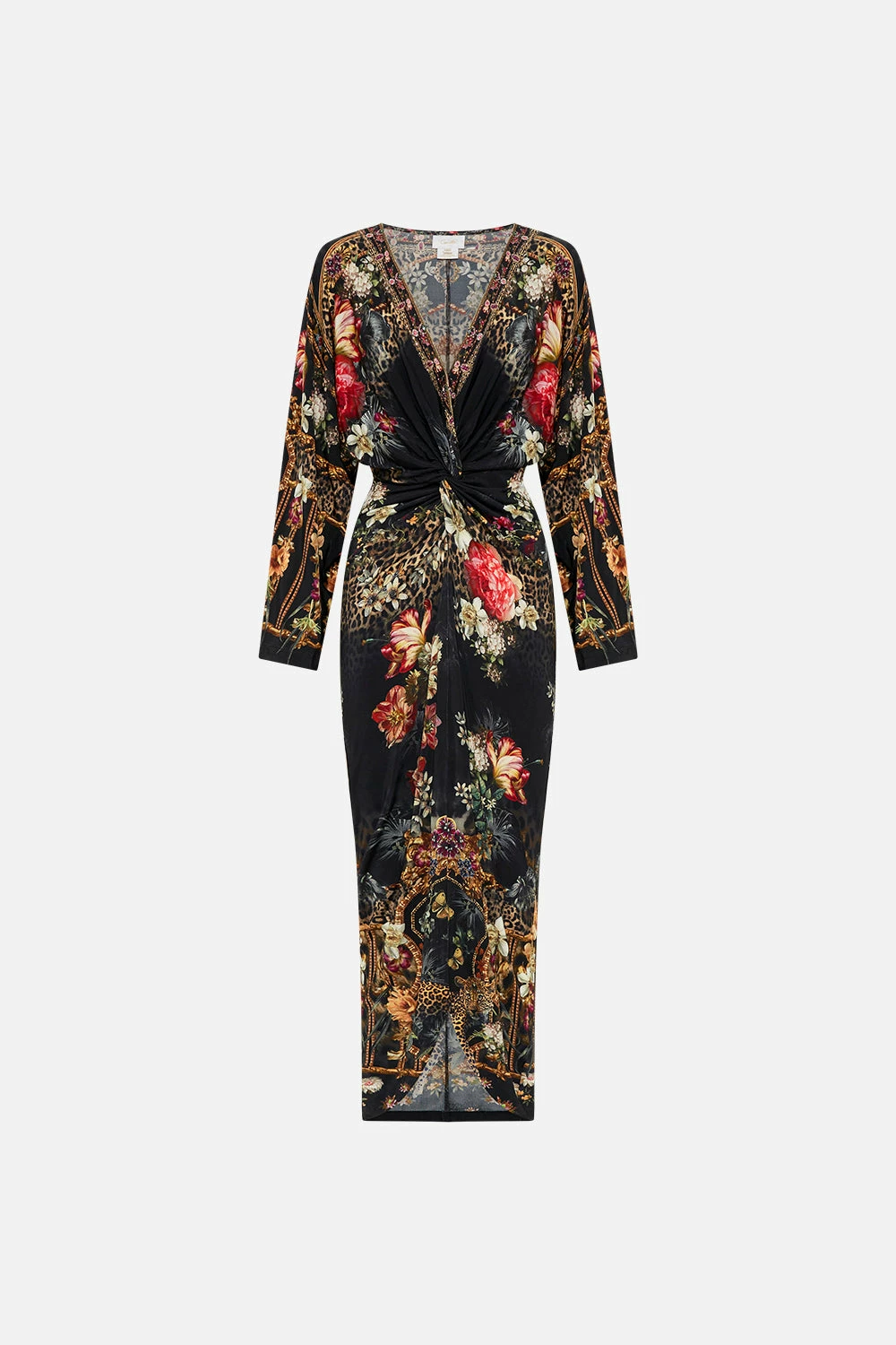 The A Night At The Opera Long Split Front Twist Dress echoes the sweet symphony of frescoes adorning opulent florals, ethereal cherubs and grand gilded archways. Complete with CAMILLA crystals, this luxury occasion dress features a wide statement sleeve, twist-front detailing to cinch in the waist, a centre-front split to show glimpses of the legs and a relaxed maxi silhouette. Lovingly handcrafted, designed in Australia. Explore more from the Amore Mio collection.