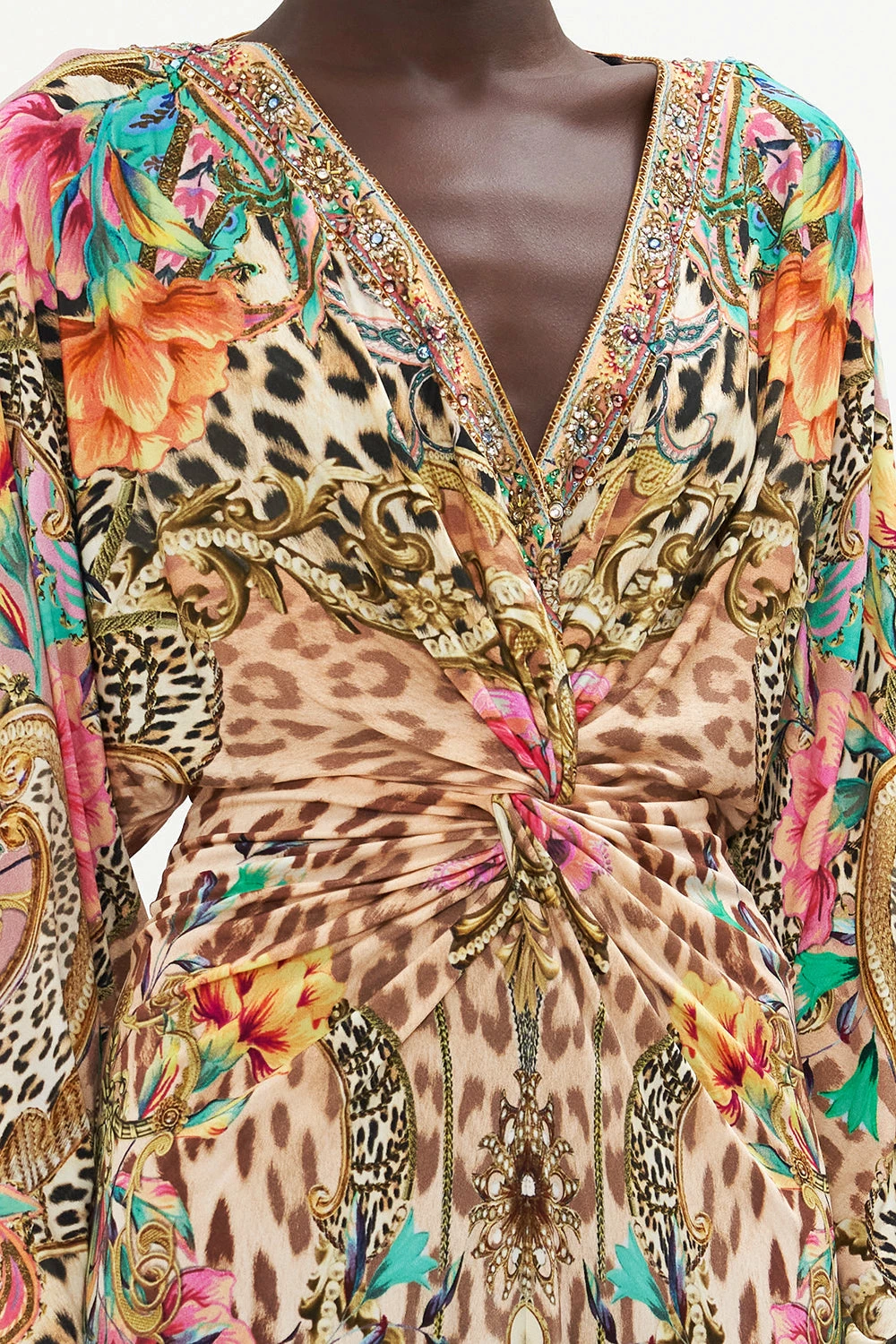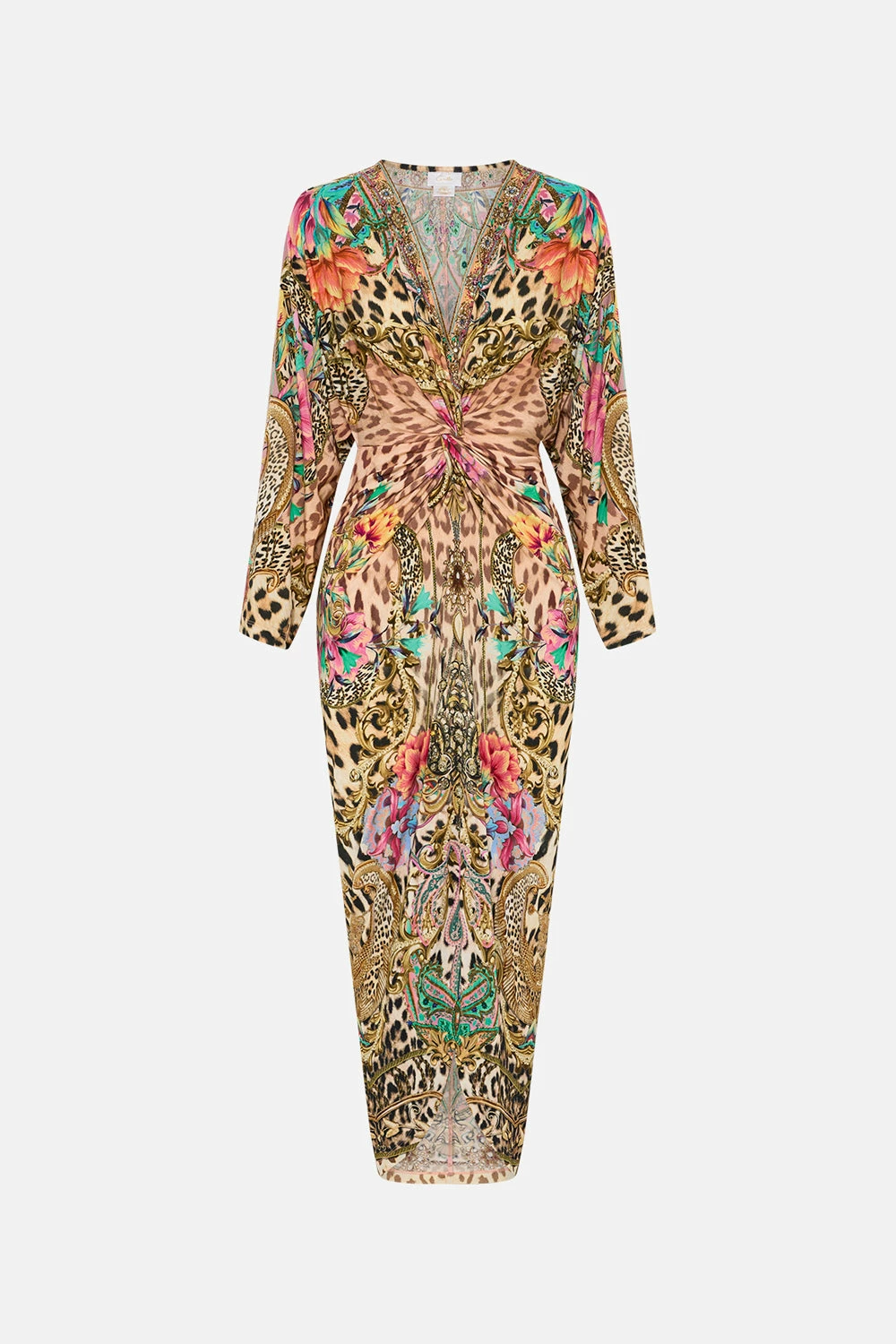 The Queen Atlantis Long Split Front Twist Dress brings back a classic with timeless leopard print finished with petals dipped in blush hues, roped accents and gold baroque detailing. Complete with hand-embellished CAMILLA crystals, this luxury occasion dress features a wide statement sleeve, twist-front detailing to cinch in the waist, a centre-front split to show glimpses of the legs and a relaxed maxi silhouette.