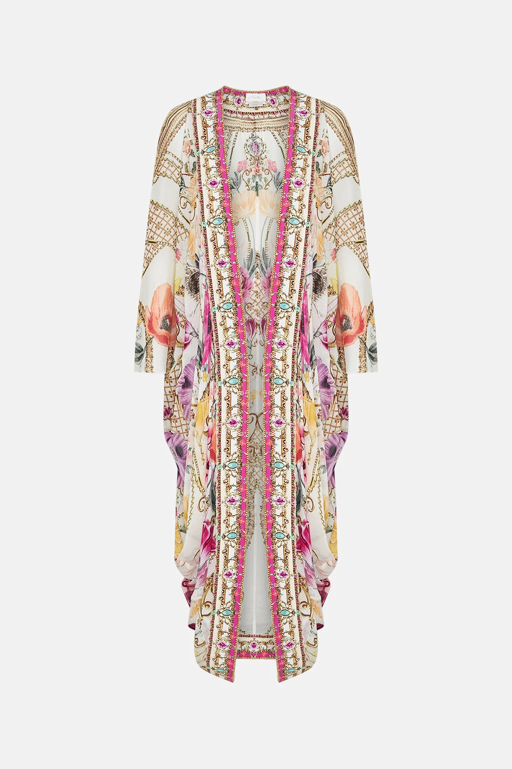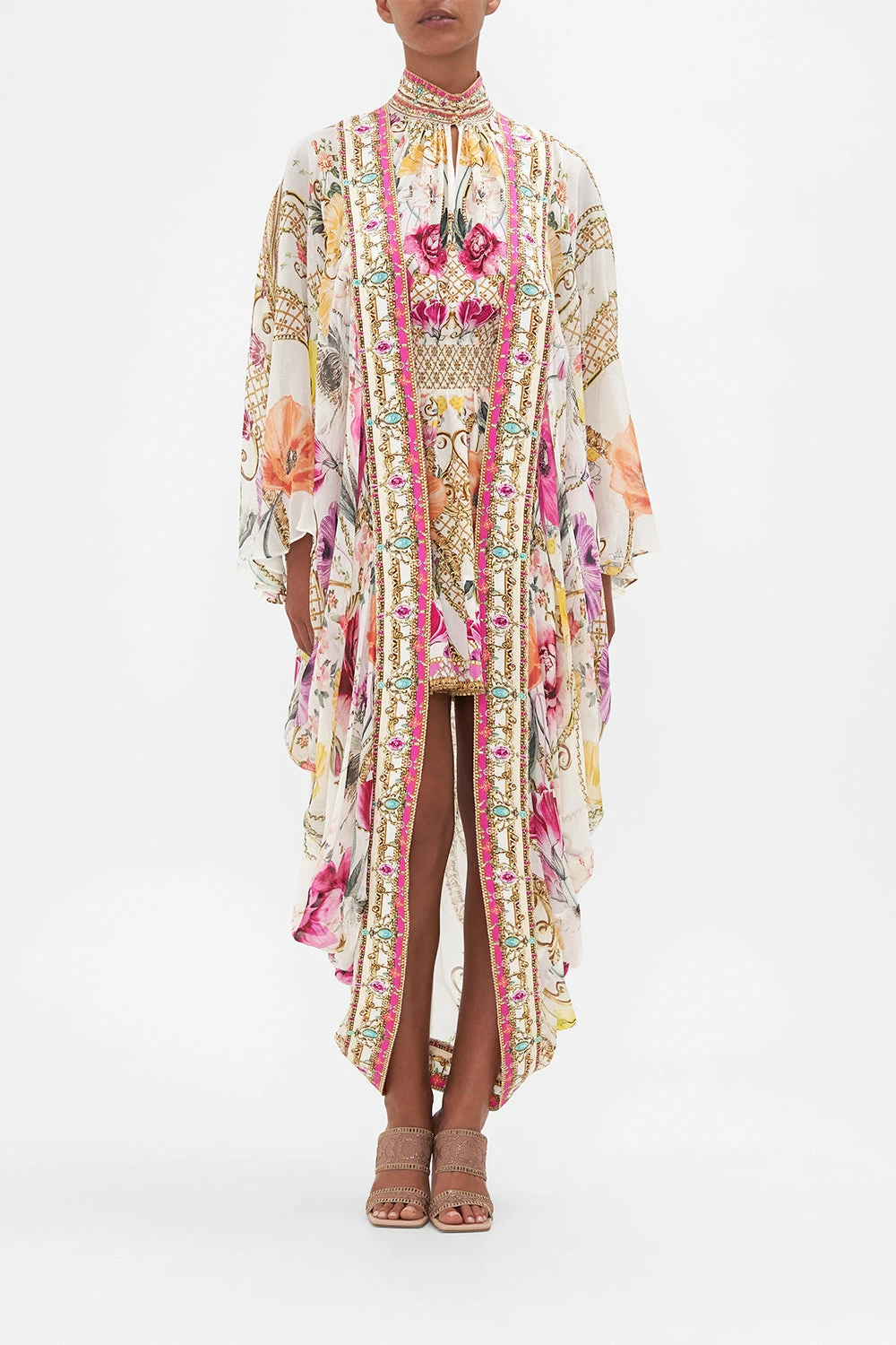 The Destiny Calling Long Sleeve Long Cape is a sweet sonnet of bright feminine florals cascading across a gate of fine golden lattice and baroque flourishes. Crafted from the softness of silk, this CAMILLA layering piece homes a luxury open contrast neckband adorned in hand-embellished crystals, a full-length silhouette with luscious draping that cascades down to the ankle, and relaxed full length sleeves that drapes softly to the wrists. Lovingly handcrafted and designed in Australia, explore more from The Moral Of The Story: Act II collection.