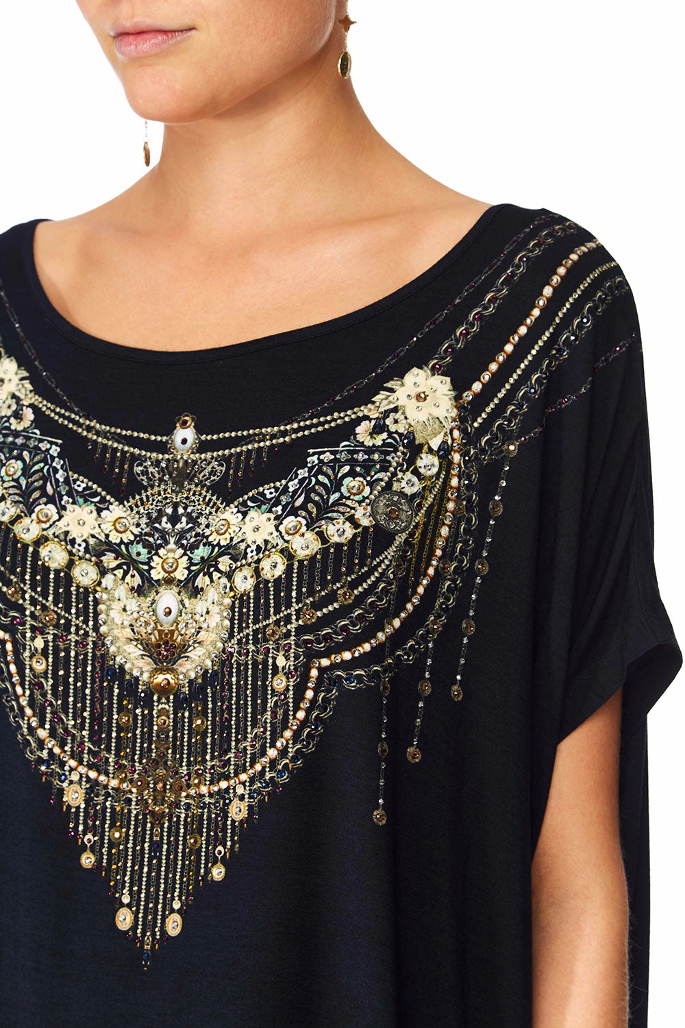 A mystical vision of her soul’s deepest yearning, the Midnight Moonchild Loose Fit Tee details the artisanal beauty of traditional Japan with an intricate placement print. Made from a blend of soft and breathable modal, this decorative printed tee features a relaxed fit silhouette, wide scoop neckline and delicate crystal embellishment for an ethereal finish.