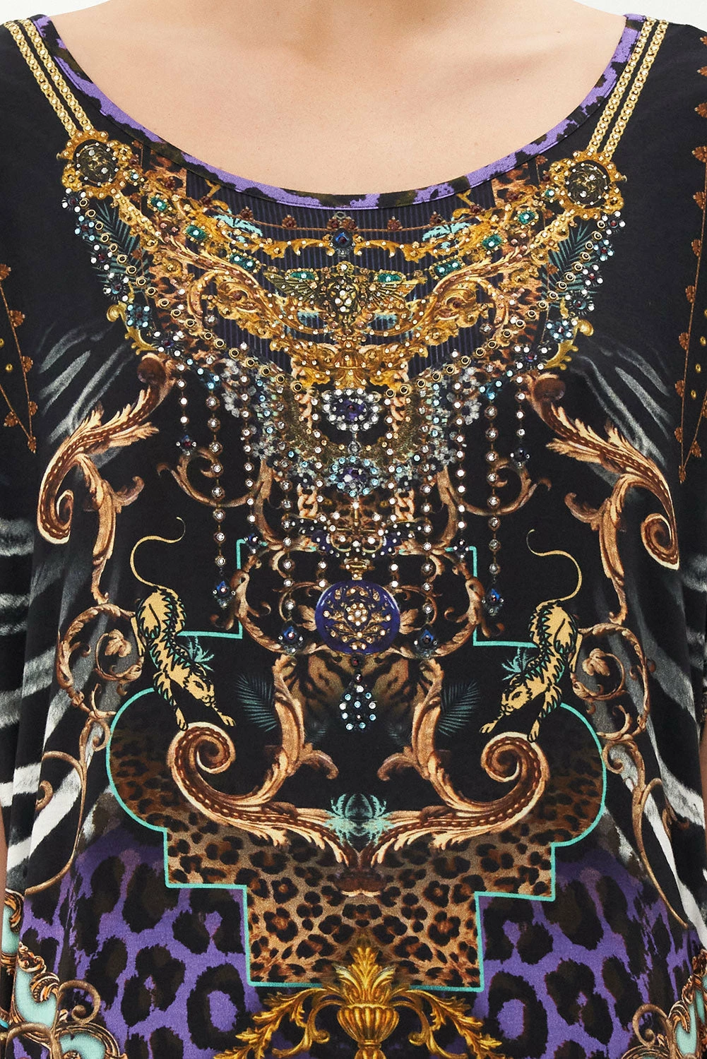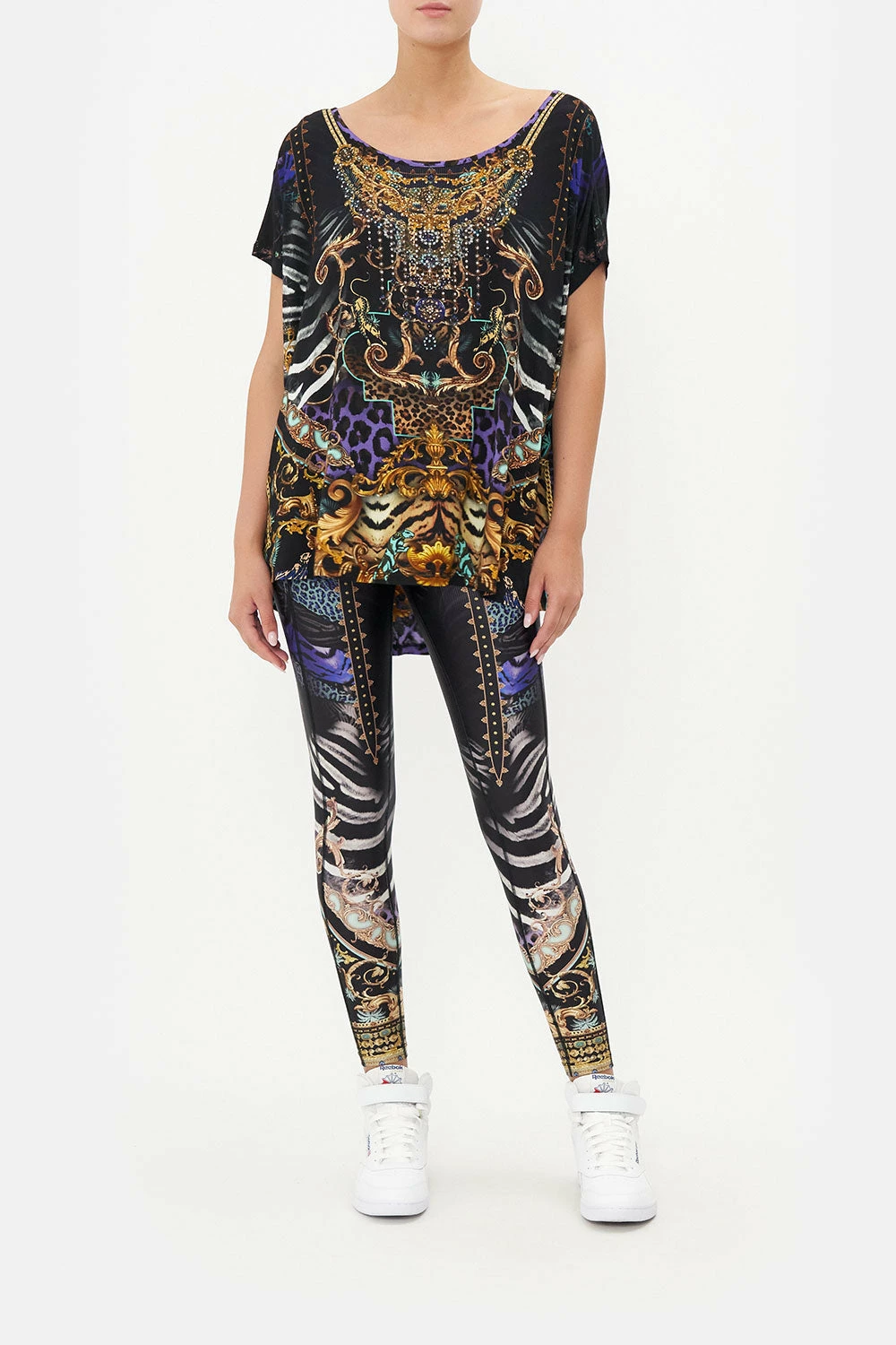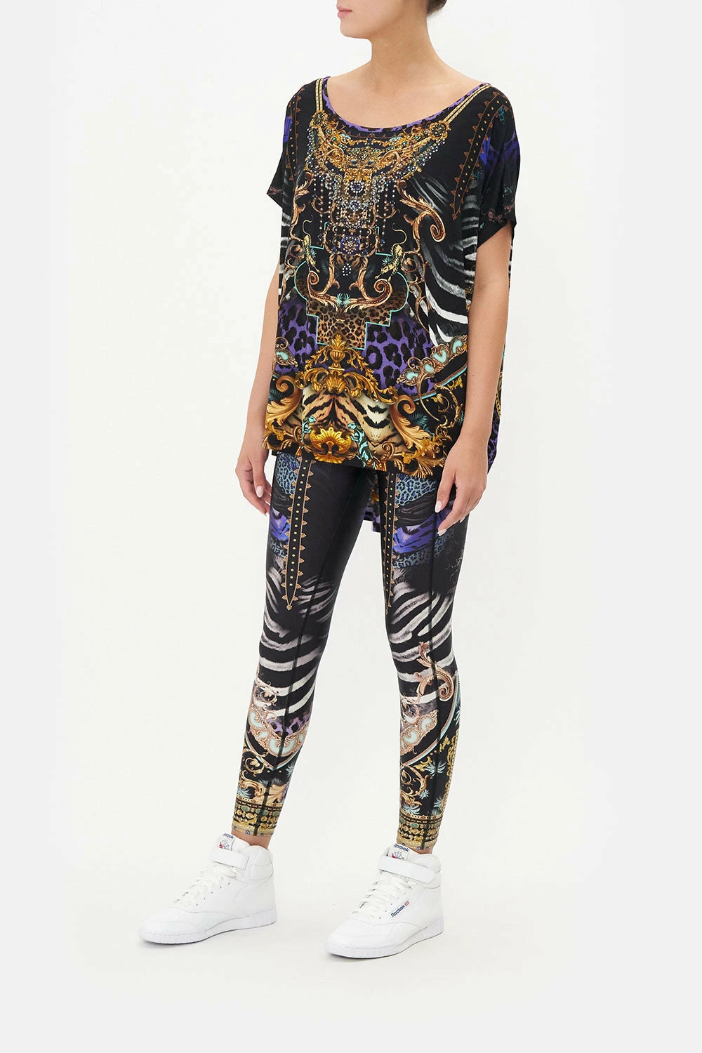 Luxe loungewear capturing our gaze with eighties odes, the She’s Got Grace Loose Fit Tee is enwrapped in a concoction of emerald hues and striking violet as classic leopard print and baroque details swirl alongside. Adorning hand-embellished CAMILLA crystals, this luxury tee plays host to cropped soft sleeves, a relaxed silhouette, a shaped high-low hemline and a rounded neckline.
