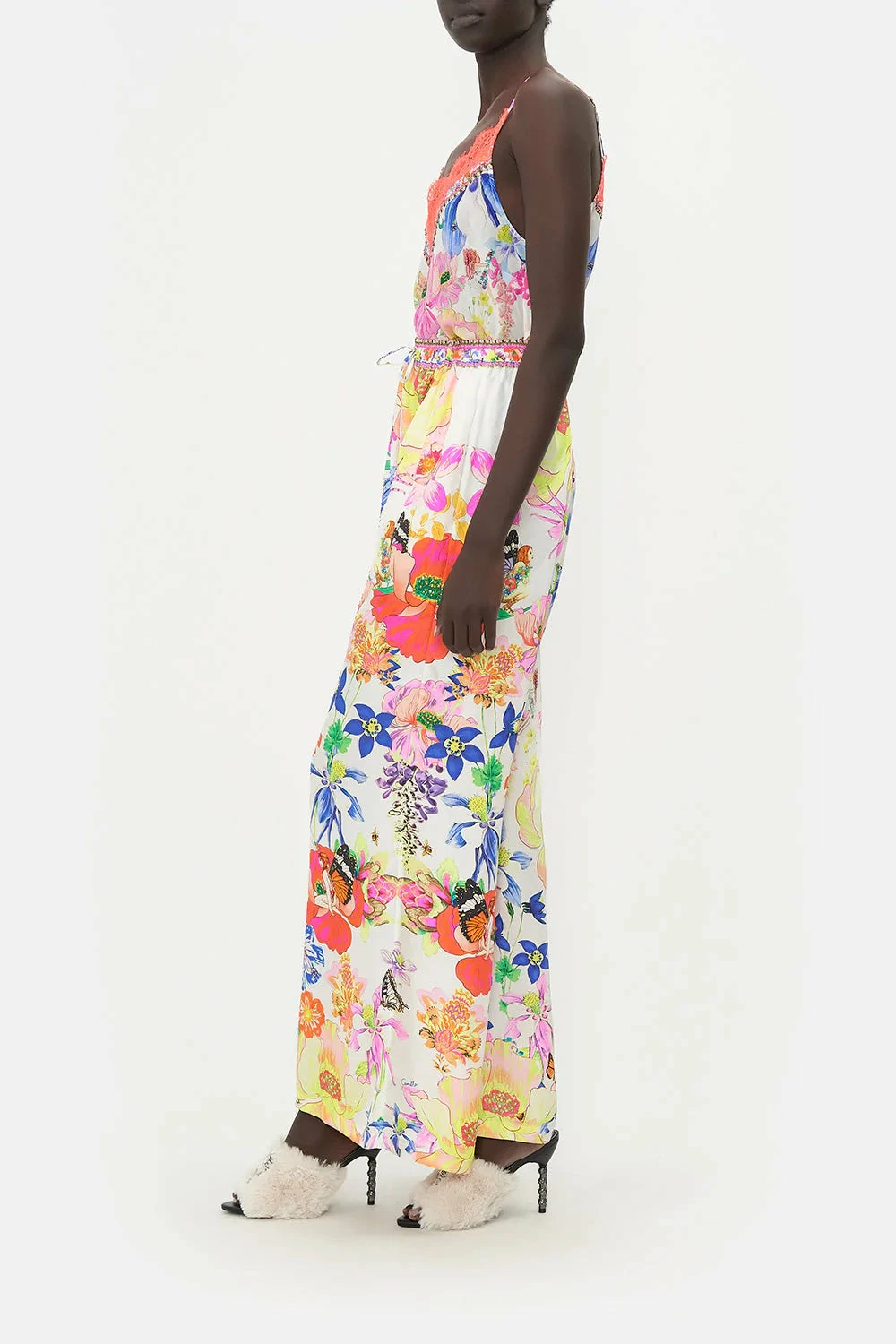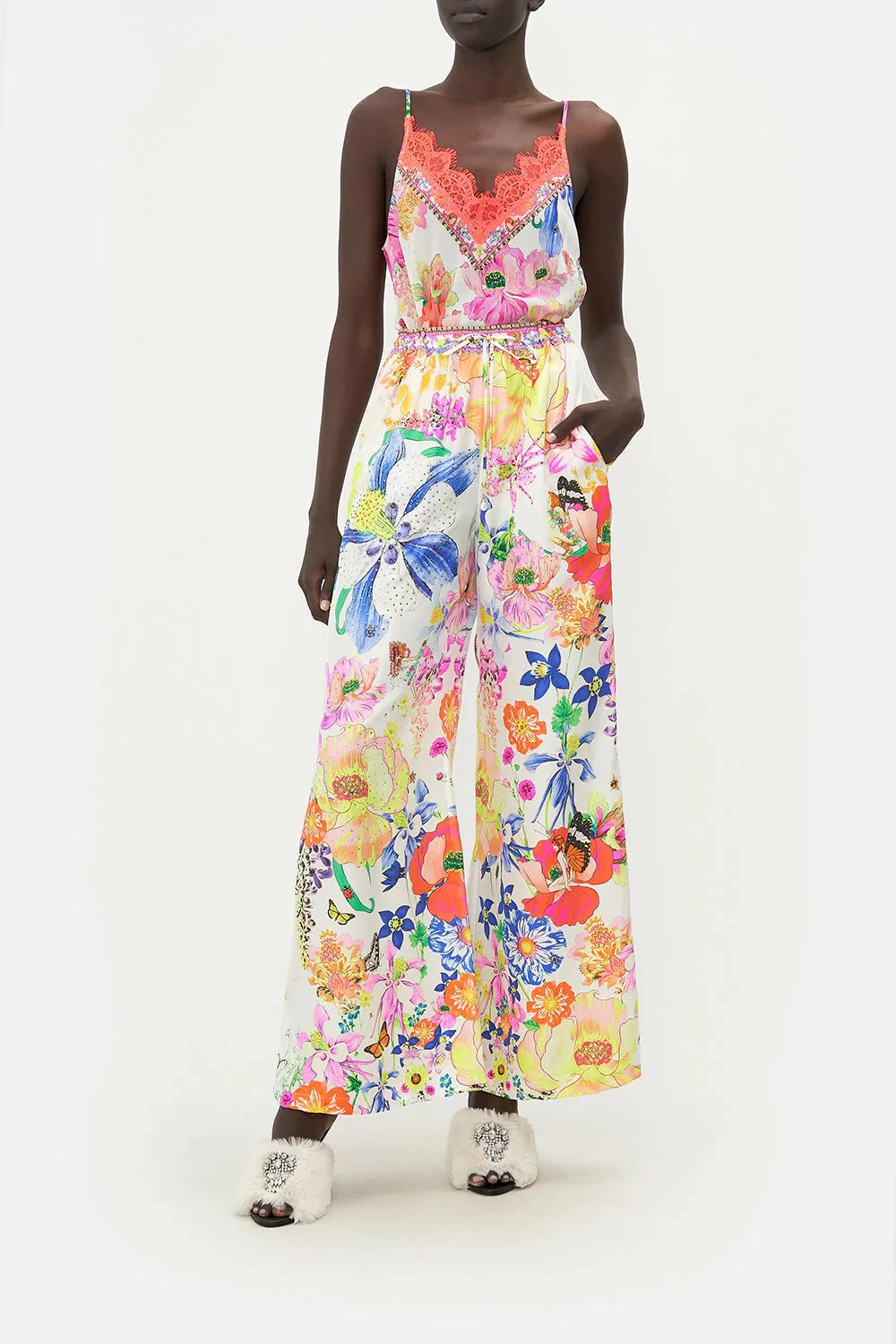 The Fairy Gang Lounge Pant captivates our gaze with poppies dipped in soft-spoken pinks, the feather-like flutter of butterflies amidst cascading baptisias and fairy majesties perched upon poetic petals. Crafted from lavish silk, these luxury pants play host to an elasticated drawstring waist that cinches and shapes your silhouette, a statement wide-leg pant emulating seventies sensations and subtle pocket detailing for effortless convenience.