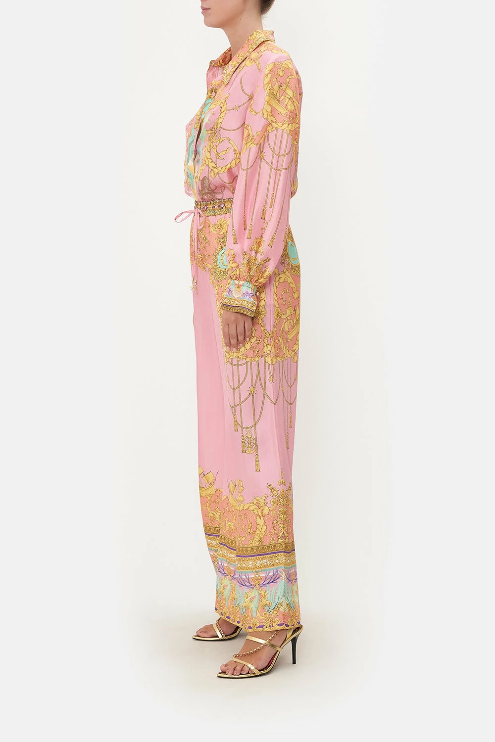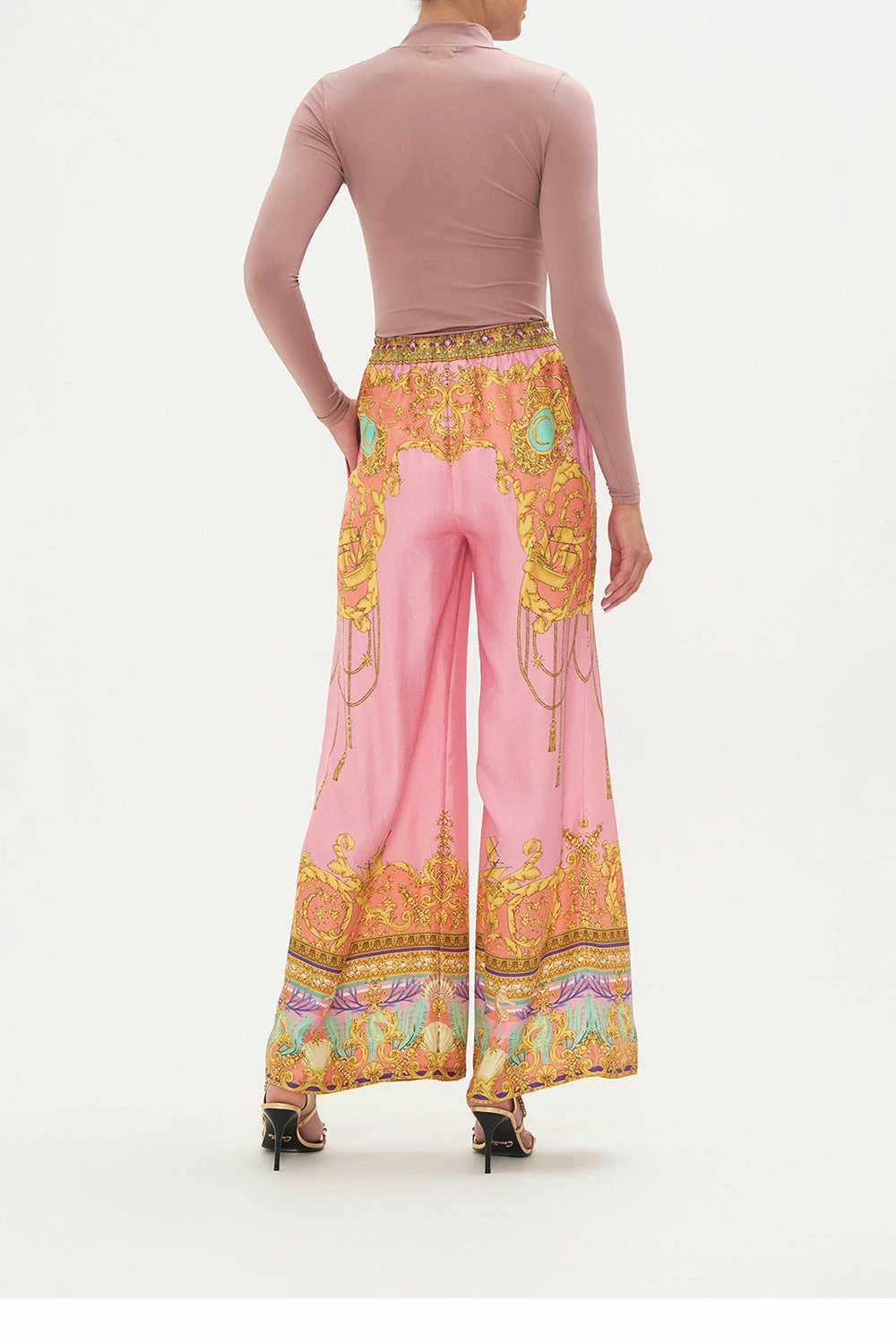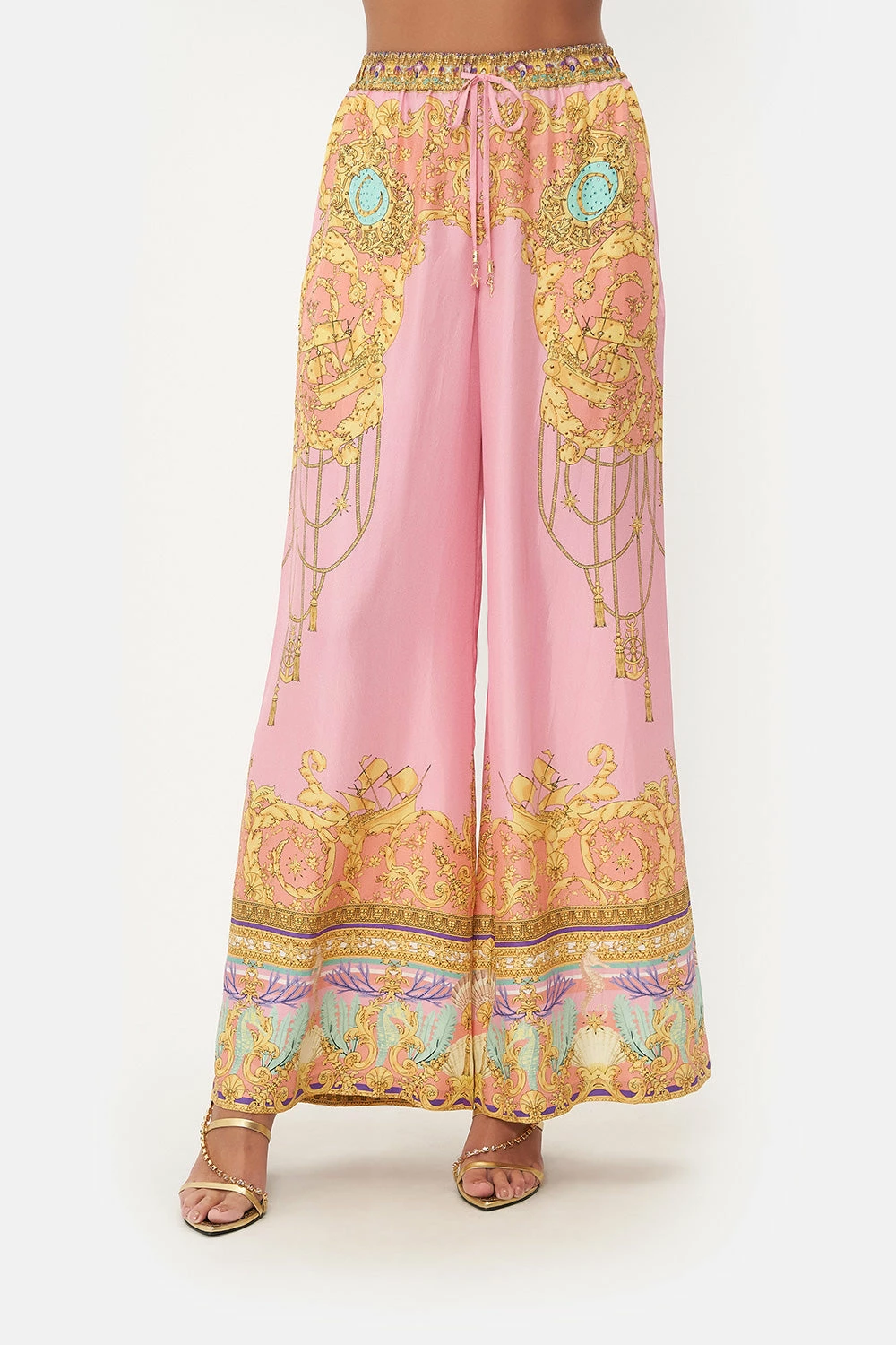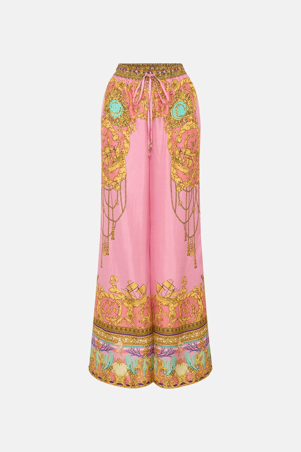 An elixir of everyday comforts and seabed majesties, the Mermaid Motel Lounge Pant is utterly encased in a delicate bubblegum pink adorning mermaid portraits, golden rope cascades, pops of celestial blues and treasures of the sea. Crafted from lavishly soft silk, this luxury palazzo pant features an elasticated drawstring waist to cinch and shape, gold hardware accents, pocket functionality and a relaxed wide leg pant.
