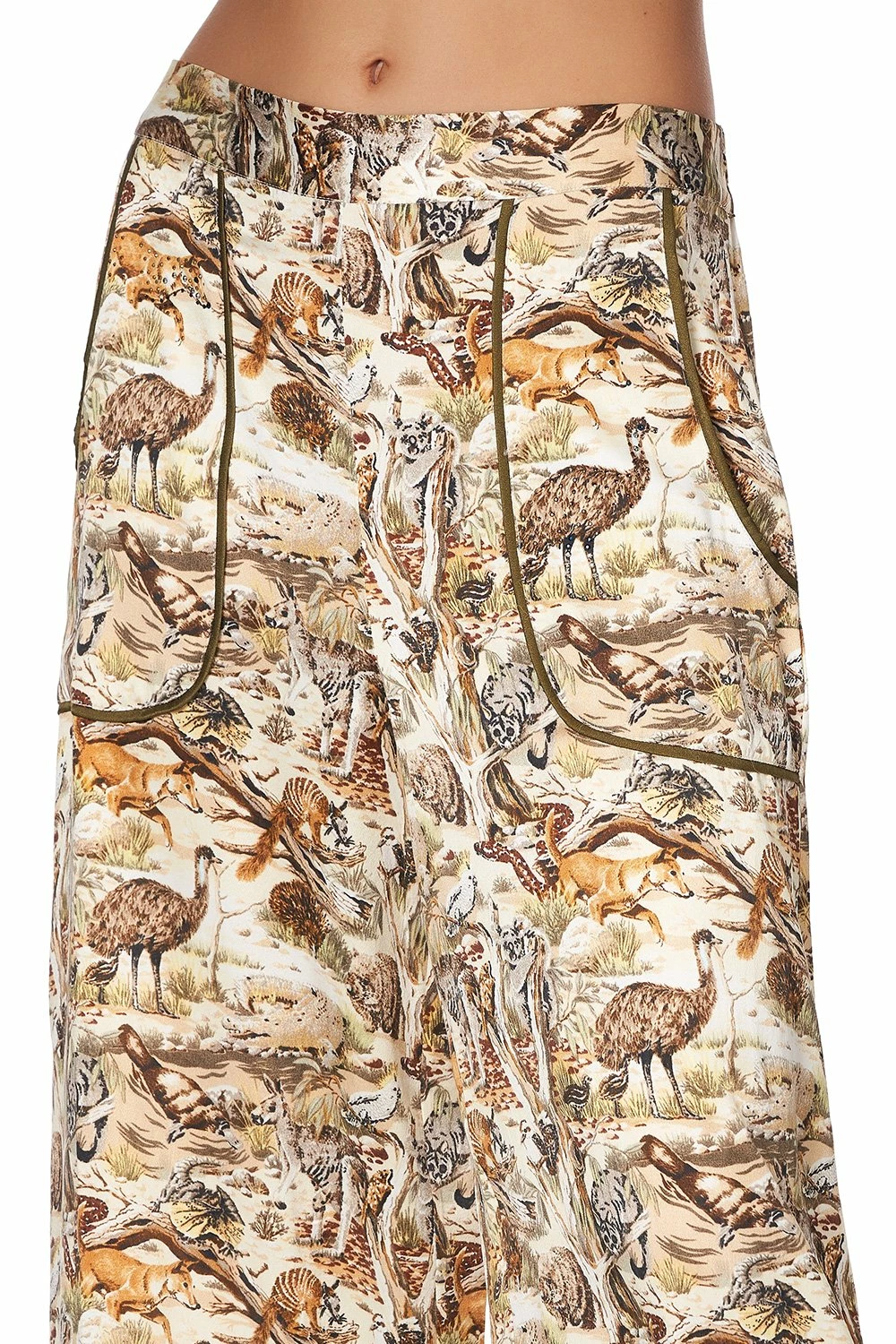 The Bush Doof Lounge Trousers with Cuffs is a retro chronicle that draws inspiration from Australia’s eclectic and lively wildlife. With emu, dingo and possum motifs – these silk pants feature a comfortable elasticated back waist, charming piping, digitally printed silk, as well as crystal embellishment as detail.