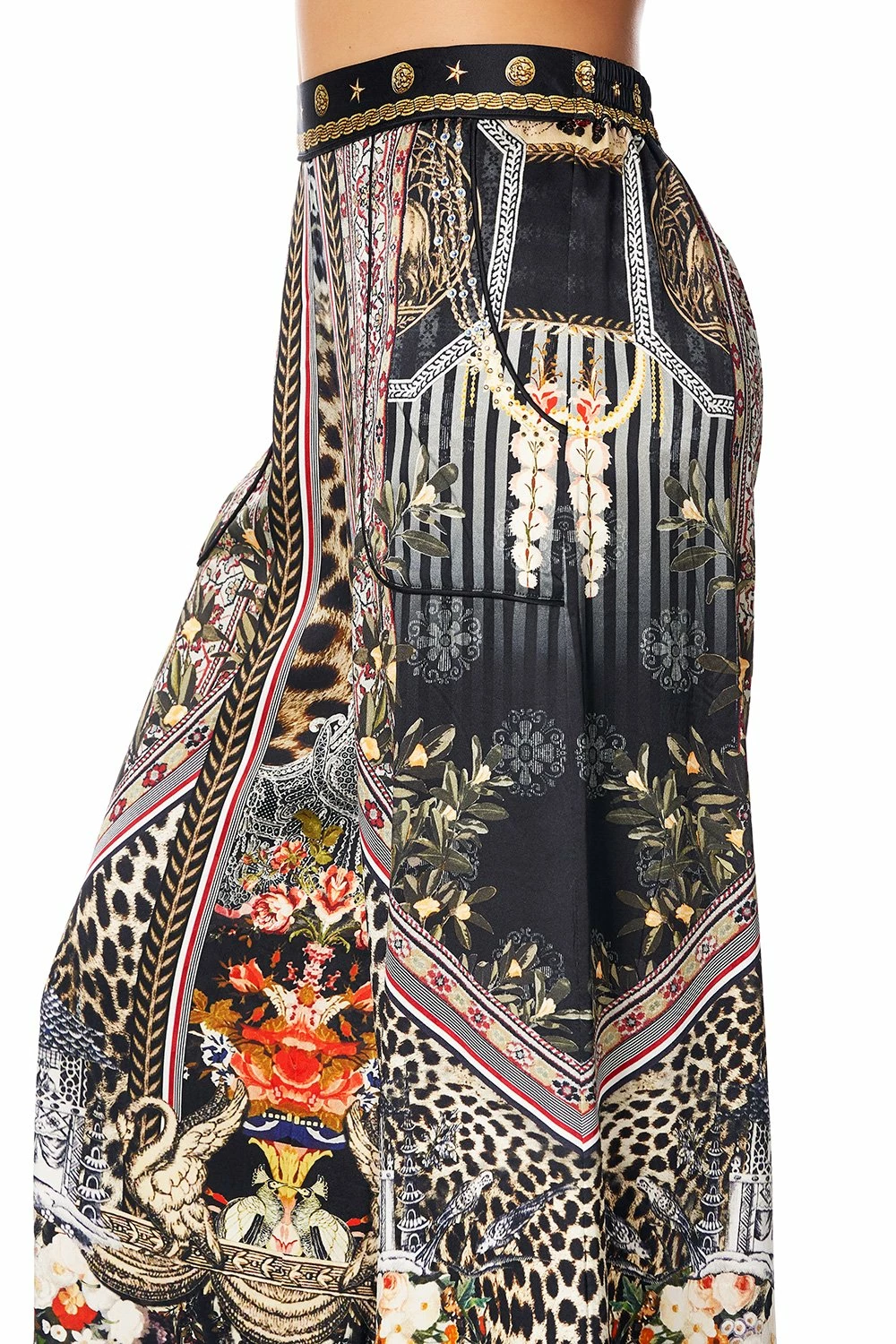 With golden highlights, bold leopard prints and floral flourishes – the Marais at Midnight Lounge Trousers with Cuffs celebrates the wild revelries that happen under the romantic Marais moon. These lavish printed pants feature an elasticated back waist for comfort, filled piping, digitally printed silk, as well as hand-placed crystals as detail.