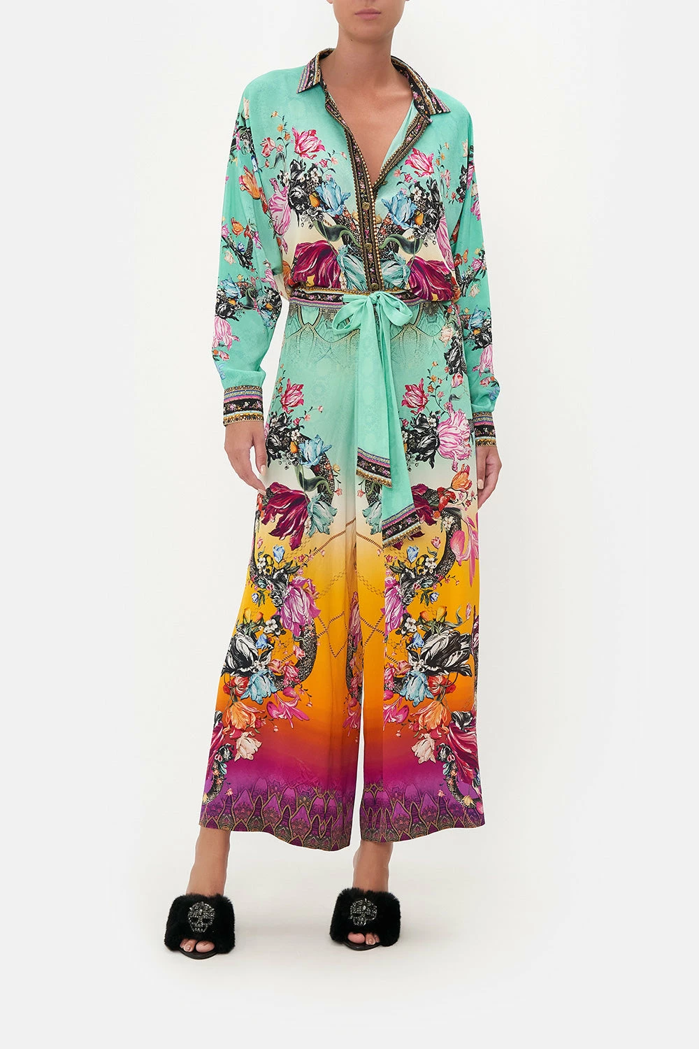 Reminiscent of vibrant sherbet skies, the Viper Room Lounge Trouser With Waist Tie explores a sea of teal and sunset tones adorning blush botanicals, gold chain indulgence and the fierce silhouette of the snake in rich hues. Crafted from signature CAMILLA silk, these luxury palazzo pants feature a relaxed silhouette, a wide-leg pant, pocket functionality and an elasticated tie waist to cinch and shape with comfort in mind.