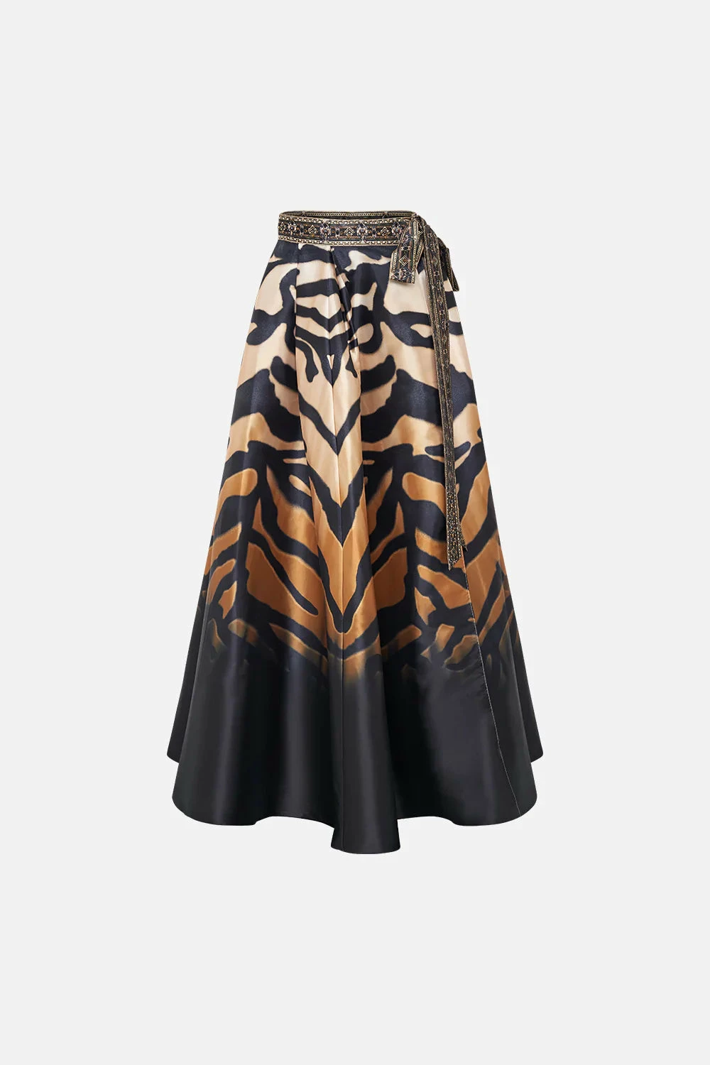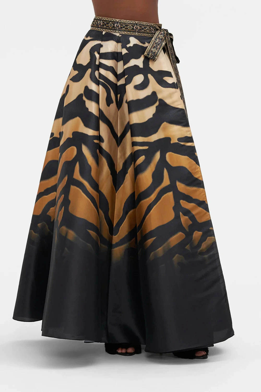 The Tame My Tiger Maxi Wrap Skirt was born to turn heads with a mosaic of deep midnight hues adorning striking tiger stripes wrapped in soft creams and caramels. Designed for vivacious volume, this statement maxi skirt plays host to a cinching wrap waist that is adorned in hand-embellished crystals, a classic A-line silhouette that falls to a flared hemline and pockets that greet the sides.