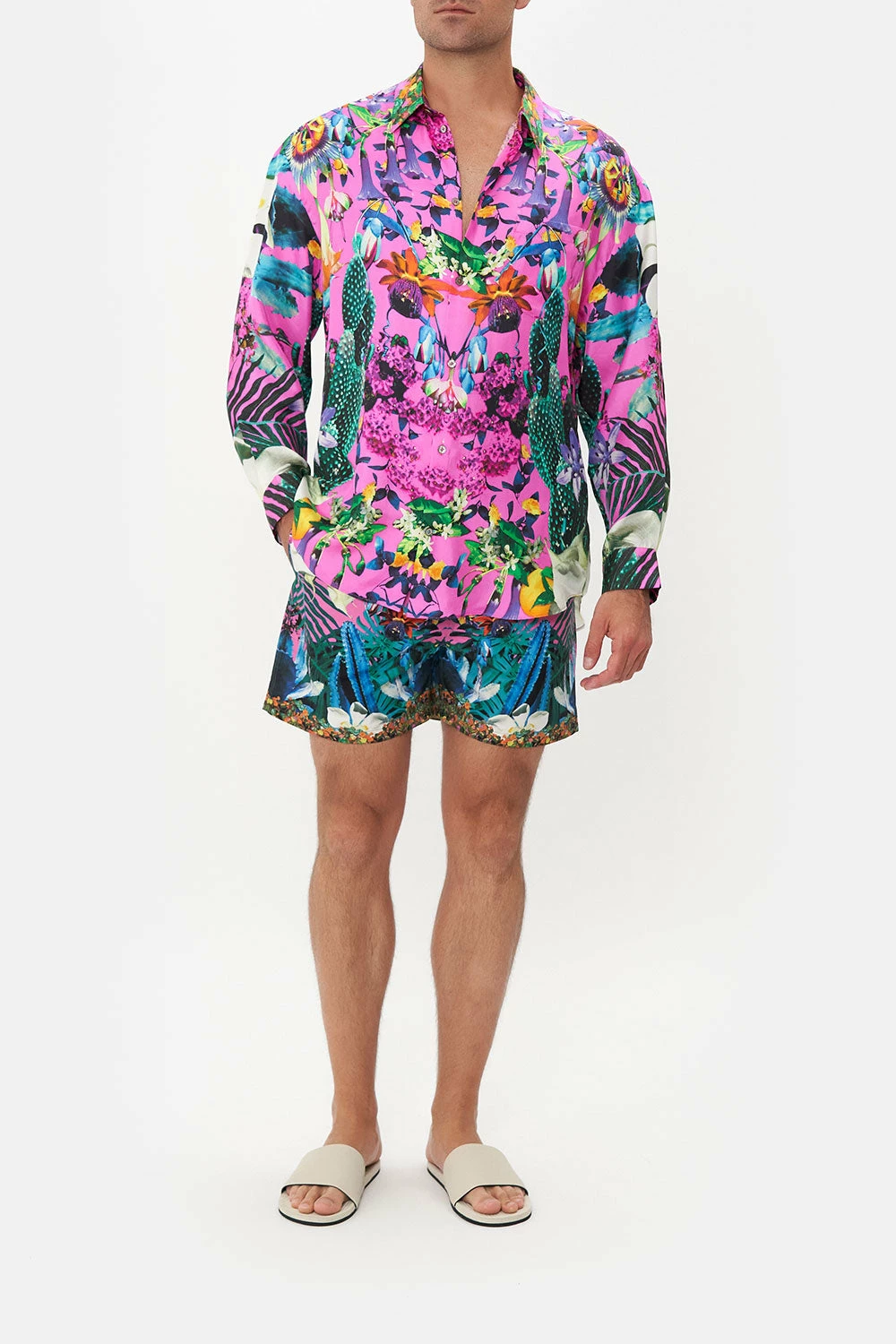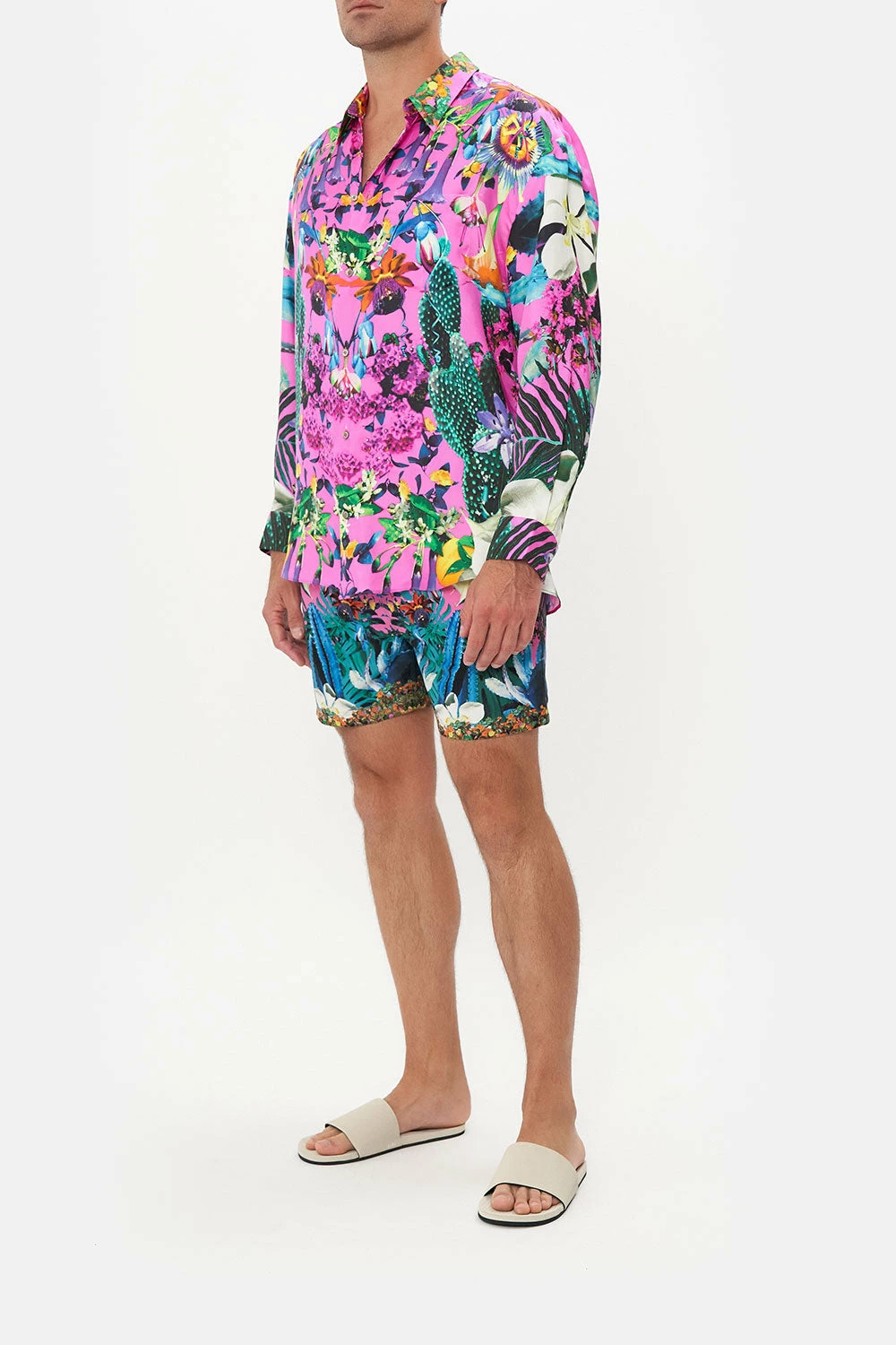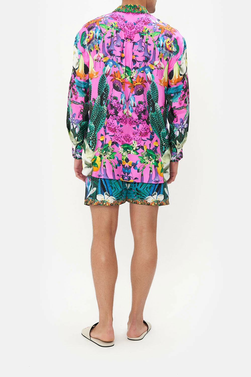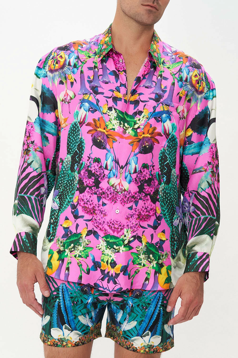 Inserting a splash of extravagance to your elevated essentials, the Exotica Erotica Mens Oversized Shirt captures the imagination with a striking pink enveloped in emerald-dipped cacti, lavender-soaked bluebells and exotic botanical cascades. Crafted to blur the lines between casual and occasion, this luxury men’s shirt features a structured collar, a curved hemline, yoking upon the back and a relaxed oversized silhouette.