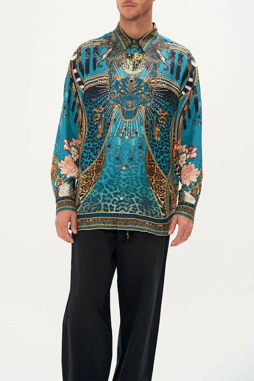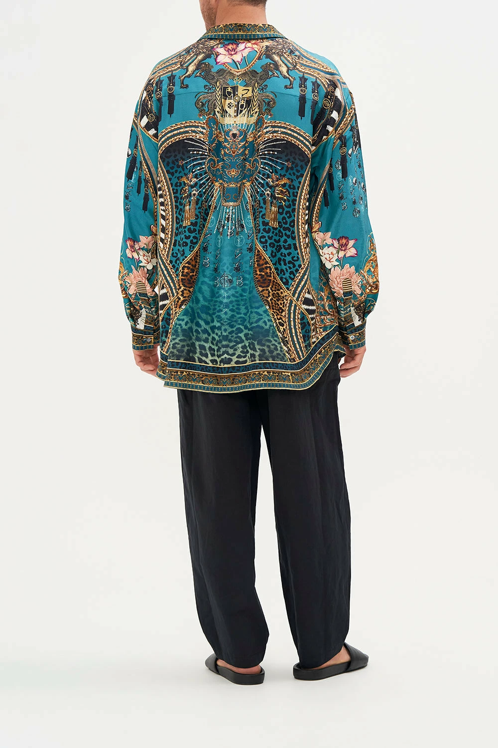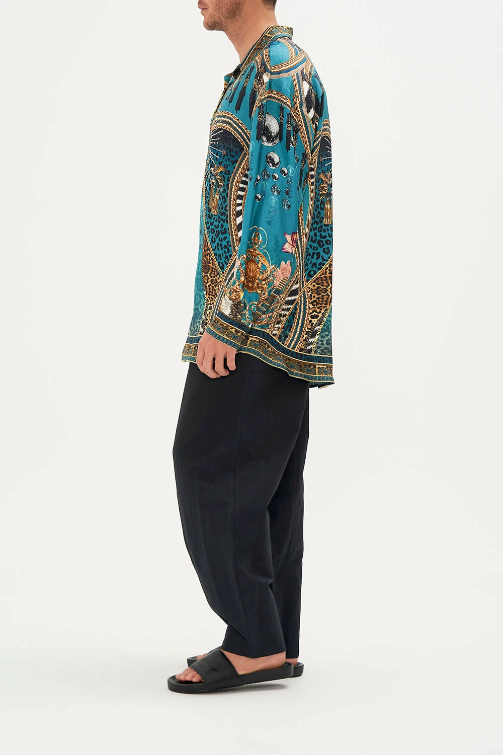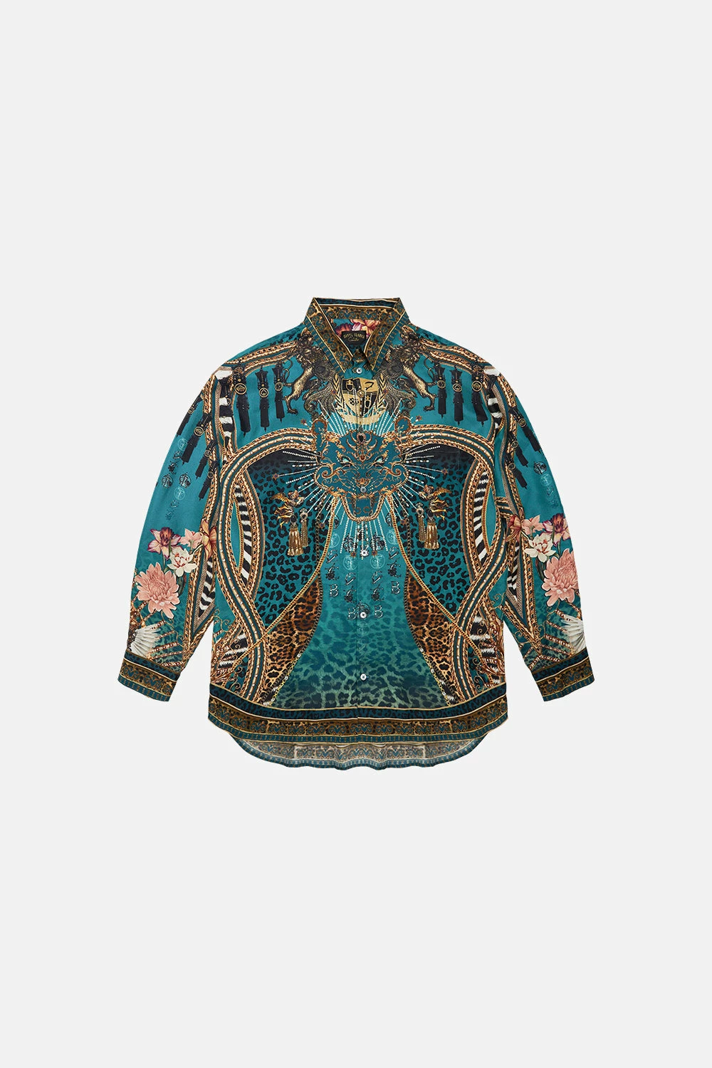 Exclusive to our CAMILLA x Robbie Williams collection, the Tiger Pants Mens Oversized Shirt captures the imagination with a rich teal hue encased in splashes of classic leopard print, bouquets of soft-spoken botanicals and ornate gold architecture that dances amidst ivory featherings. Crafted from silk, this luxury men’s shirt features a structured collar, a curved hemline, yoking upon the back and a relaxed oversized silhouette.