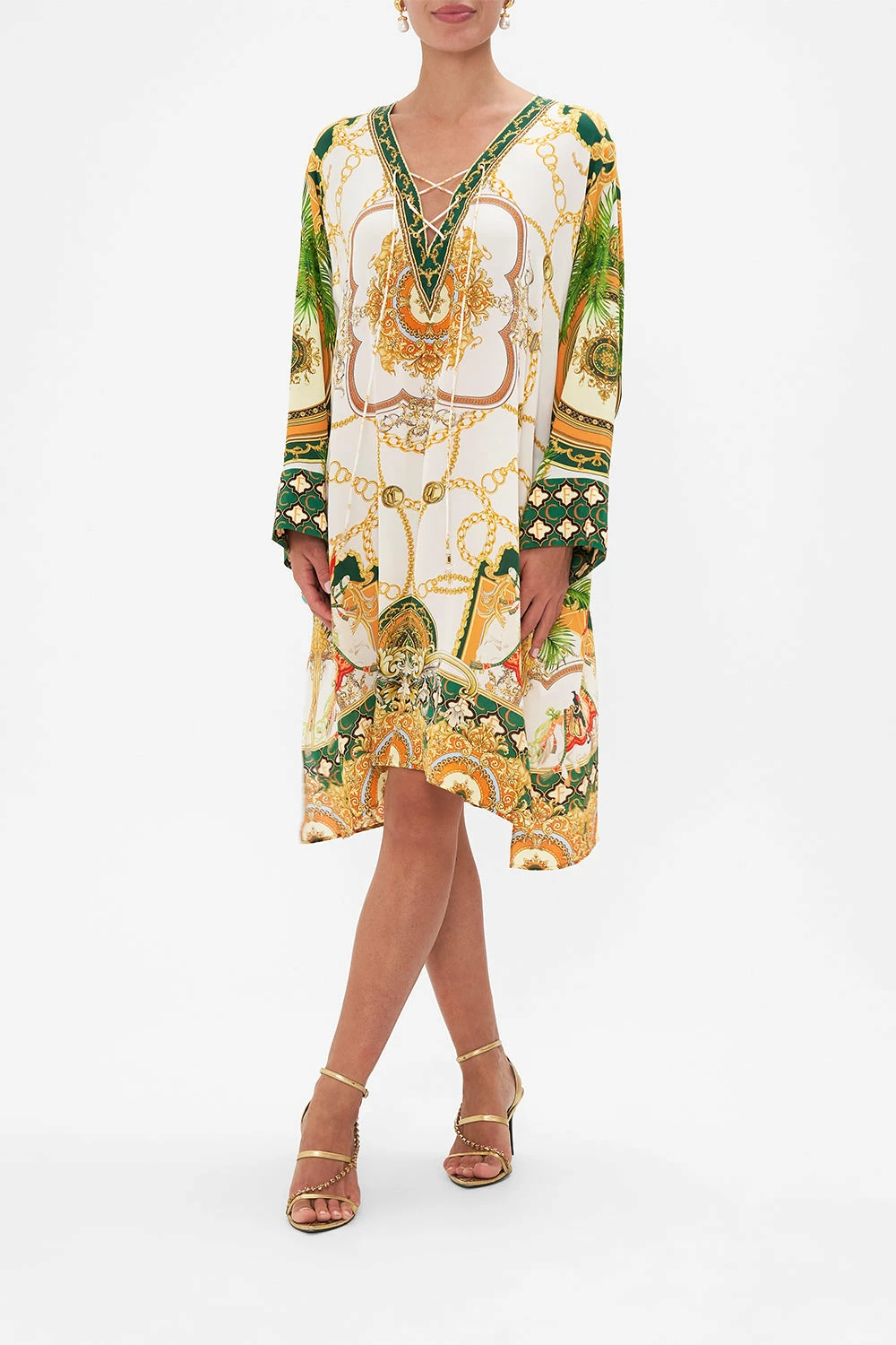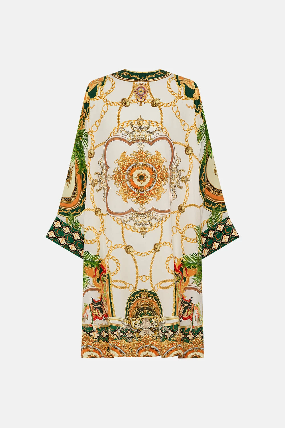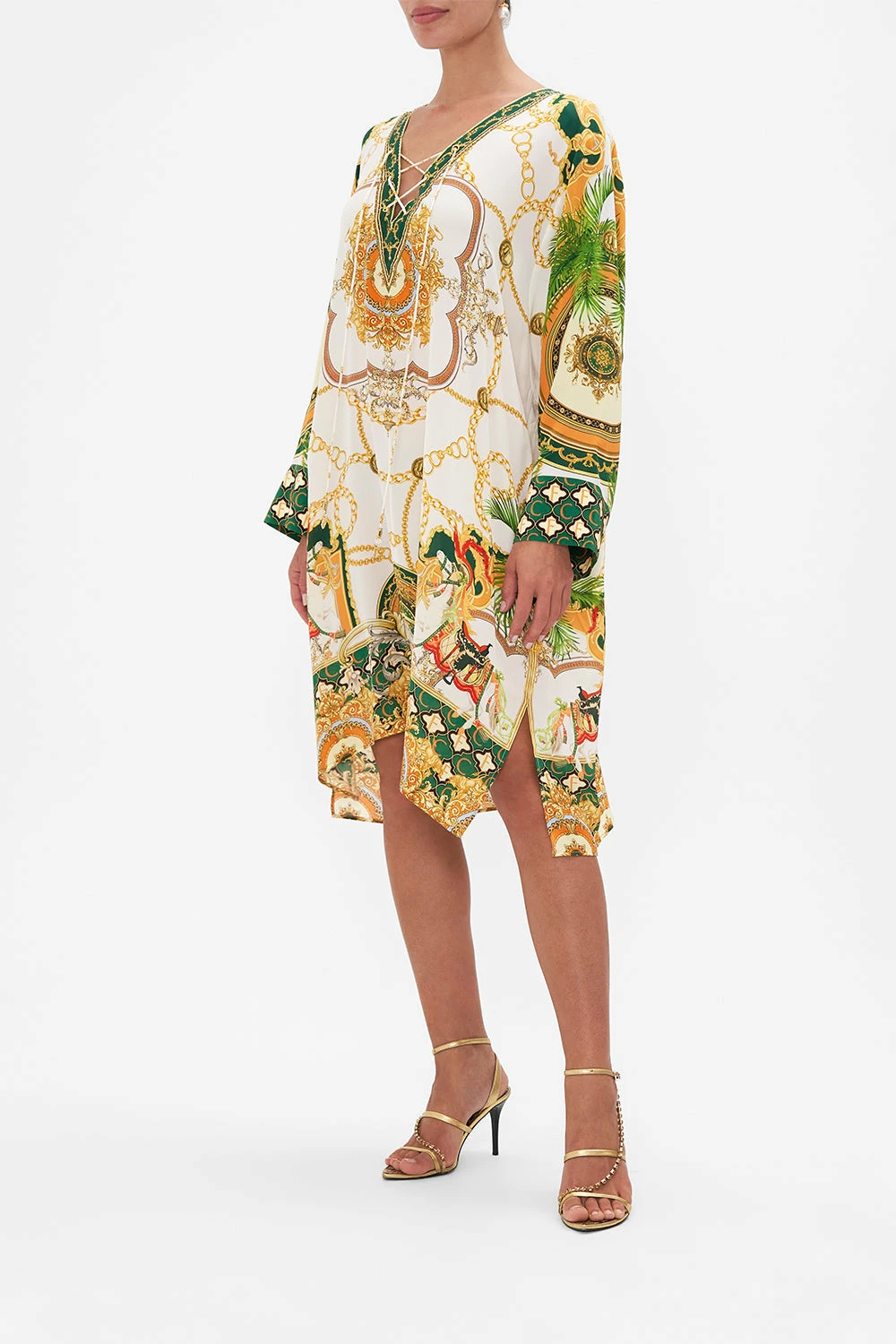 My Sweet Devotion Metal Eyelet Kaftan glides into a world of elegant palatial curves boldly outlined in geometric mosaics. Gold regal motifs dance in amongst lions and stallions, intertwined with golden chains and lush emerald green foliage against porcelain white. Adorned with hand-embellished crystals, this luxury silk kaftan is home to a timeless v neckline with decadent eyelet lace up detail, softly flared sleeves and a relaxed maxi silhouette that dances at ankle length with side splits for elegant flow in movement. Lovingly handcrafted and designed in Australia, explore more from The Moral Of The Story: Act II collection.