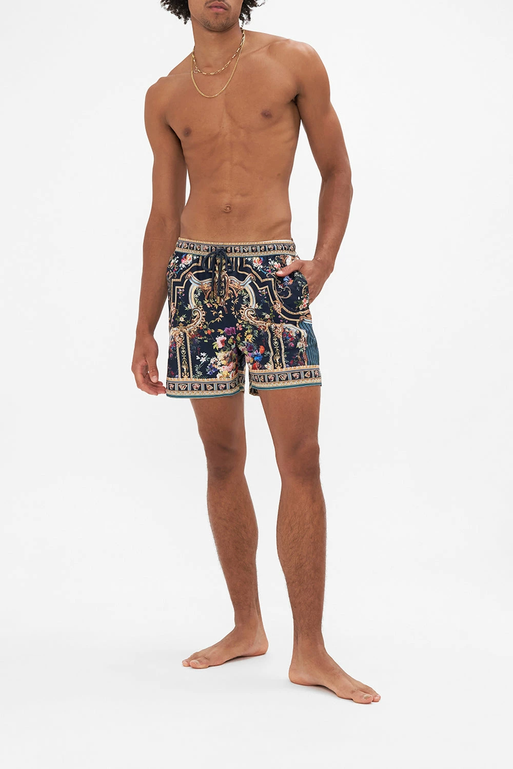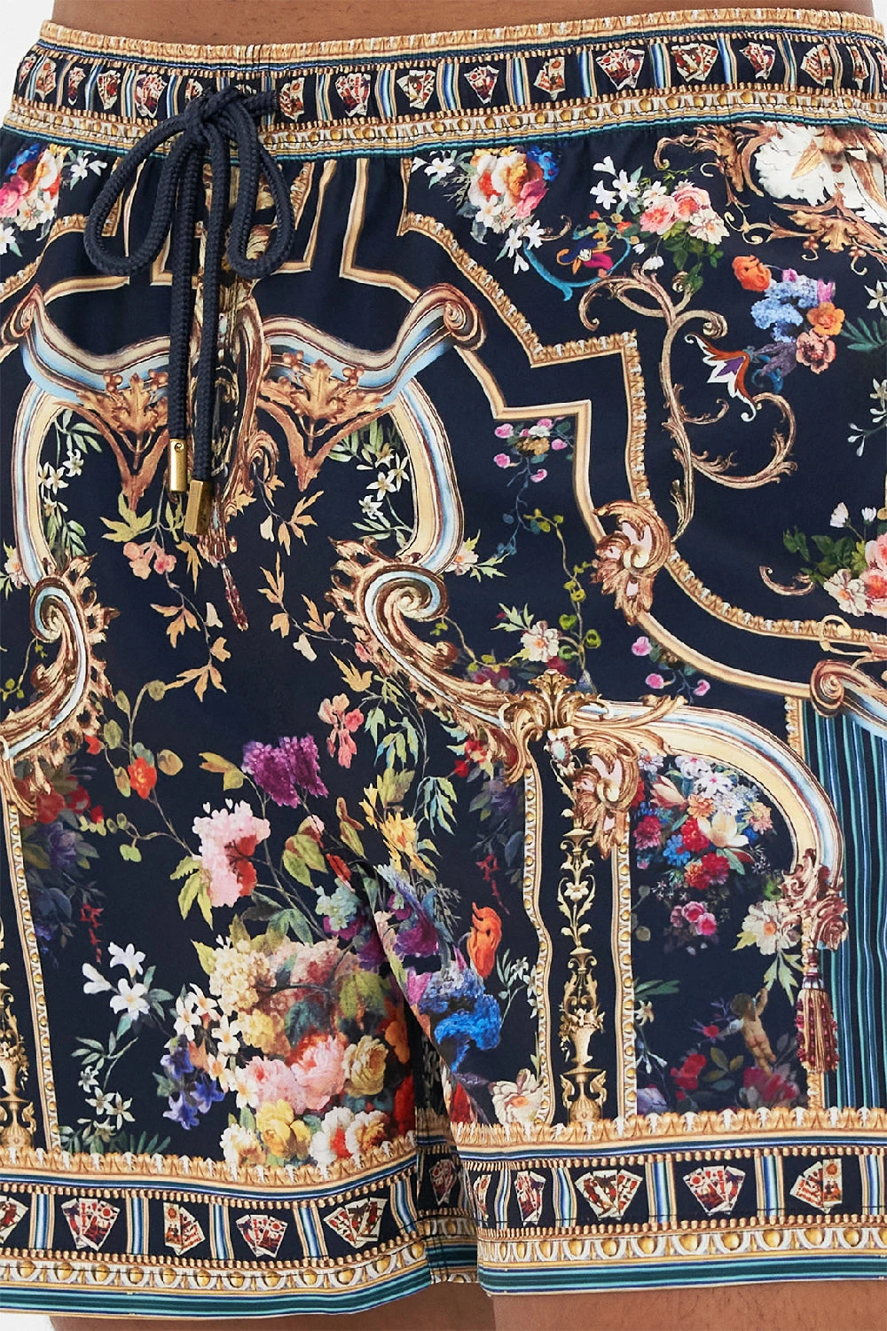 The Play Your Cards Right Mid Length Board Short emulates the grandiose halls of the Hotel Villa Cora. A gilded realm of old world opulence laced in fragrant florals and golden flourishes. Crafted from 100% recycled polyester, these luxury men’s swim shorts sport an elasticated drawstring waist, secure zip pocket functionality and a tapered fit that falls into an effortlessly relaxed silhouette. Pair With the Play Your Cards Right Short Sleeve Camp Collared Shirt for luxe co-ord styling. Lovingly handcrafted, designed in Australia. Explore more from the Amore Mio collection.