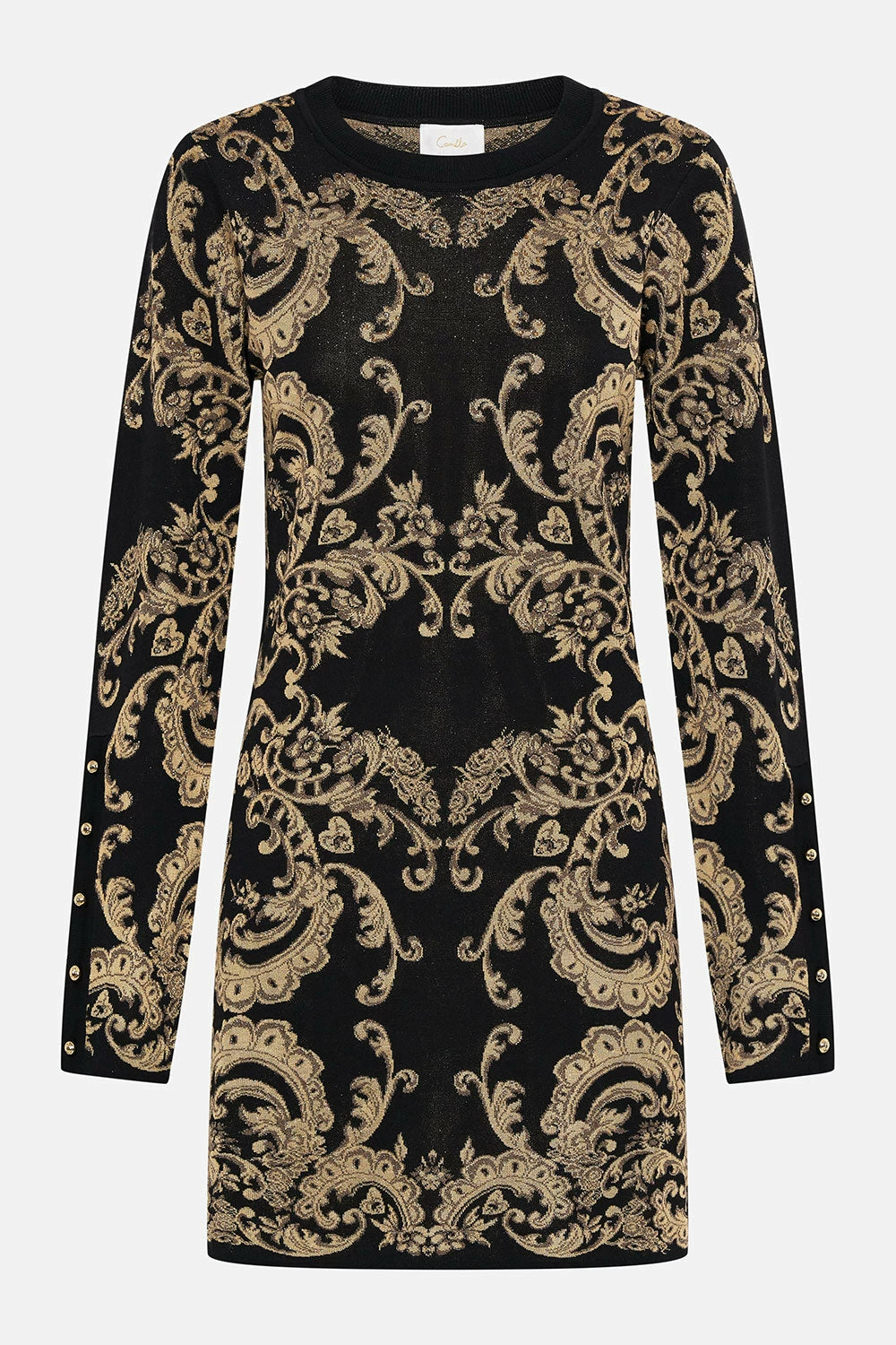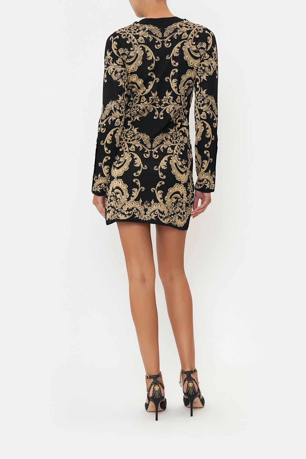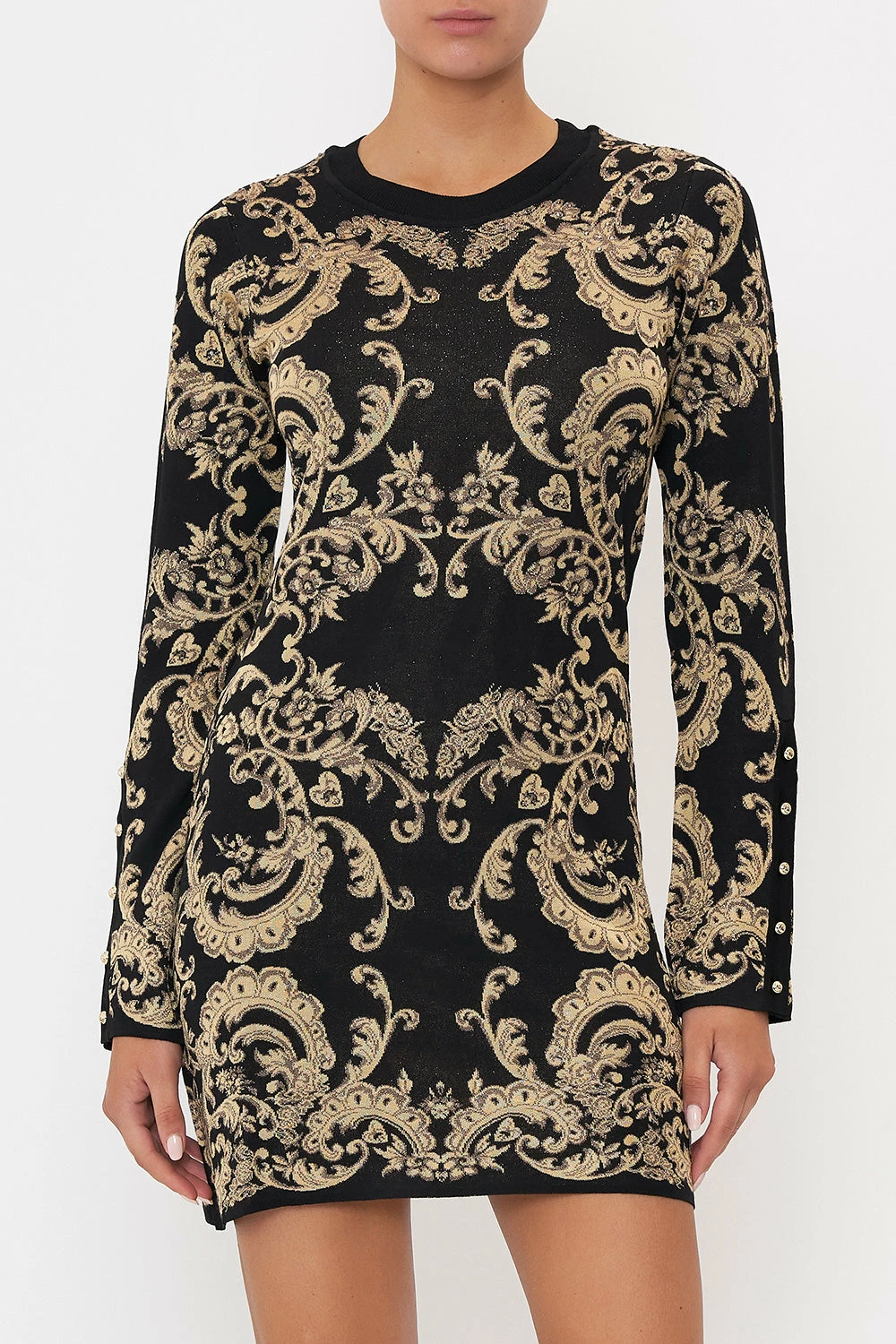 Reminiscent of starry nights and baroque accents, the Dance With Duende Mini Knit Dress explores a world of deep midnight hues adorned with metallic thread detailing and ornate golden accents. Complete with hand-embellished CAMILLA crystals, this luxury knit mini dress features a rounded neckline, a cropped hem, full-sleeves and a soft fitted silhouette.