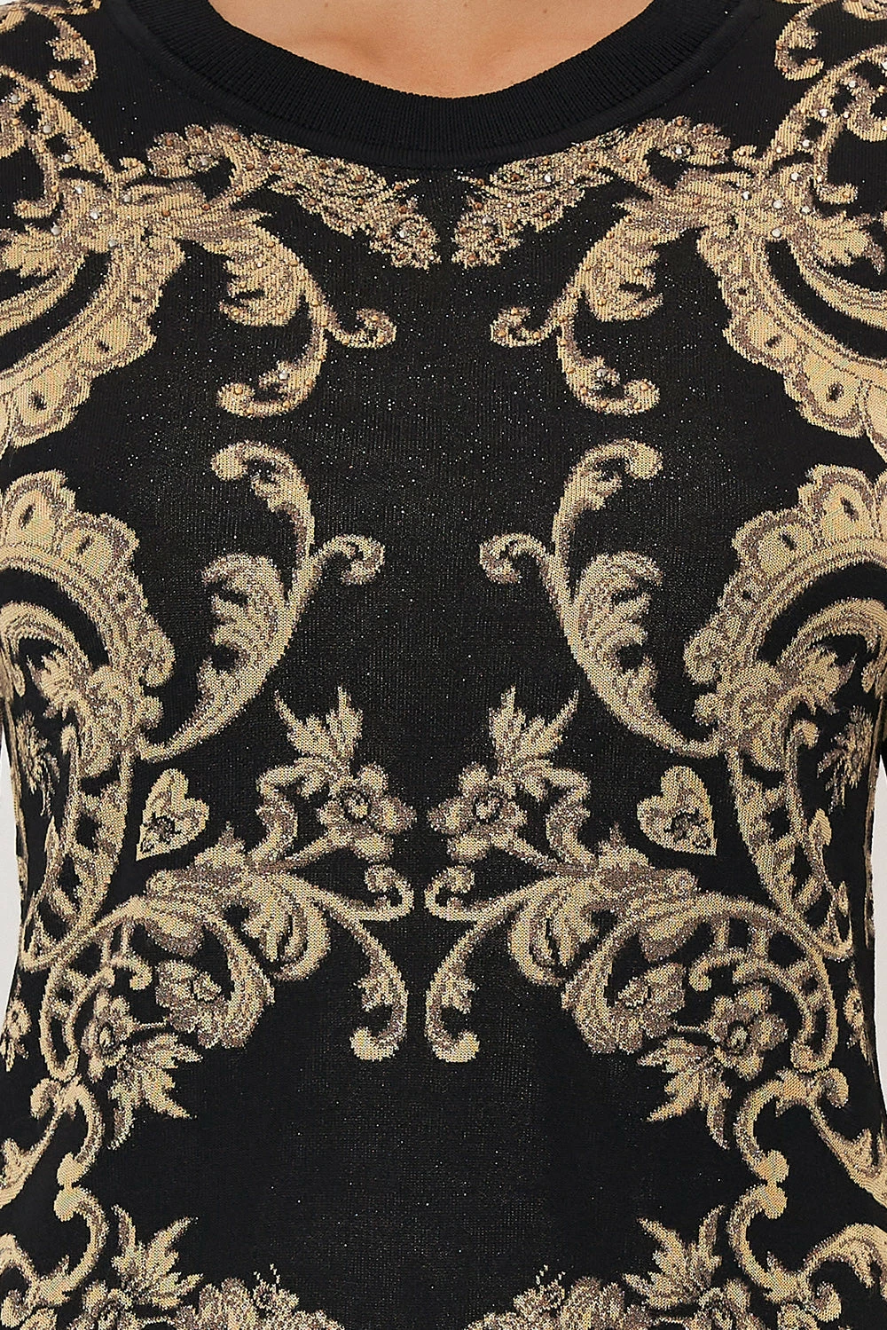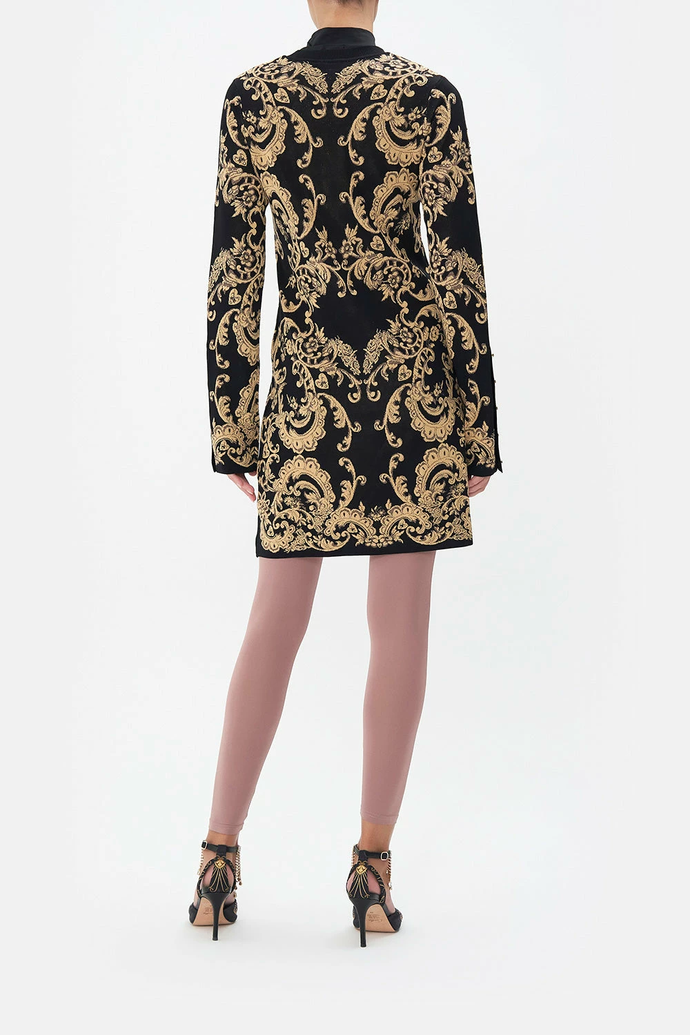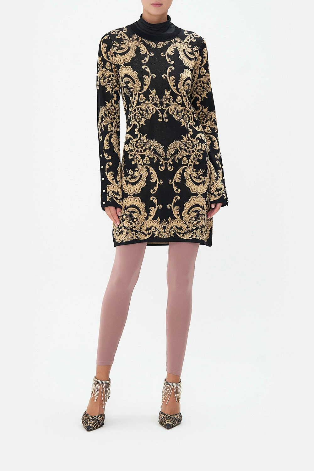 Reminiscent of starry nights and baroque accents, the Dance With Duende Mini Knit Dress explores a world of deep midnight hues adorned with metallic thread detailing and ornate golden accents. Complete with hand-embellished CAMILLA crystals, this luxury knit mini dress features a rounded neckline, a cropped hem, full-sleeves and a soft fitted silhouette.