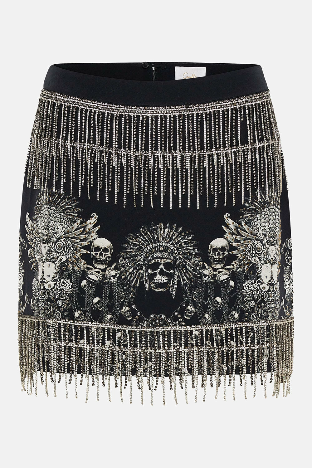 Adding a moment of extravagance to tantalising lengths, the Order Of Disorder Mini Skirt is enveloped by a deep shade of midnight adorning ivory-dipped skulls, metallic chain details and wispy featherings. Adorned with hand-embellished crystal cascades, this luxury silk mini skirt plays host to a high-rise cut that elongates the legs, invisible zip fastening, a cropped length and fringe detailing.