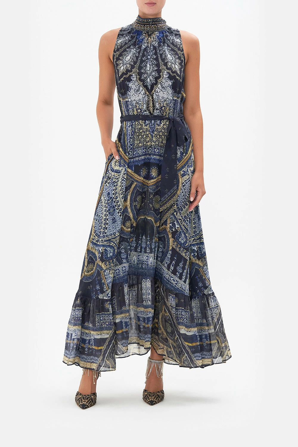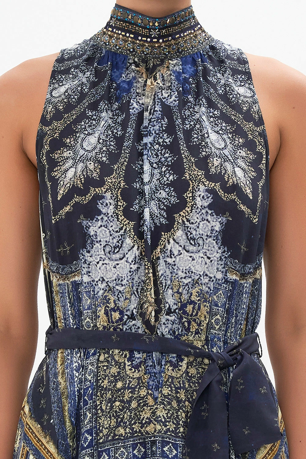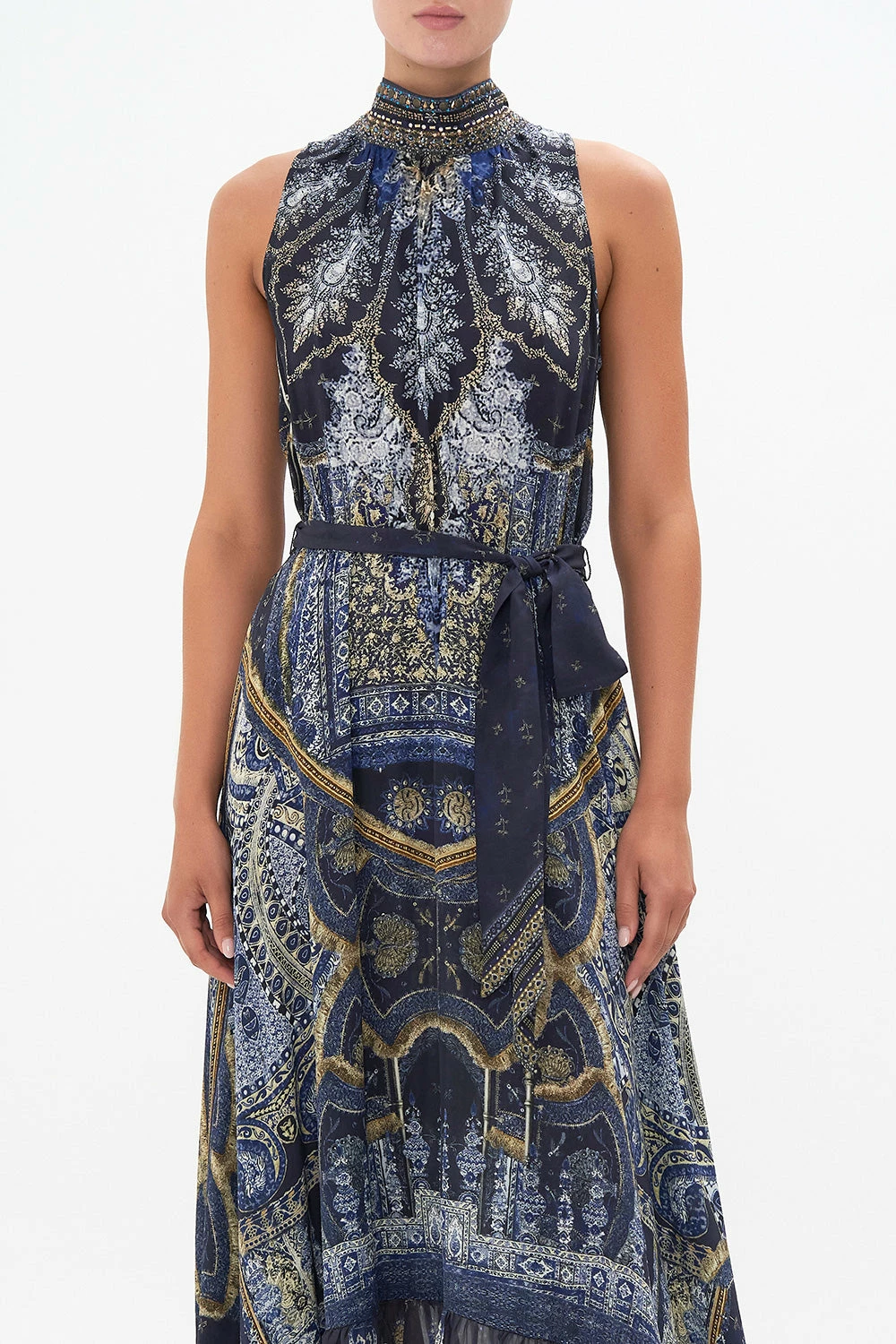 Melting classic hues upon the intricacies that lace the architecture of India, the Forever Family Necktie Dress With Elasticated Waist is enveloped in a deep navy hue as ornate golden details arch their way around mosaics of ethereal amulets. Crafted from signature CAMILLA silk, this luxury dress features a high neckline, a shaped maxi hemline, hand-embellished crystals and an elasticated waist to cinch and shape.