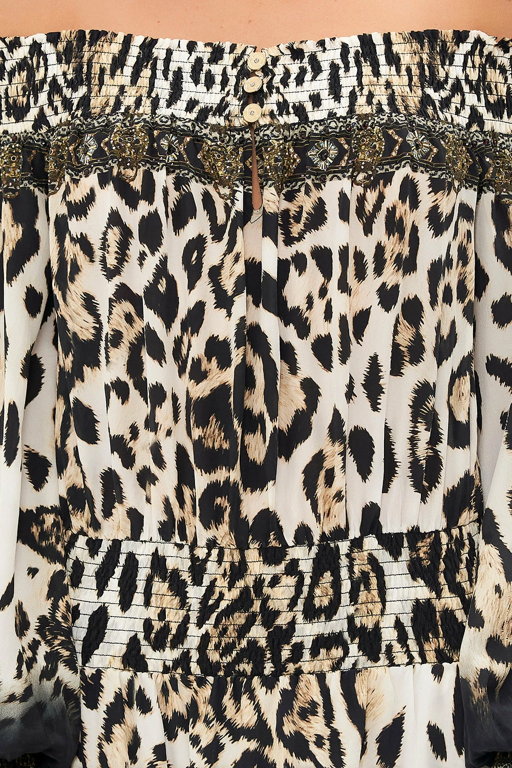 The Cool For Cats Off Shoulder Short Dress melts an intricate mosaic of timeless leopard print wrapped in sensational hues of ivory and mocha alongside eclipsing moments of cream and midnight. Adorned with hand-embellished crystals, this luxury silk dress features shirring at the off-shoulder neckline, waist and cuffs to cinch and shape, a billowed mini silhouette finished with a delicately soft blouson sleeve and golden hardware accents.