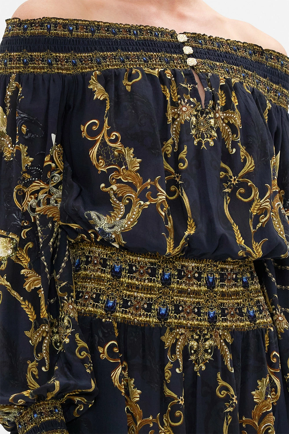 The Moonlight Melodies Off Shoulder Short Dress delves into an arrangement of gold and deep ebony flourishes highlighted with strands of chains, pearls and diamond motifs. Complete with hand-embellished crystals, this luxurious silk dress highlights the decolletage with shirring along the off-shoulder neckline, shirring at the waist and cuffs to cinch and shape the body throughout the billowed mini silhouette and delicately soft blouson sleeves add a flirty feminine touch. Lovingly handcrafted and designed in Australia, explore more from The Moral Of The Story: Act II collection.