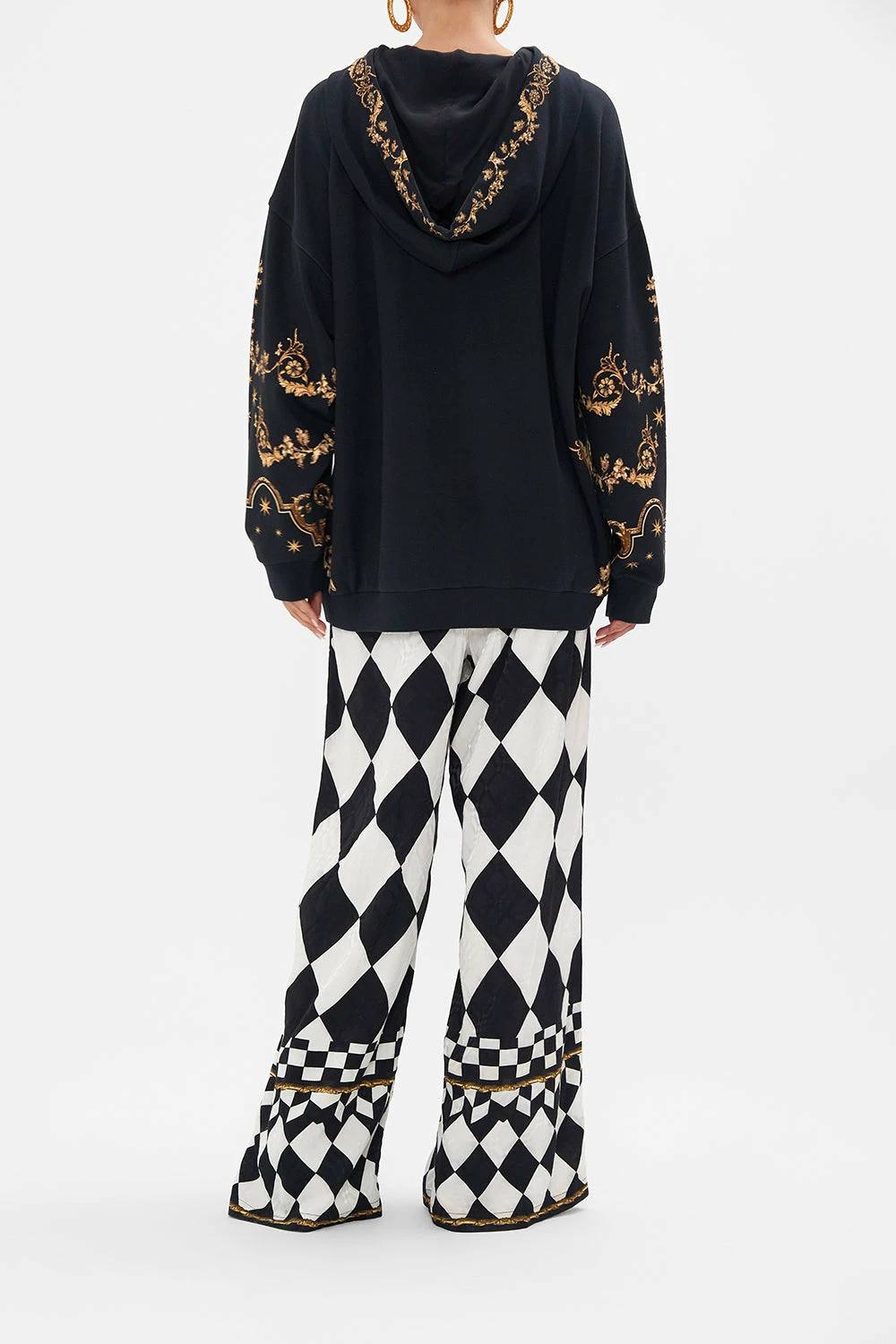 The Duomo Dynasty Oversized Boyfriend Hoodie is a symphony of sculptural palatial curves. A striking mosaic of onyx and gold highlights the glimmering gold charms and royal crests imbued in myth and magic. Adorned with shimmering crystals, this luxury oversized hoodie features a drawstring hood with gold hardware tassels, relaxed fit, and ribbed details at the cuffs and hem. Create a luxe lounge look with the Duomo Dynasty Leggings .Lovingly handcrafted, designed in Australia. Explore more from the Amore Mio collection.