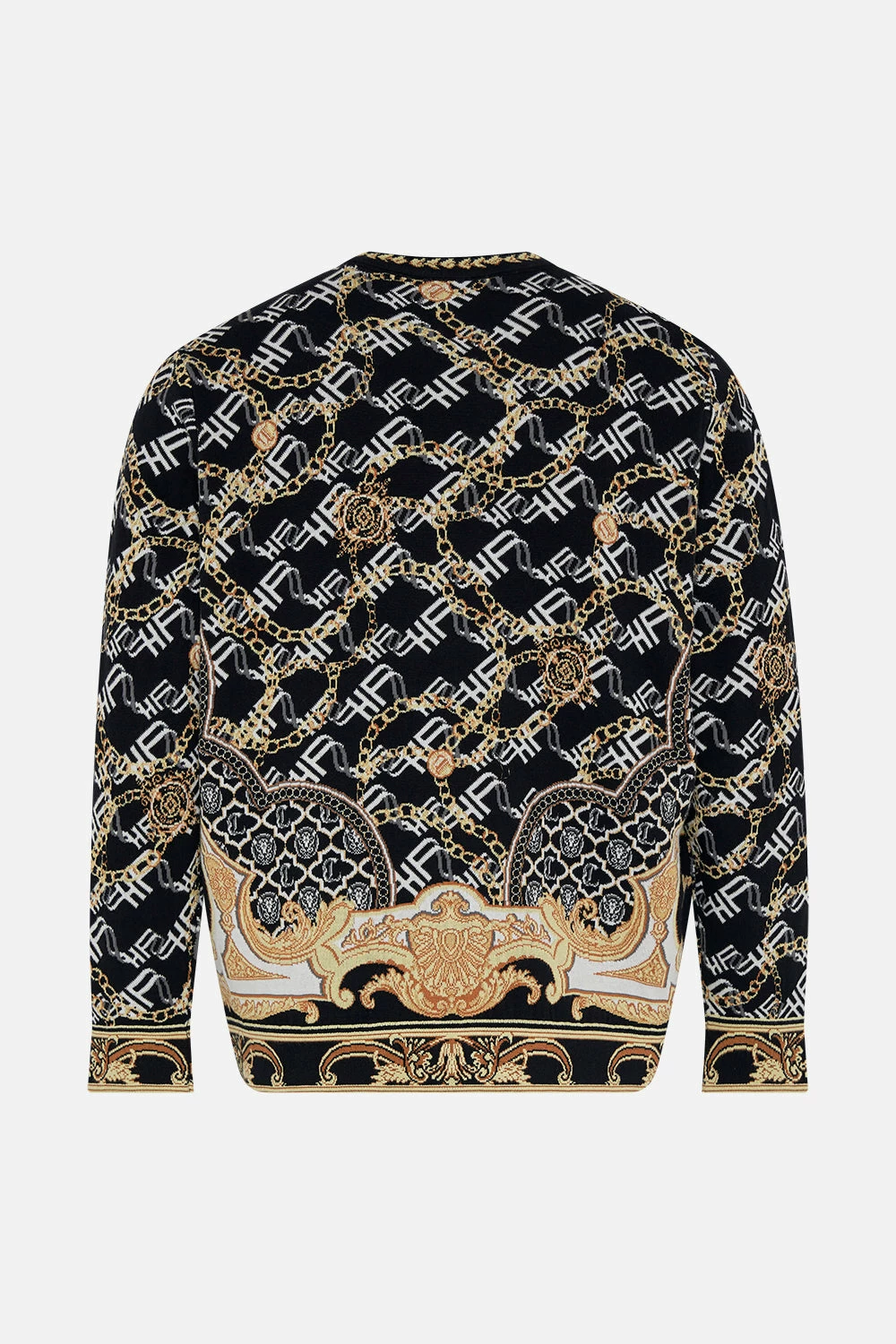 The Tether Me Not Oversized Knitted Sweater is an immersion into an opulent world of sleek palatial curves, offset with sharp monogram mosaics. Gilded baroque adornments and chains glimmer against graphically bold onyx and ivory contrasts. Crafted from lavish CAMILLA jacquard, this luxury men’s sweater features full-length tapered sleeves, a relaxed silhouette, contrast trims and a classic rounded neckline. Lovingly handcrafted, designed in Australia, explore more from The Moral Of The Story: Act II collection.