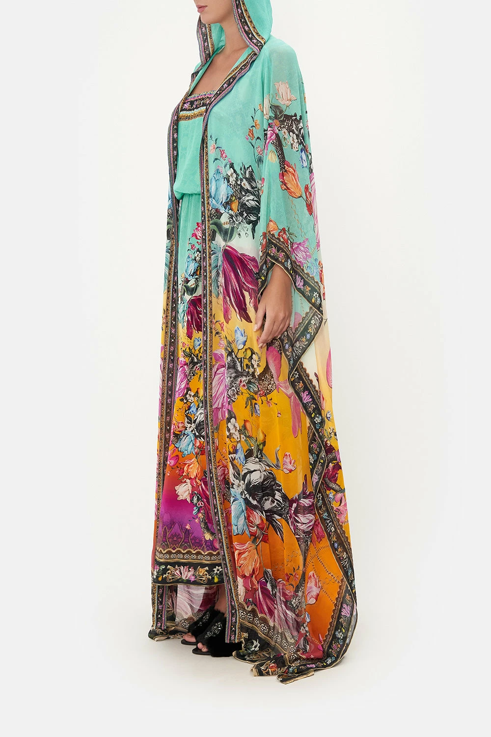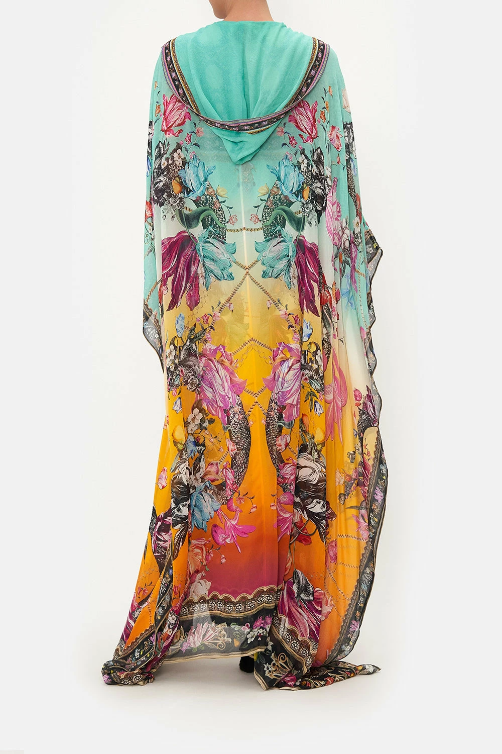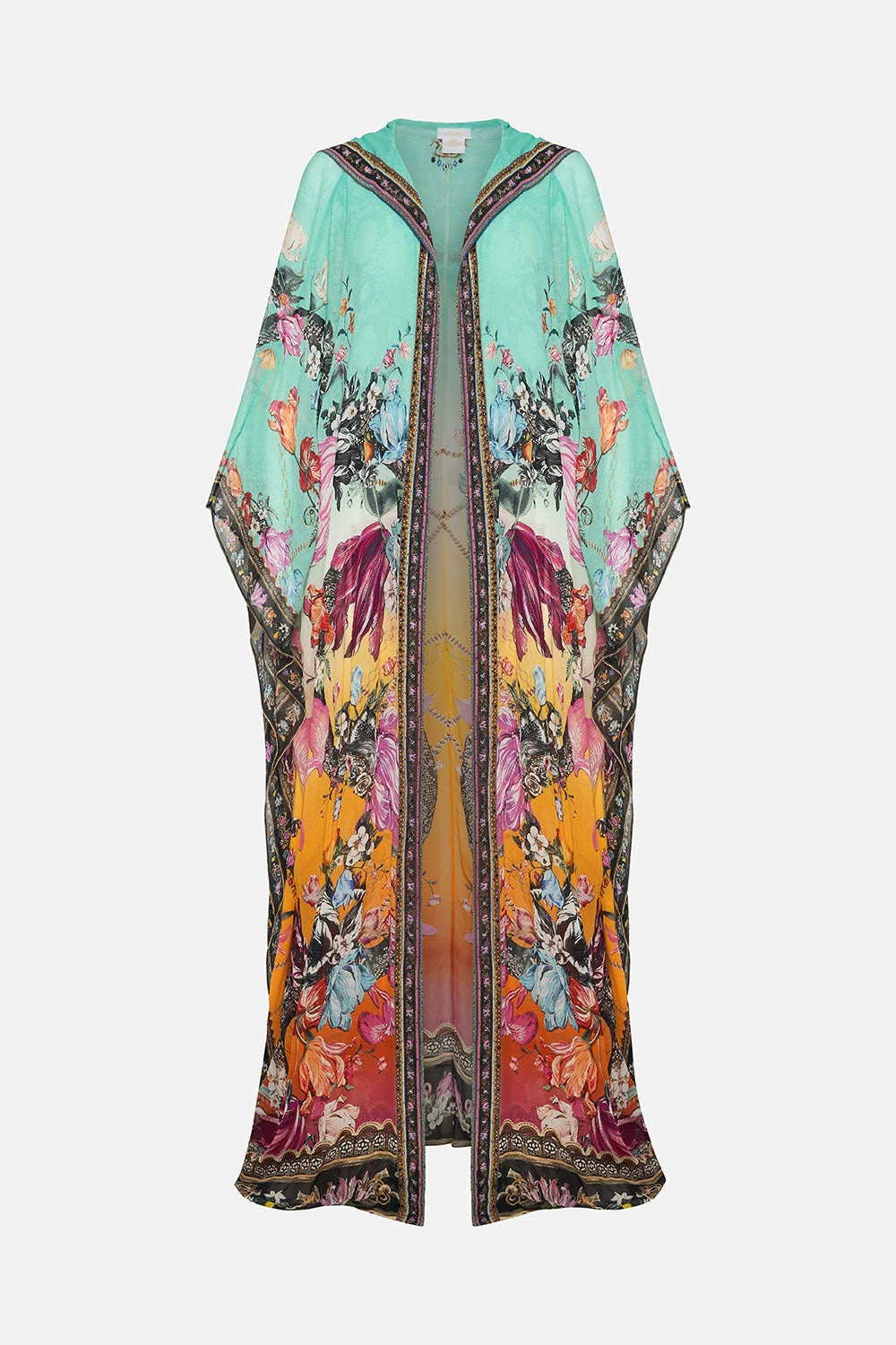 An elixir of utter ethereality and vibrant sherbet skies, the Viper Room Oversized Robe captures a sea of teal and sunset tones adorning blush botanicals, gold chain indulgence and the fierce silhouette of the snake in rich hues. Finished with hand-embellished CAMILLA crystals, this luxury silk robe features a statement drape sleeve, a shaped maxi silhouette and a decadent contrasting neckband.
