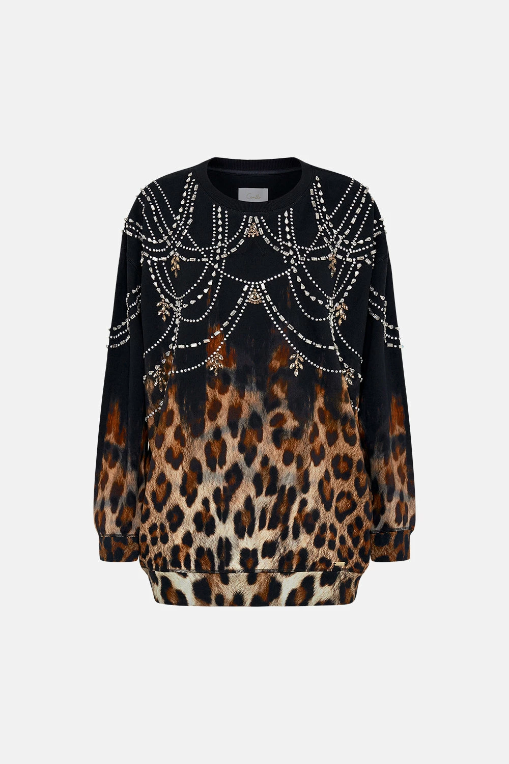 The Jungle Dreaming Oversized Sweater is a tantalising vision of wild animal and tribal inspired geo patterns melding in amongst an arrangement of glimmering chains, charms and topaz highlights. Adorning hand-embellished crystals, this luxury cotton sweater features a rounded neckline, drop shoulders, ribbed accents and a relaxed longline silhouette. Lovingly handcrafted and designed in Australia, explore more from The Moral Of The Story: Act II collection.